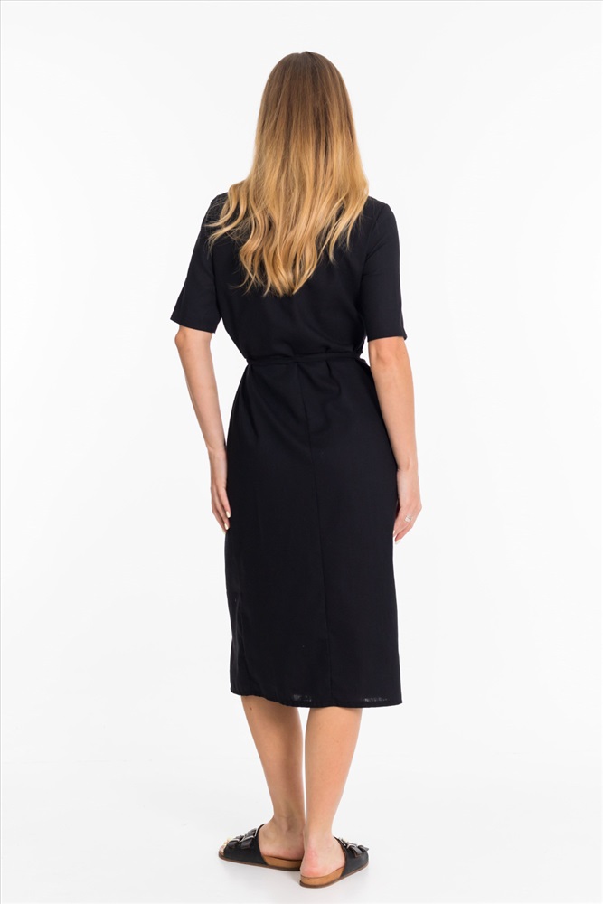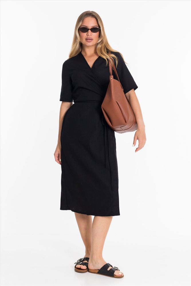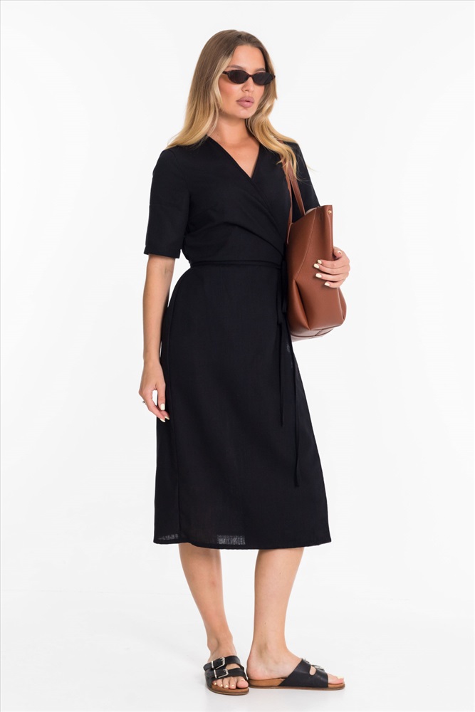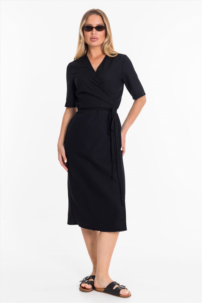 Платье длиной миди выполнено из натурального льна с вискозой. Платье с коротким втачным рукавом и запахом на завязках из шнура.