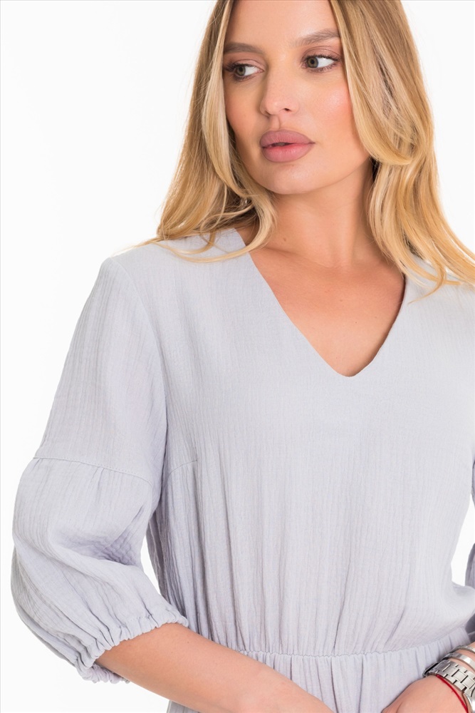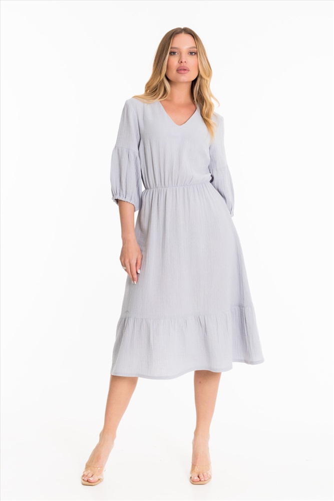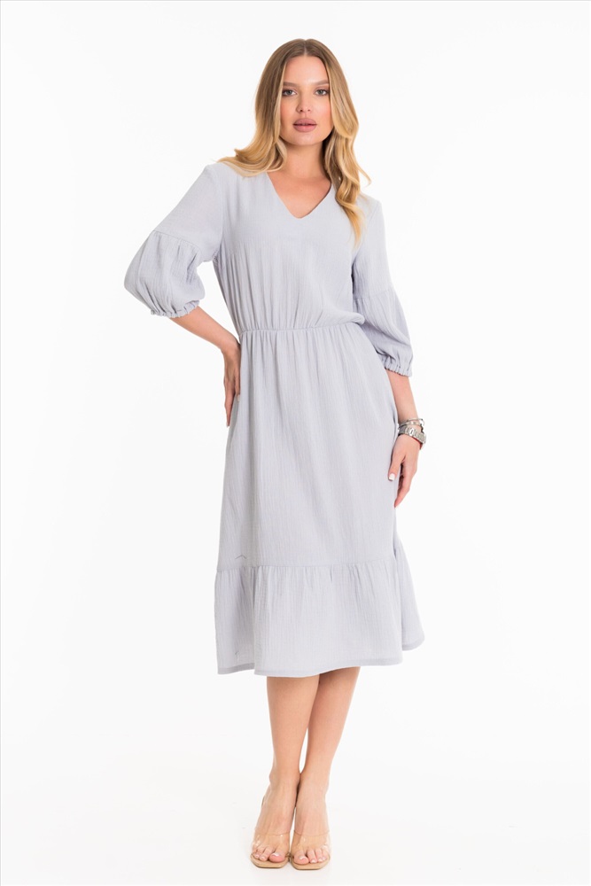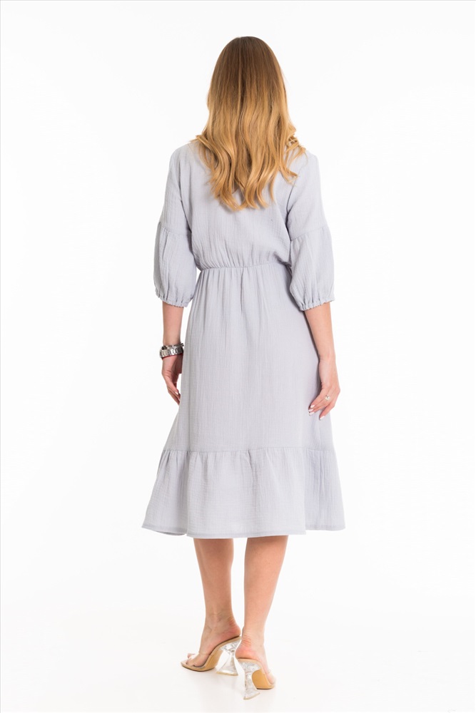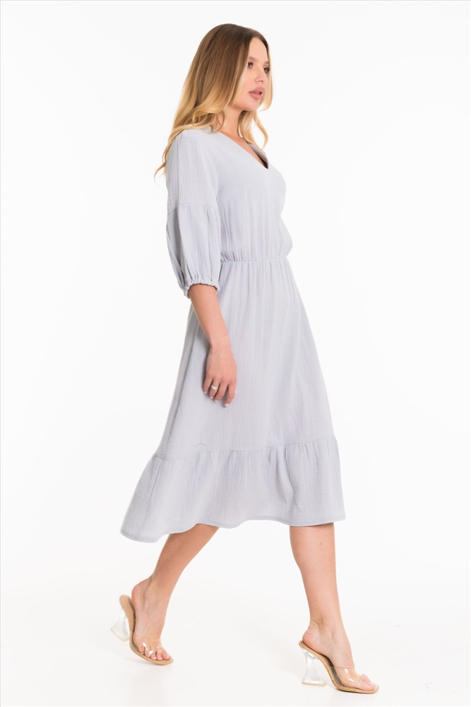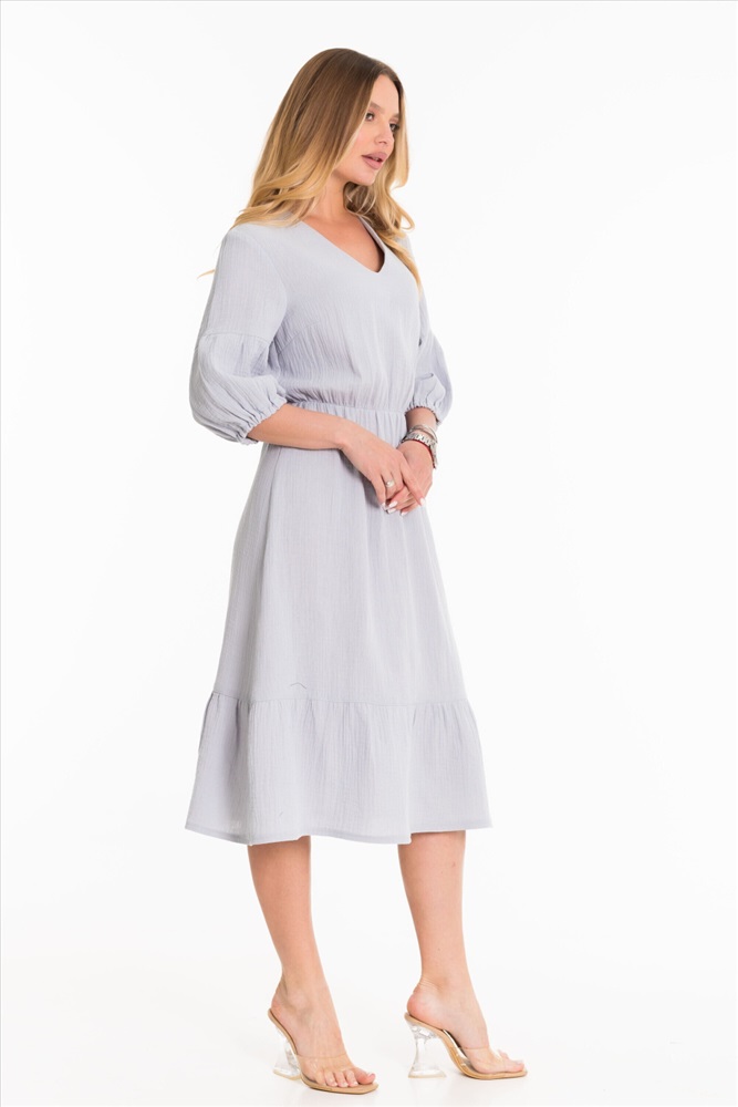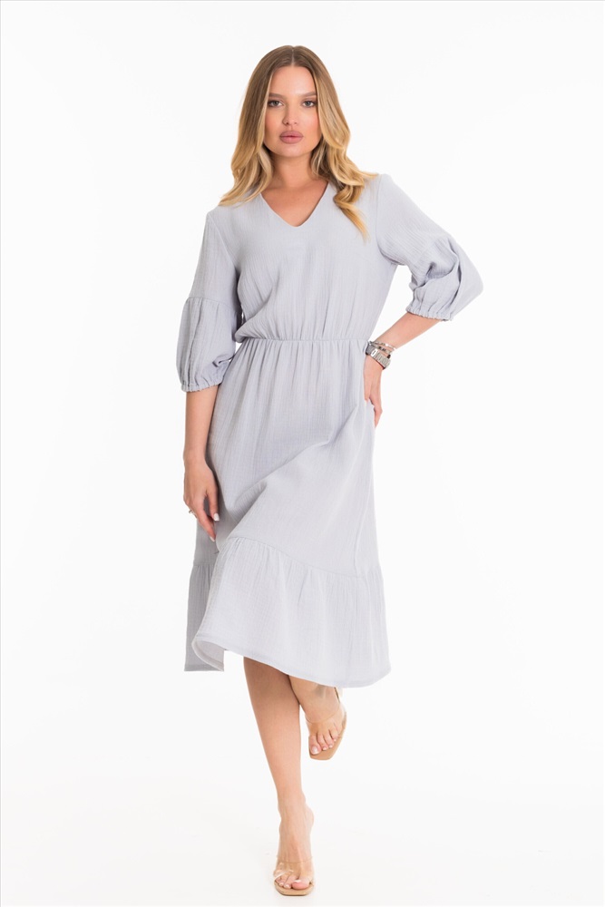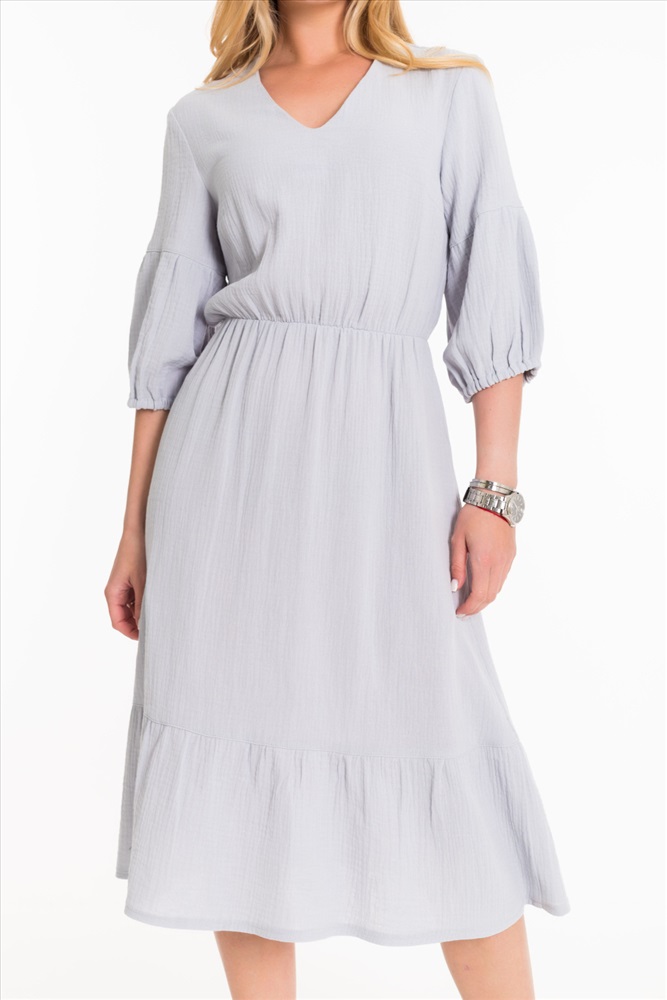 Тип длинны (для платьев): Миди Вид ткани: Муслин Сезон: Летний Состав: Хлопок 100% Цвет Номенклатуры: серо-голубой Платье выполнено из однотонного муслина серо-голубого цвета. Рукав втачной с отрезной нижней частью в виде фонарика. Горловина с V-образным вырезом, юбка визу с широкой оборкой. Комментарии к товару