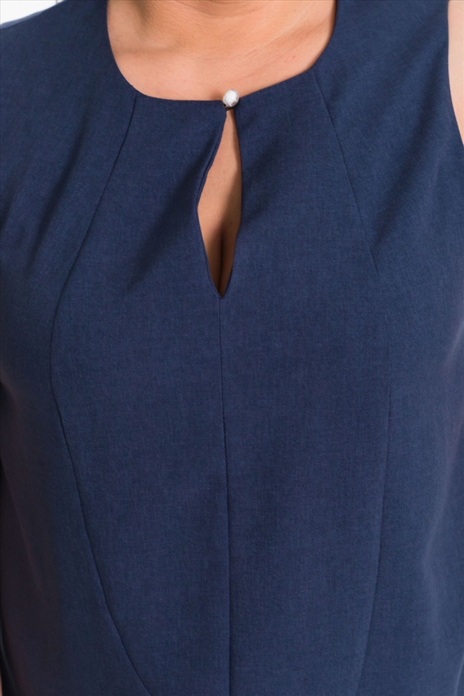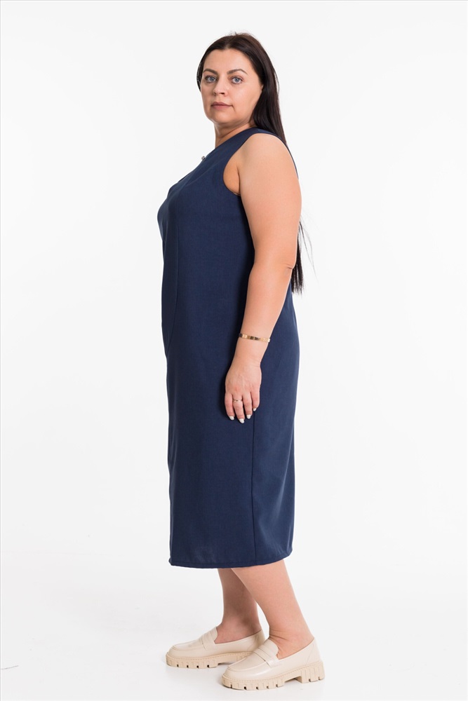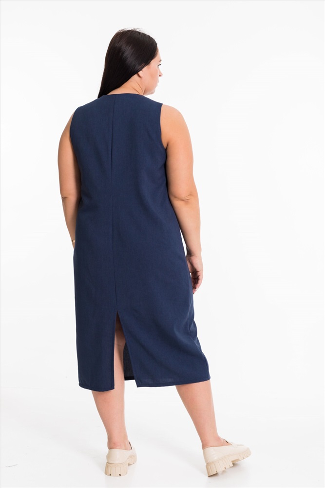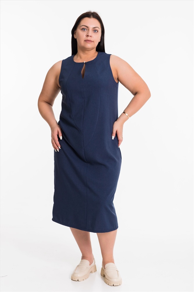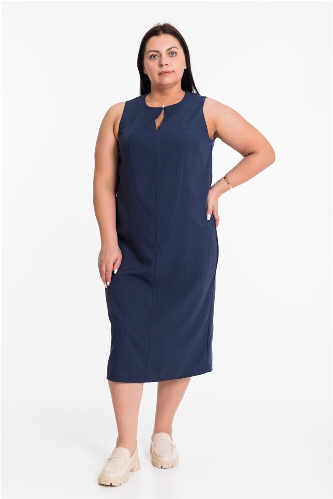 Тип длинны (для платьев): До колена Вид ткани: Лен искусственный Сезон: Летний Состав: Полиэстер 100% Цвет Номенклатуры: синий Элегантное платье миди из искусственного льна - отличный выбор для тёплого сезона. Лаконичный силуэт без рукавов подчёркивает фигуру, а фигурные рельефы визуально вытягивают силуэт. Аккуратный вырез-капля с декоративной пуговицей добавляет изюминку образу. Комментарии к товару