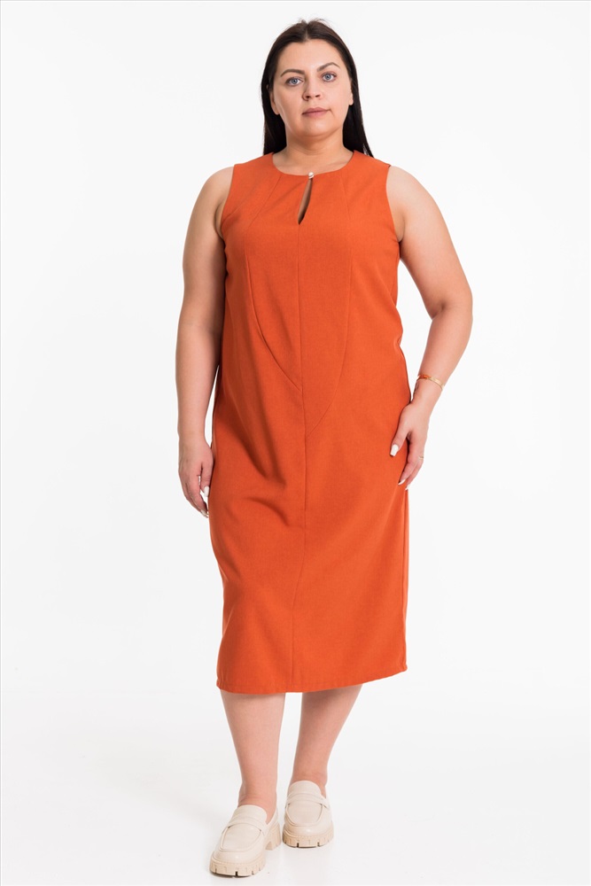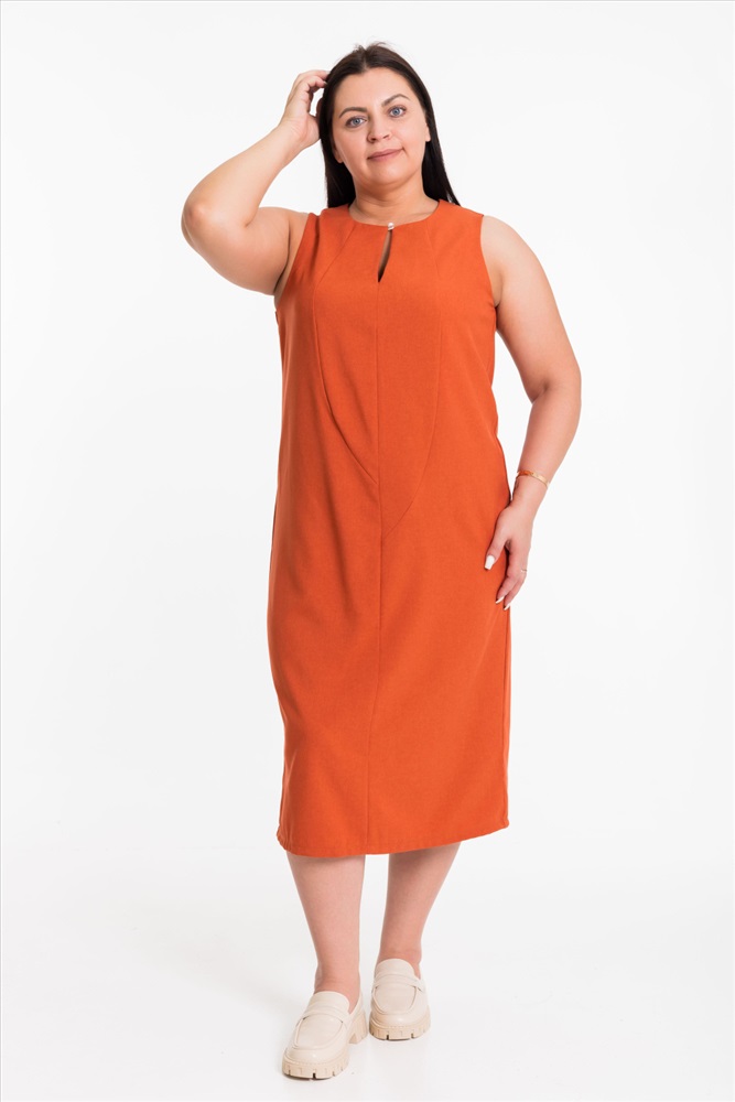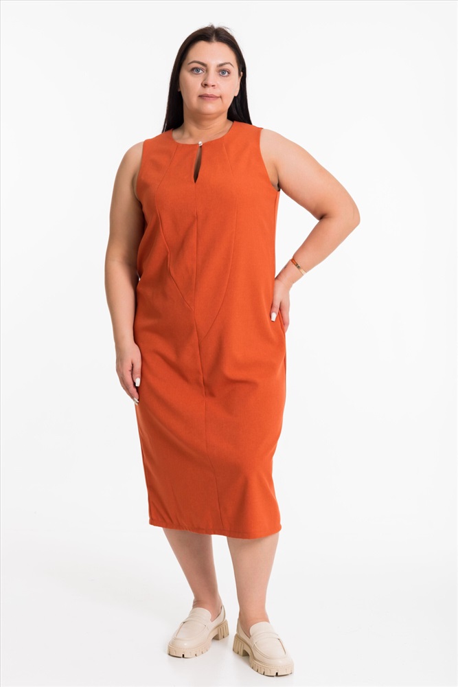 Элегантное платье миди из искусственного льна - отличный выбор для тёплого сезона. Лаконичный силуэт без рукавов подчёркивает фигуру, а фигурные рельефы визуально вытягивают силуэт. Аккуратный вырез-капля с декоративной пуговицей добавляет изюминку образу.