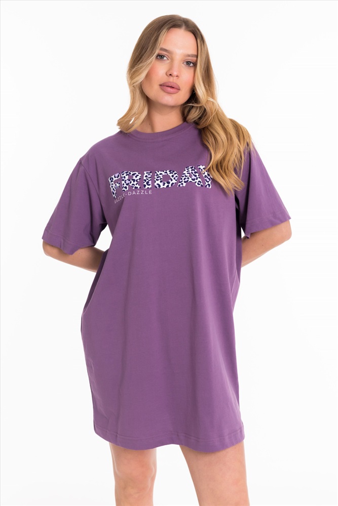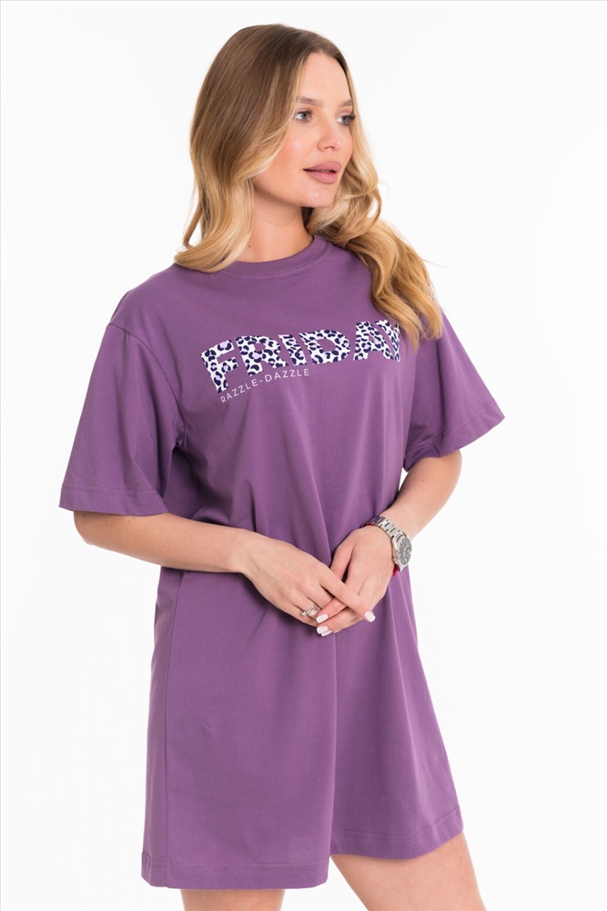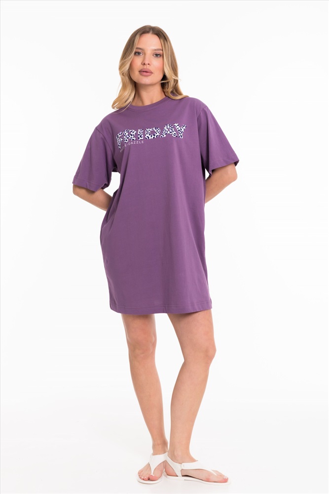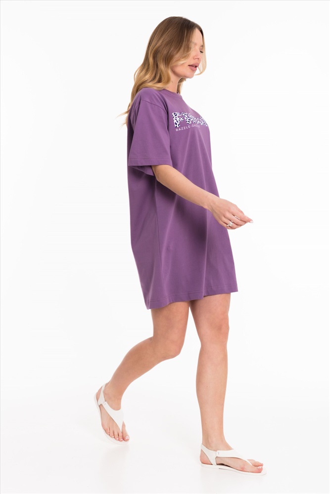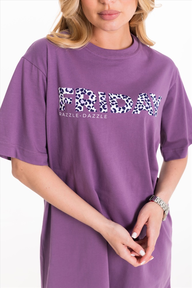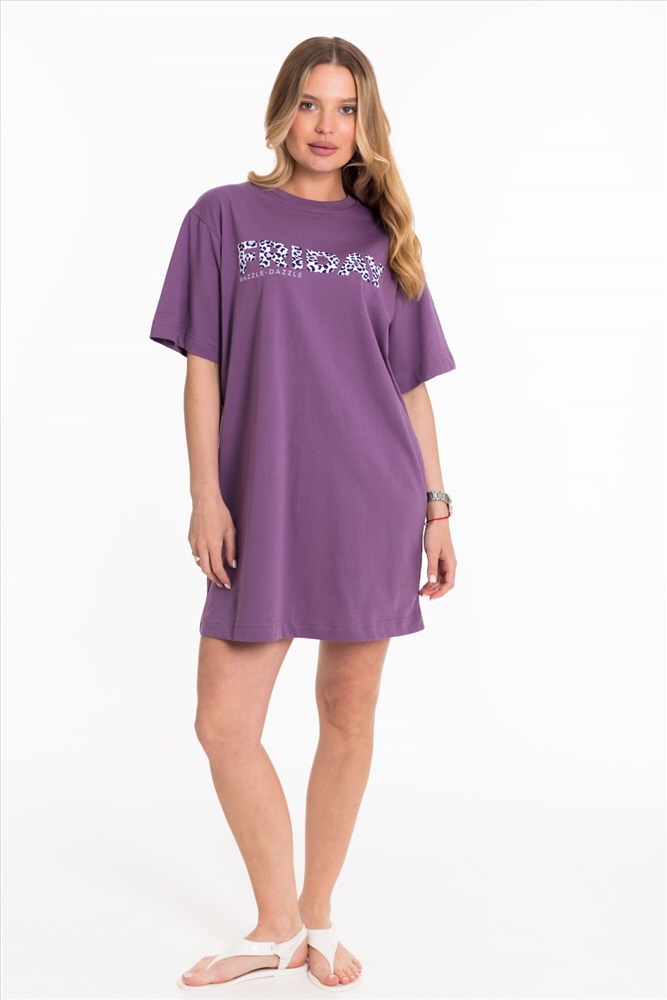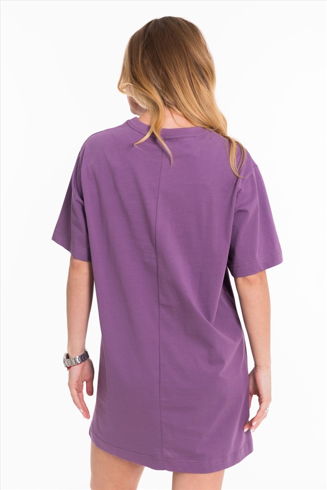 Тип длинны (для платьев): Мини Вид ткани: Кулирка Сезон: Всесезонный Состав: Хлопок 100% Цвет Номенклатуры: лиловый Платье свободного силуэта выполнено из однотонной кулирки. С коротким рукавом и принтом спереди. Круглый вырез горловины оформлен планкой. Комментарии к товару