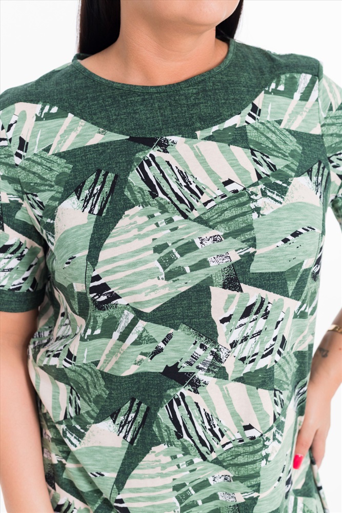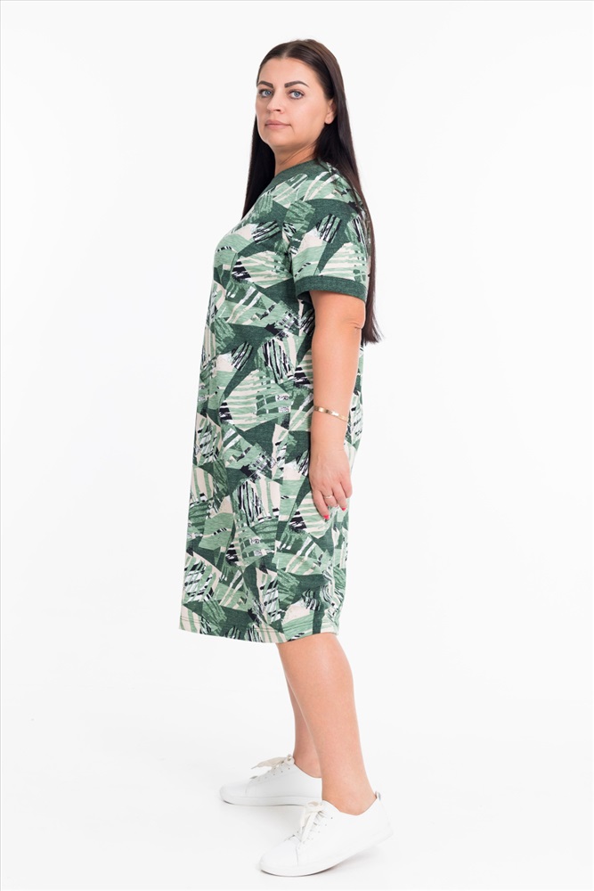 Платье выполнено из кулирки с набивным рисунком с отделкой однотонными планками по круглому вырезу горловины и низу рукавов.