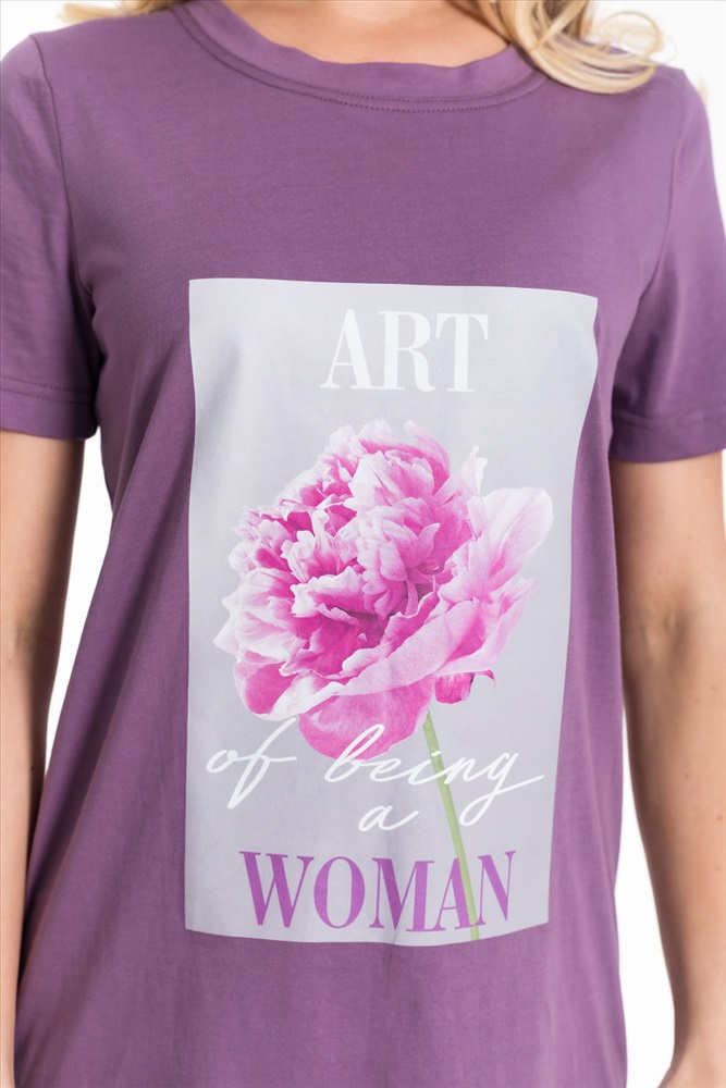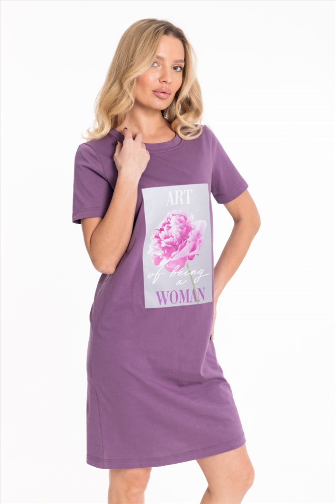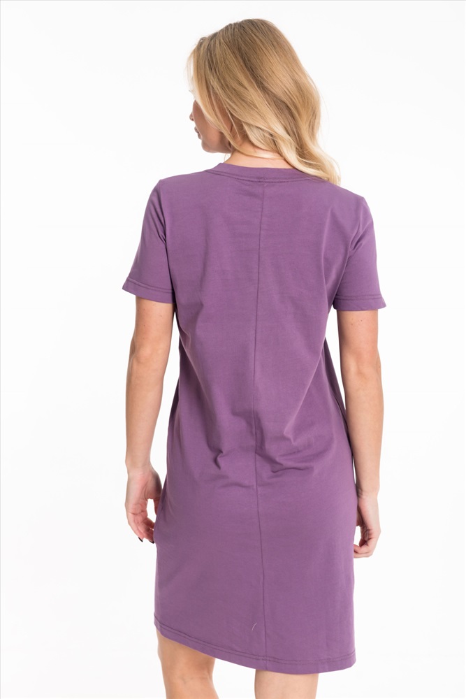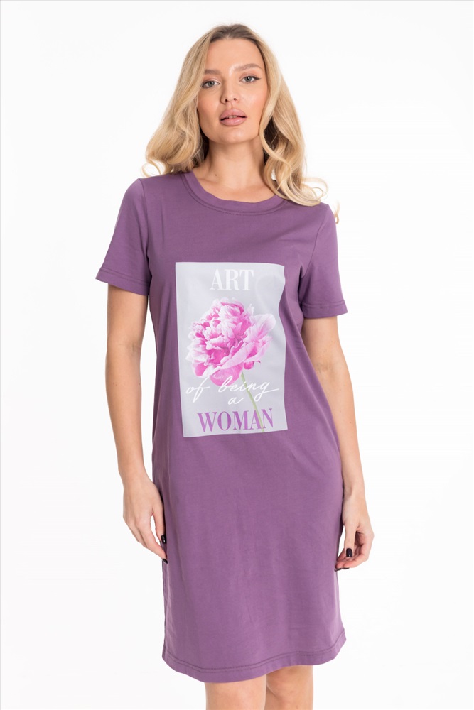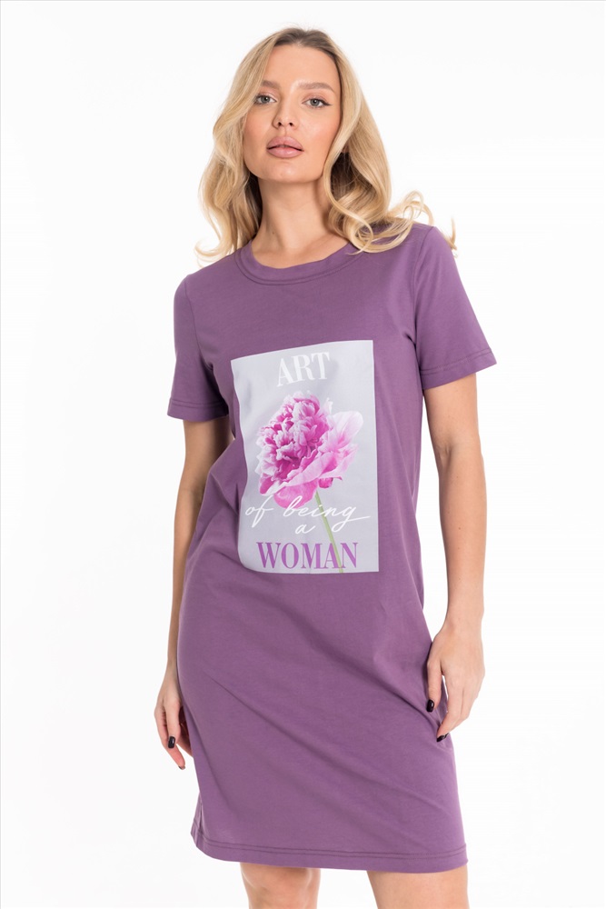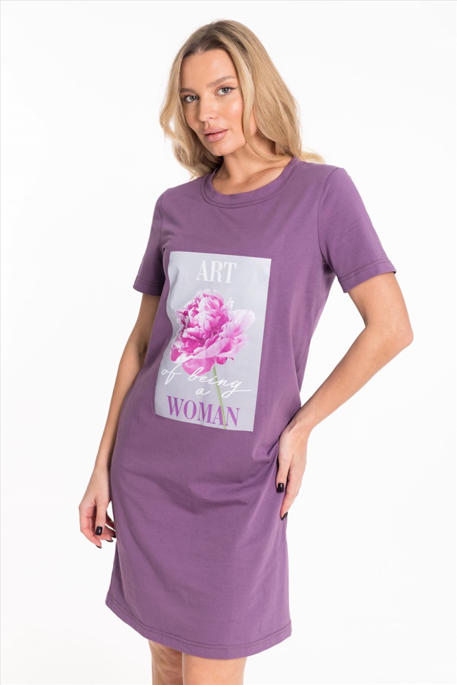 Тип длинны (для платьев): До колена Вид ткани: Кулирка Сезон: Всесезонный Состав: Хлопок 100% Цвет Номенклатуры: лиловый Платье выполнено из хлопкового полотна. Модель прямого кроя с короткими рукавами и круглым вырезом горловины, оформленным планкой. Спереди украшено стильным принтом, что придаёт образу яркость и индивидуальность. Комментарии к товару