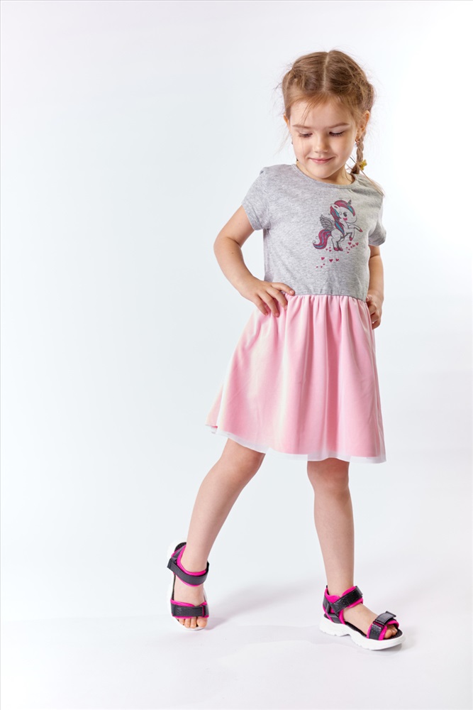 Тип длинны (для платьев): До колена Вид ткани: Кулирка Сезон: Всесезонный Состав: Хлопок 100% Цвет Номенклатуры: меланж Детское платье с принтом спереди выполнено из однотонной кулирки. Юбка с сеткой сверху, отрезная по линии талии и со сборкой. Рукава короткие, сзади застёжка на две кнопки. Комментарии к товару