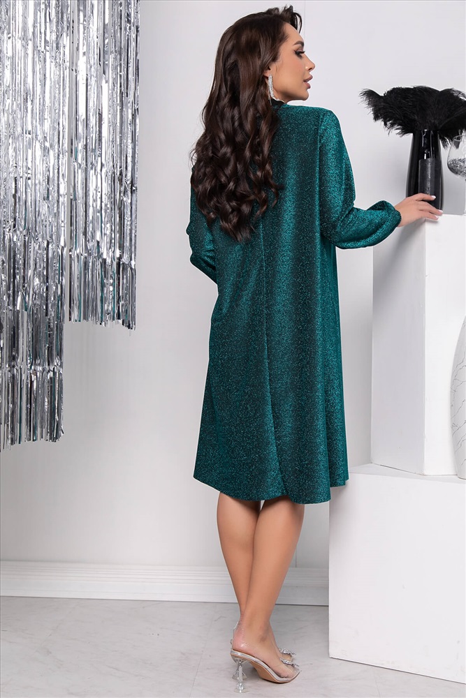Очаровательно платье из трикотажа с люрексом обязательно впишется в ваш вечерний гардероб. Модель создана для того, чтобы ее обладательница блистала! Рукав длинный, втачной, по низу на резинке. Благодаря свободному крою вы будете ощущать себя в таком платье комфортно и, в качестве приятного дополнения, изделие скроет несовершенства фигуры.