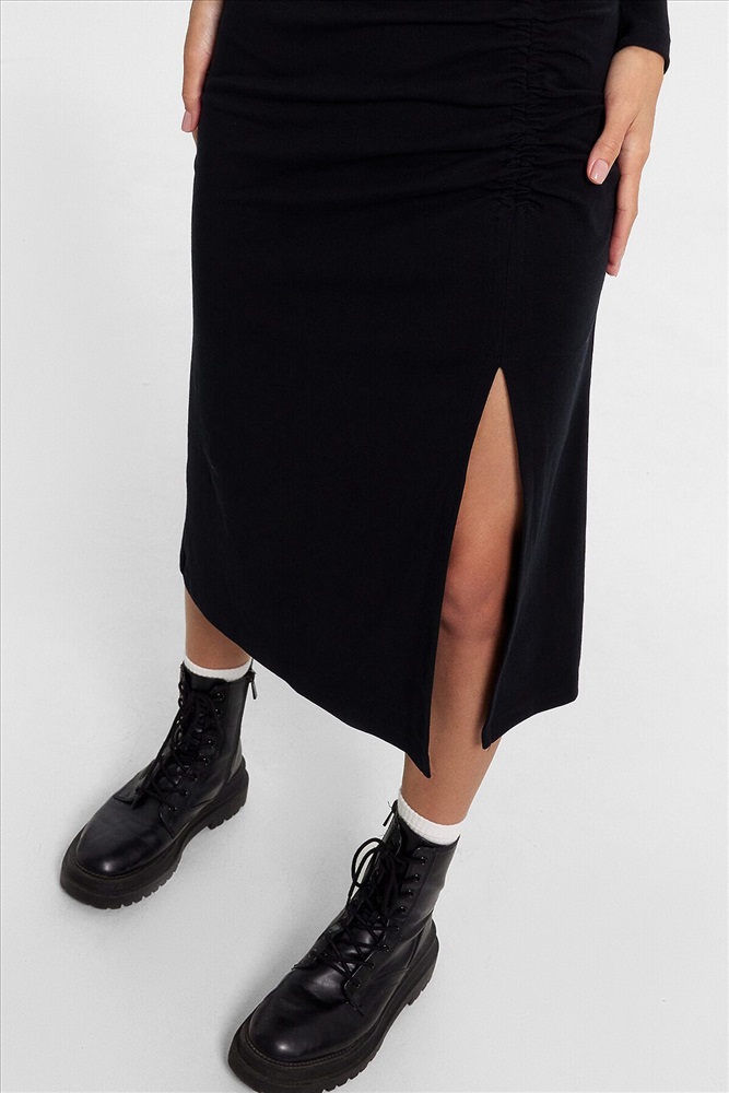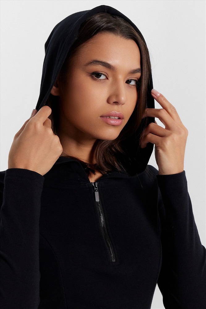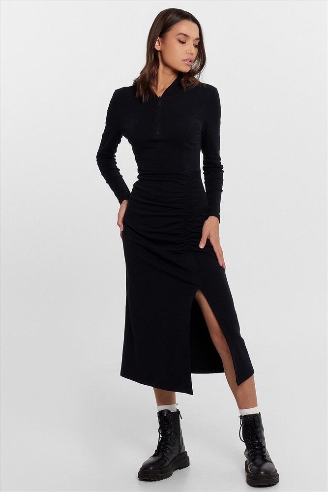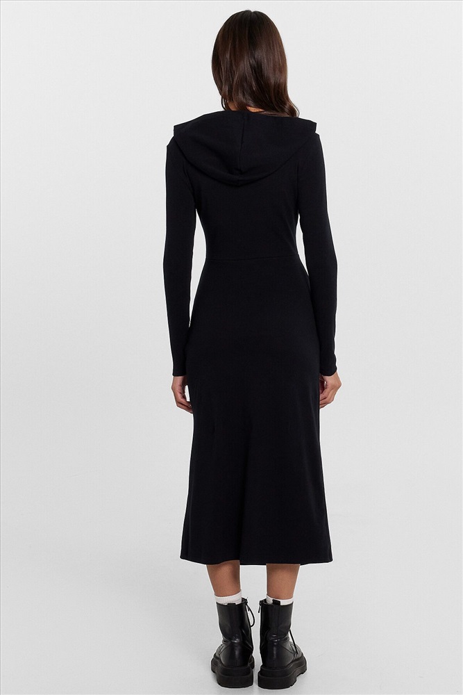 Страна производства: Беларусь Платье женское прилегающего силуэта, длиной миди. Горловина круглой формы, в горловину втачан капюшон со средним швом. Деталь переда с рельевами и центральной застежкой на молнию. Платье отрезное по талии. Рукав втачной, длинный, узкий. Низ платья прямой, со сборкой по рельефу на эластичную тесьму (жилка 6мм WT4-6) и разрезом по низу. Усилитель разреза- лента репсовая шир.7мм, SFLR-2. Нижний срез полатья и рукавов обработан швом вподгибку.