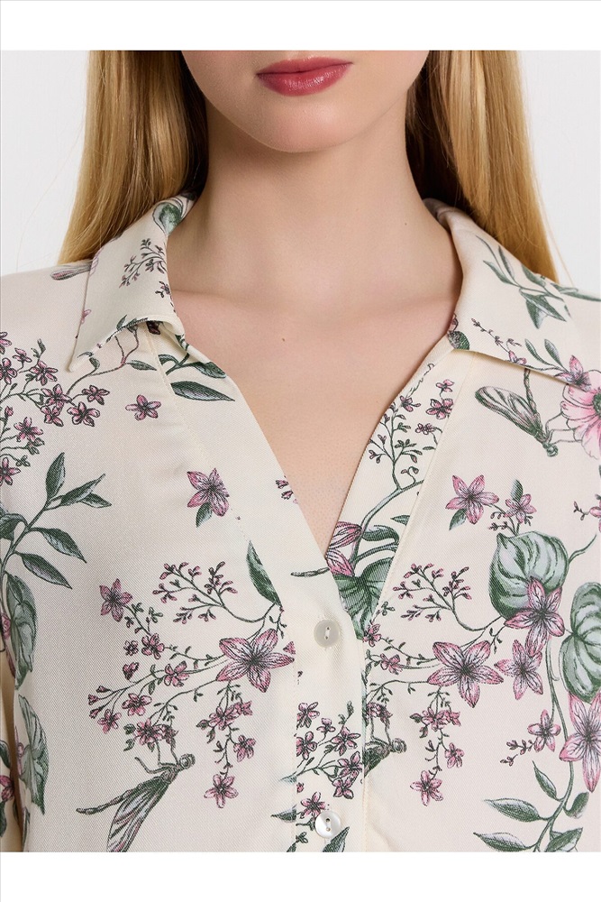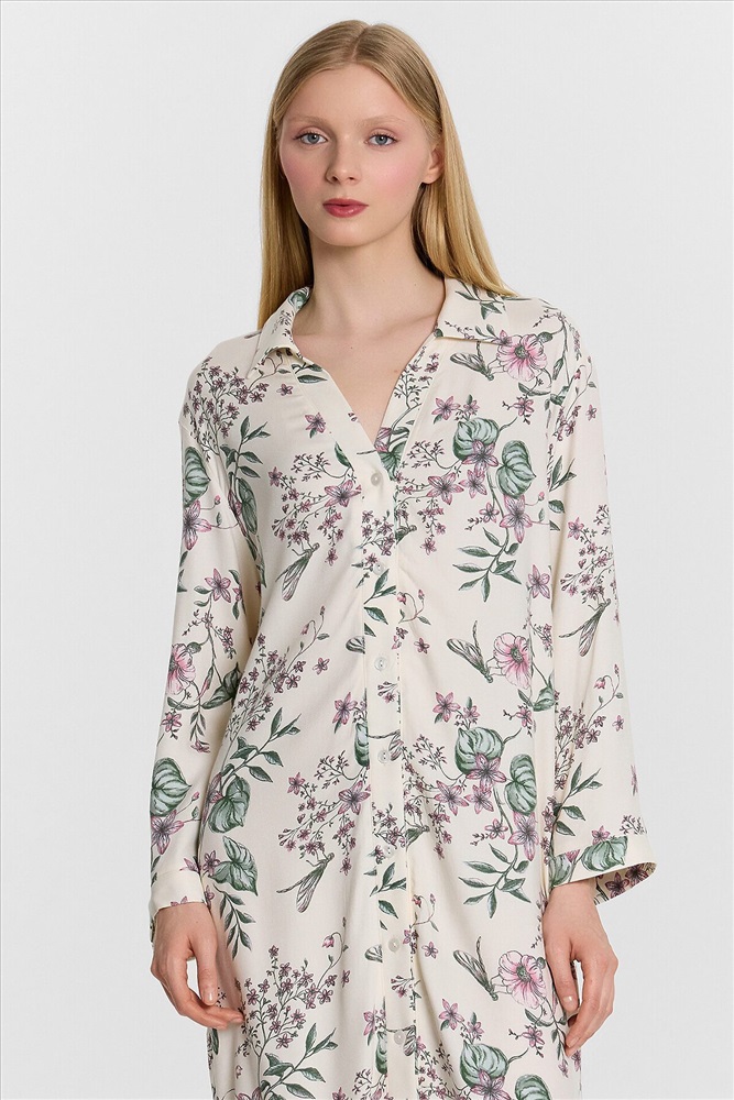 Платье женское домашнее прямого силуэта. Перед с центральной застежкой и отрезной планкой на пуговицах . Горловина V-образной формы, в горловину втачан воротник отложной. Рукав 7/8 укорочен, втачной. По низу рукава отрезная манжета. Нижний срез платья обработан швом вподгибку. Платье длиной ниже колена, в боковых швах обработаны разрезы.