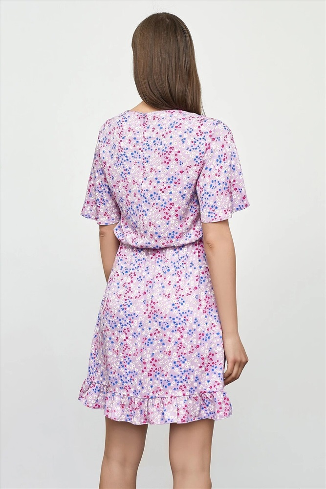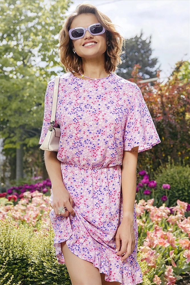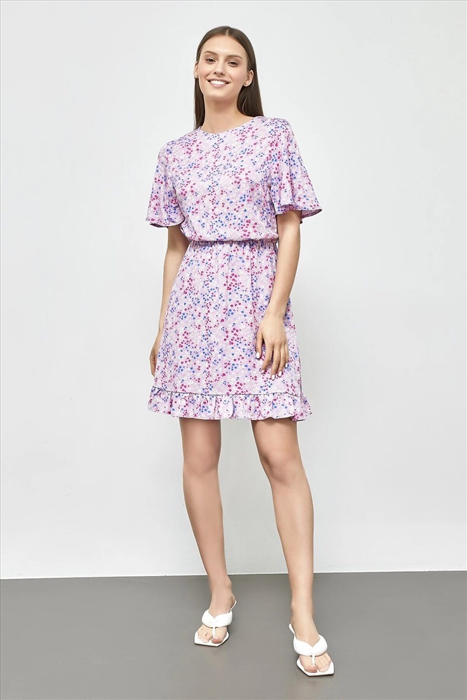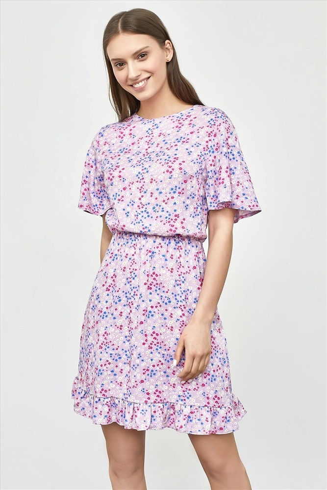 Страна производства: Белоруссия Женское полуприлегающее платье длиной выше колена из нежной и легкой вискозы. Модель отрезная по талии, внутри пояса проходит эластичная тесьма, образующая сборочки. Горловина круглая, рукава короткие и расширенные к низу. Нижний край платья украшен рюшей. На спинке застегивается на потайную молнию. Стильное платье для ваших летних образов!