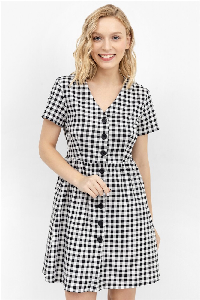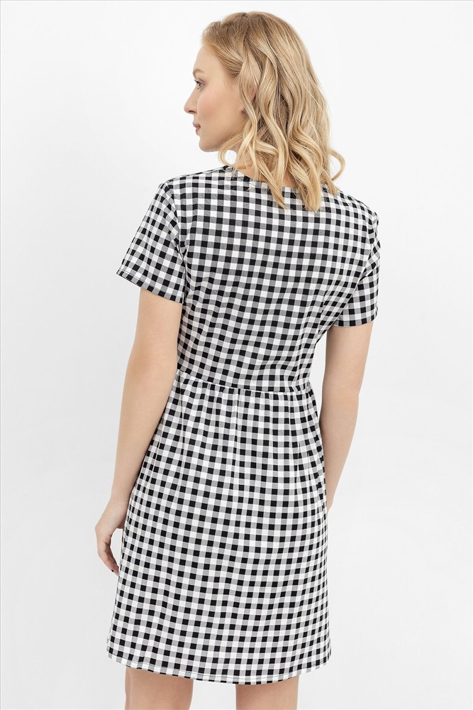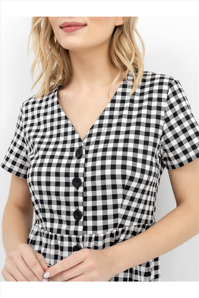 Страна производства: Белоруссия Текстильное платье из натуральных льна и хлопка. Силуэт модели полуприлегающий, длина выше колена. Спереди – центральная планка с пуговицами. Вертикальные вытачки подчеркивают достоинства фигуры. Рукава короткие, вырез горловины клинообразный. На талии – небольшие сборочки. Романтичный вариант для летних образов!