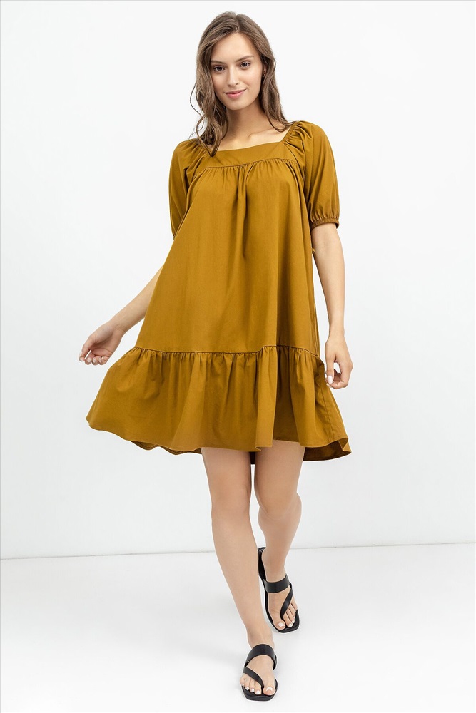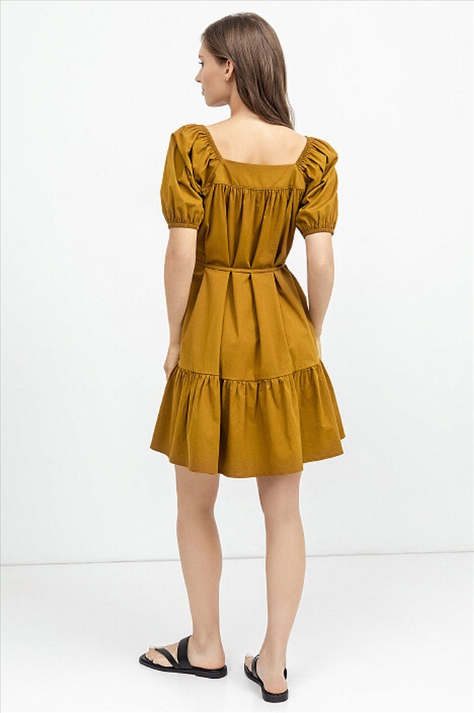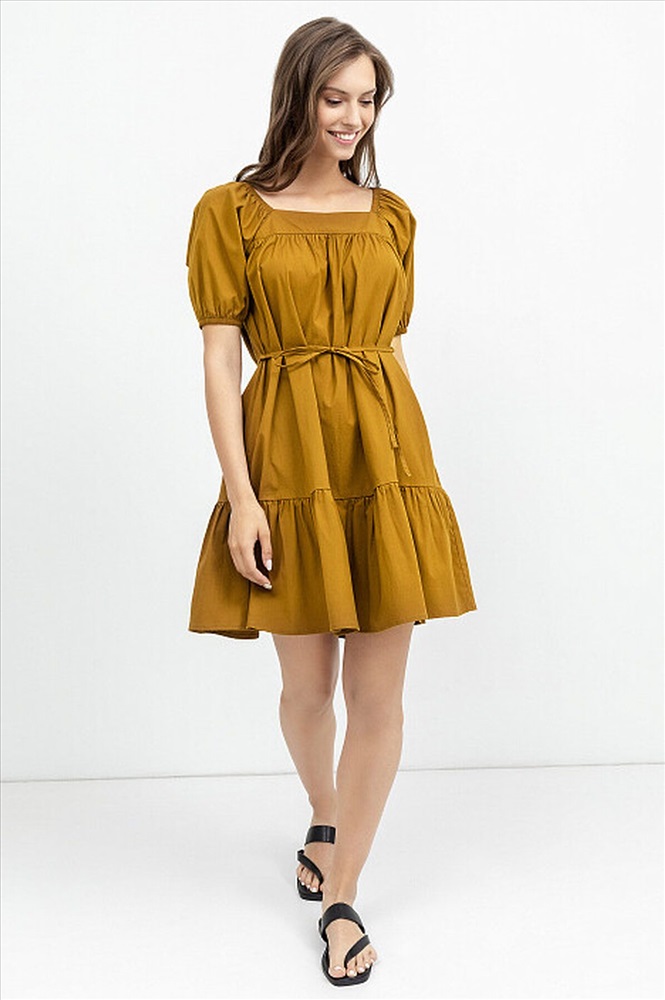 Платье А-силуэта из ткани поплин. Вырез горловины каре. Рукав короткий, окат и низ рукава присборены на резинку. Низ платья рисширяется к низу. Платье с поясом из основного полотна. По низу платья присбореная отрезная рюша. Длина платья выше колена."