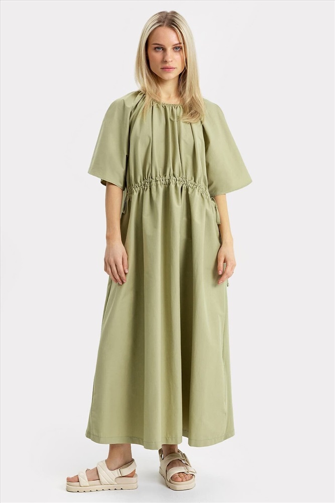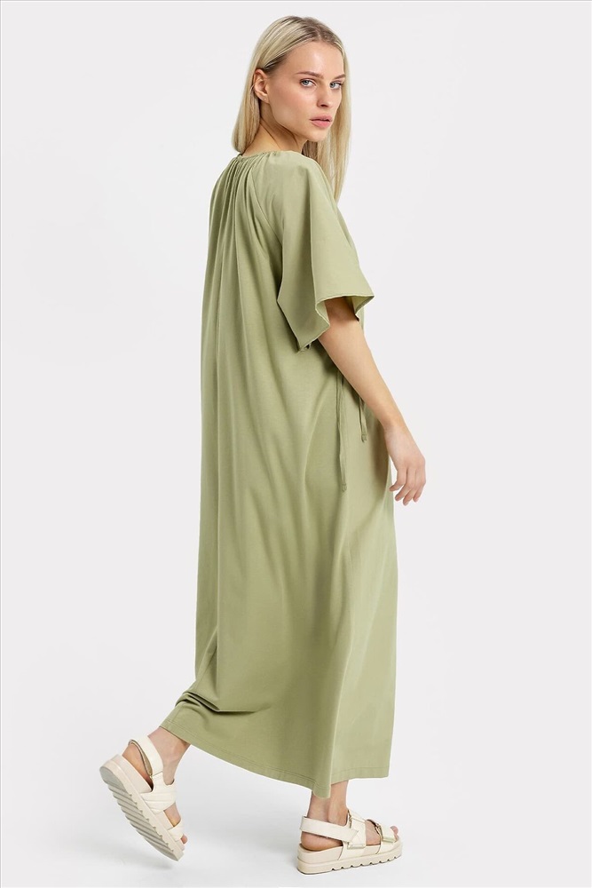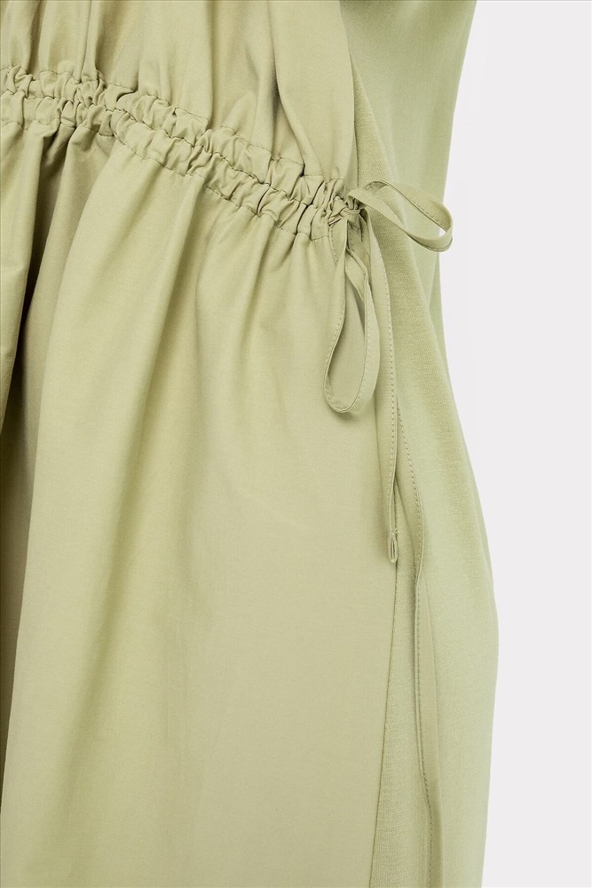ID товара: 891966 Состав: 65% Хлопок, 19% Модал, 13% Полиэстер, 3% Эластан Сезон: Весна/Лето Рукав: короткие Вид застежки: Без застежки Вырез горловины: Круглый Тип карманов: Без карманов Декоративные элементы: Кулиска Конструктивные элементы: кулиска Покрой: свободный Уход: Деликатная стирка при 30 градусах Фактура материала: Тканое полотно Страна бренда: Беларусь Страна производства: Белоруссия Платье женское свободного силуэта из ткани и трикотажного полотна кулирки. Горловина круглой формы. В горловину вставлена эластичная тесьма, которая образует сборку. Рукав-реглан из ткани расширяется к низу. Передняя деталь из ткани, отрезная по талии с кулисой в которую вставлена бейка из основного полотна. Деталь спинки из кулирки, с центральным швом. Низ платья расширяется к низу. Длина платья ниже колена. Комментарии к товару