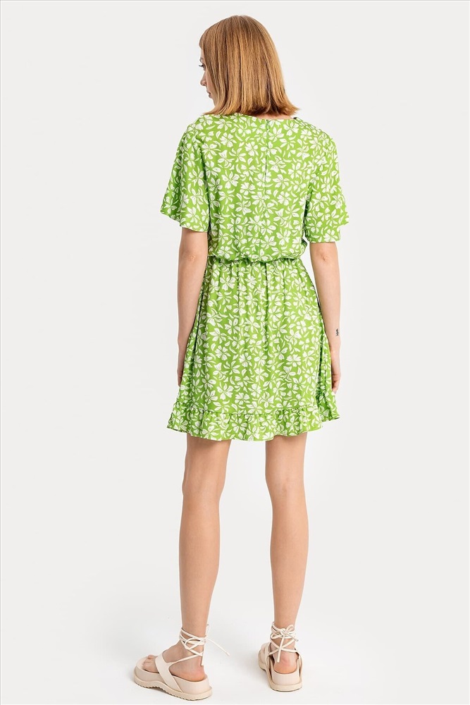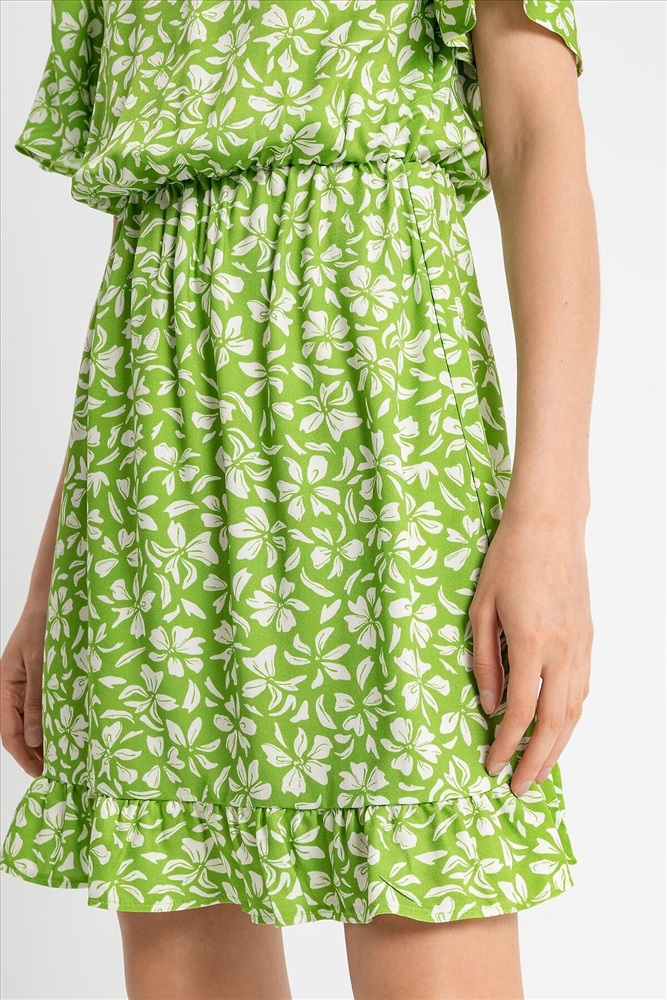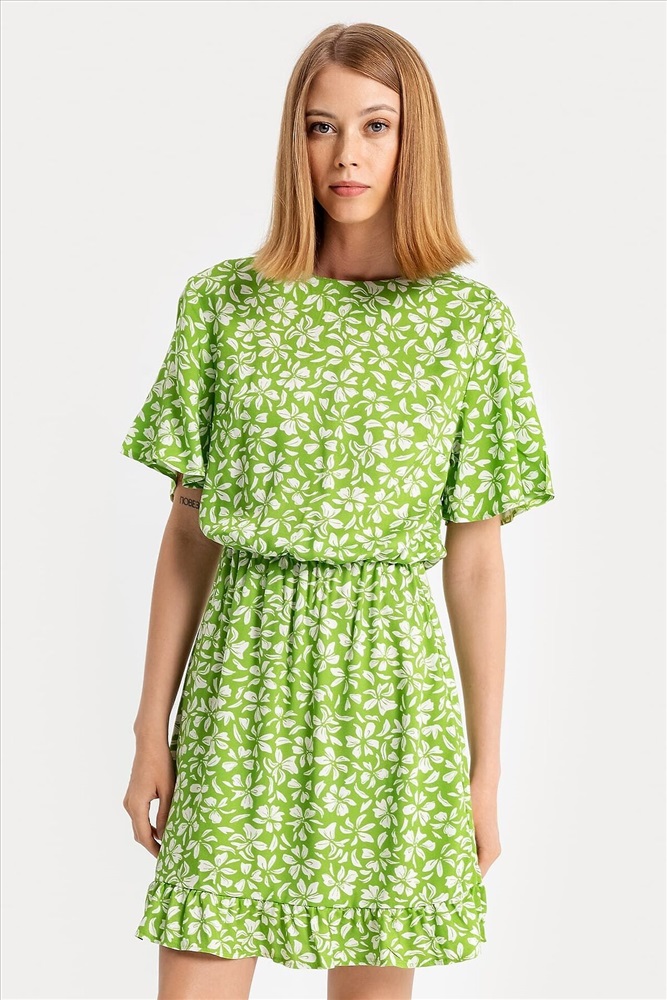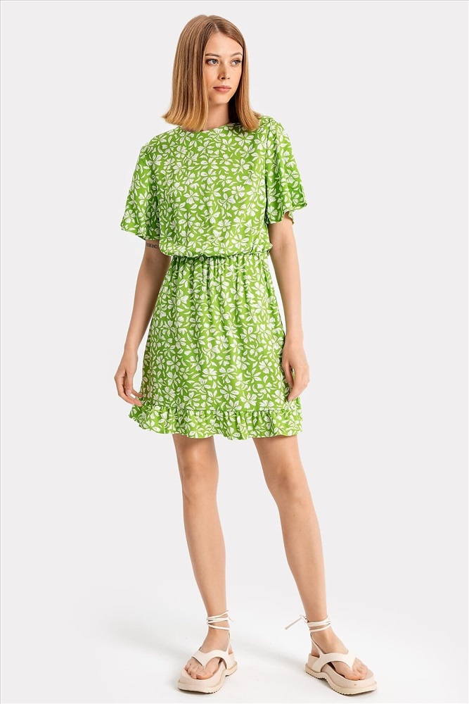 Страна производства: Белоруссия Женское полуприлегающее платье длиной выше колена из нежной и легкой вискозы. Модель отрезная по талии, внутри пояса проходит эластичная тесьма, образующая сборочки. Горловина круглая, рукава короткие и расширенные к низу. Нижний край платья украшен рюшей. На спинке застегивается на потайную молнию. Стильное платье для ваших летних образов!