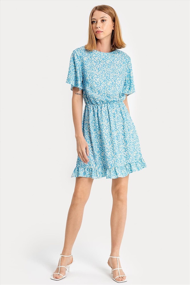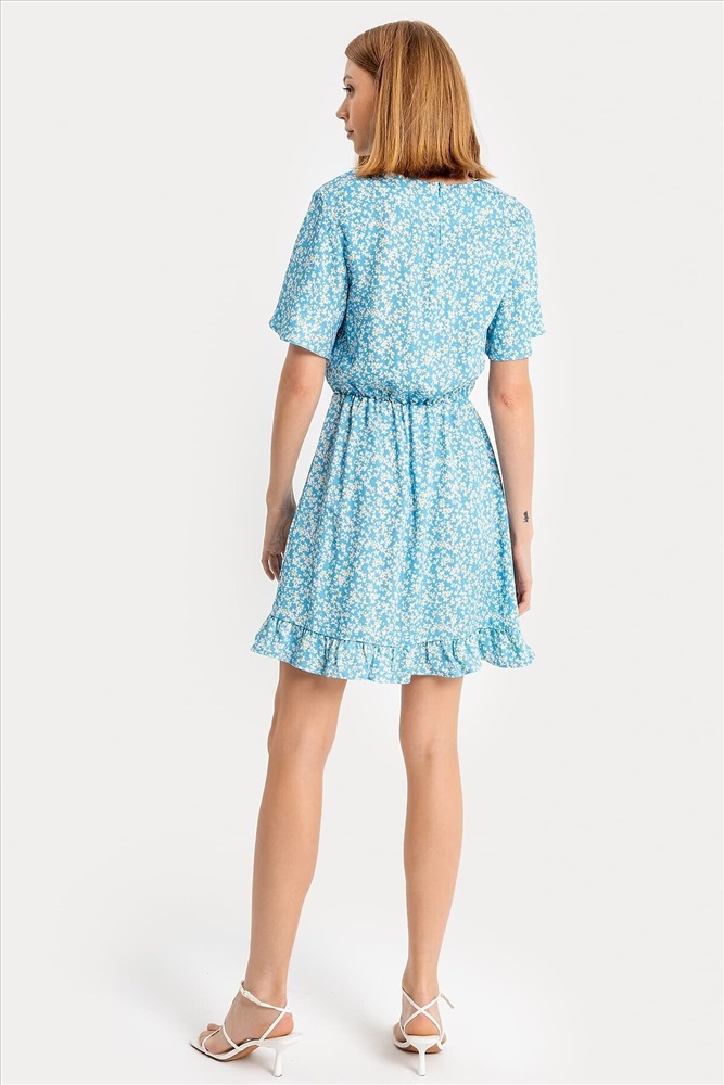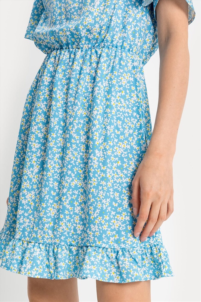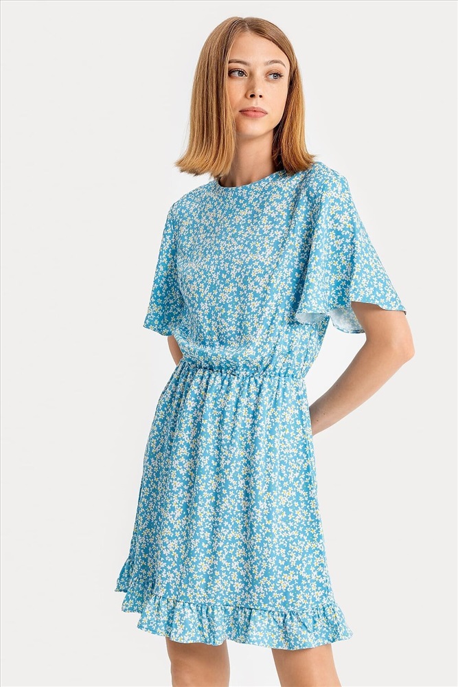 Страна производства: Белоруссия Женское полуприлегающее платье длиной выше колена из нежной и легкой вискозы. Модель отрезная по талии, внутри пояса проходит эластичная тесьма, образующая сборочки. Горловина круглая, рукава короткие и расширенные к низу. Нижний край платья украшен рюшей. На спинке застегивается на потайную молнию. Стильное платье для ваших летних образов!