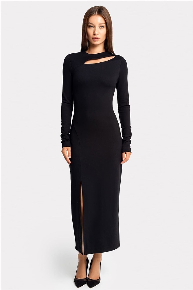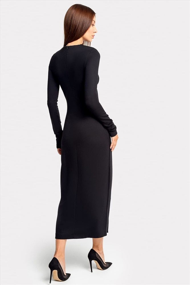 Платье женское прилегающего силуэта из трикотажного полотна интерлок. Деталь переда с отрезной фигурной кокеткой и фигурным вырезом. Горловина обработана обтачкой из основного полотна. Спинка со средним швом и застежкой на потайную молнию. Рукав втачной узкий удлиненный, по низу немного расширяется. На детали переда от бокового шва обработан рельеф с разрезом. Платье длиной макси.