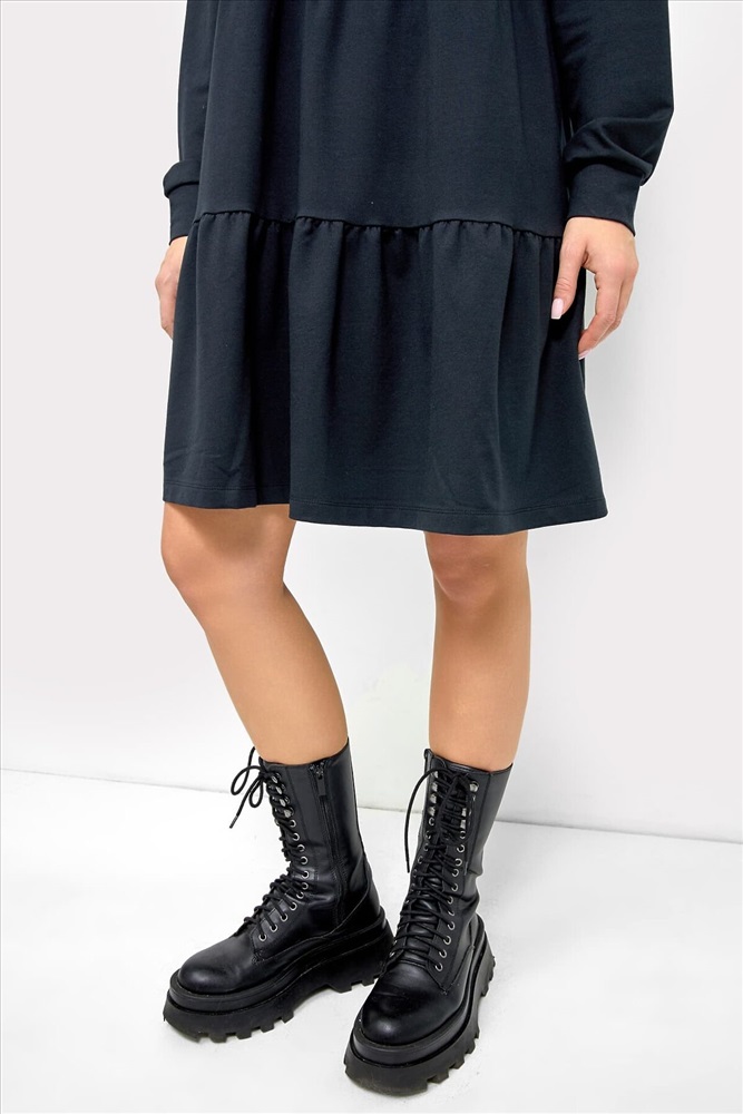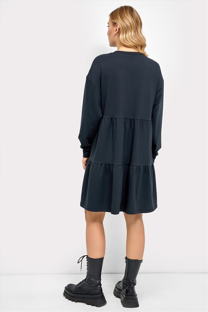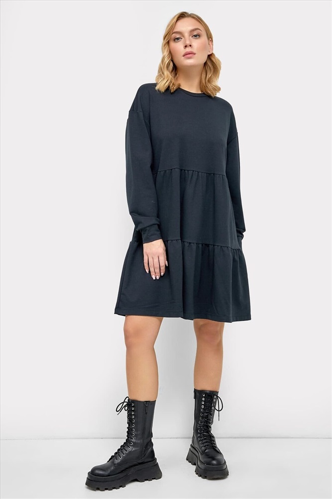 Ультрамодное женское платье А-силуэта из легкого трикотажного футера. Длина мини, выше колена. Вырез классический, круглый, не глубокий. Спущенная линия плеча и углубленные проймы дарят свободу движений. Рукава длинные, на манжетах. Нижняя часть платья состоит из двух ярусов со сборками. Красиво!