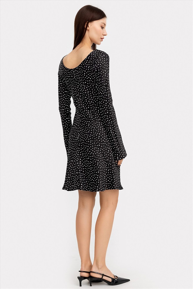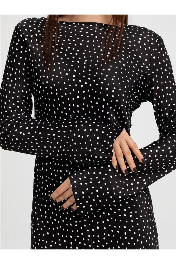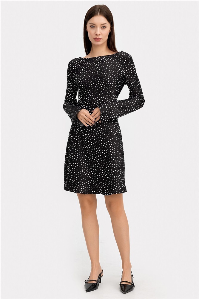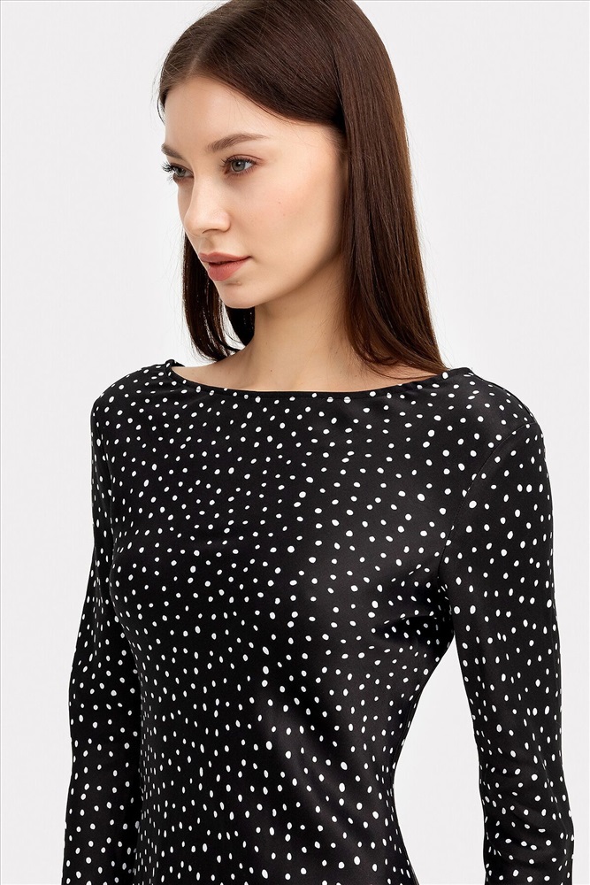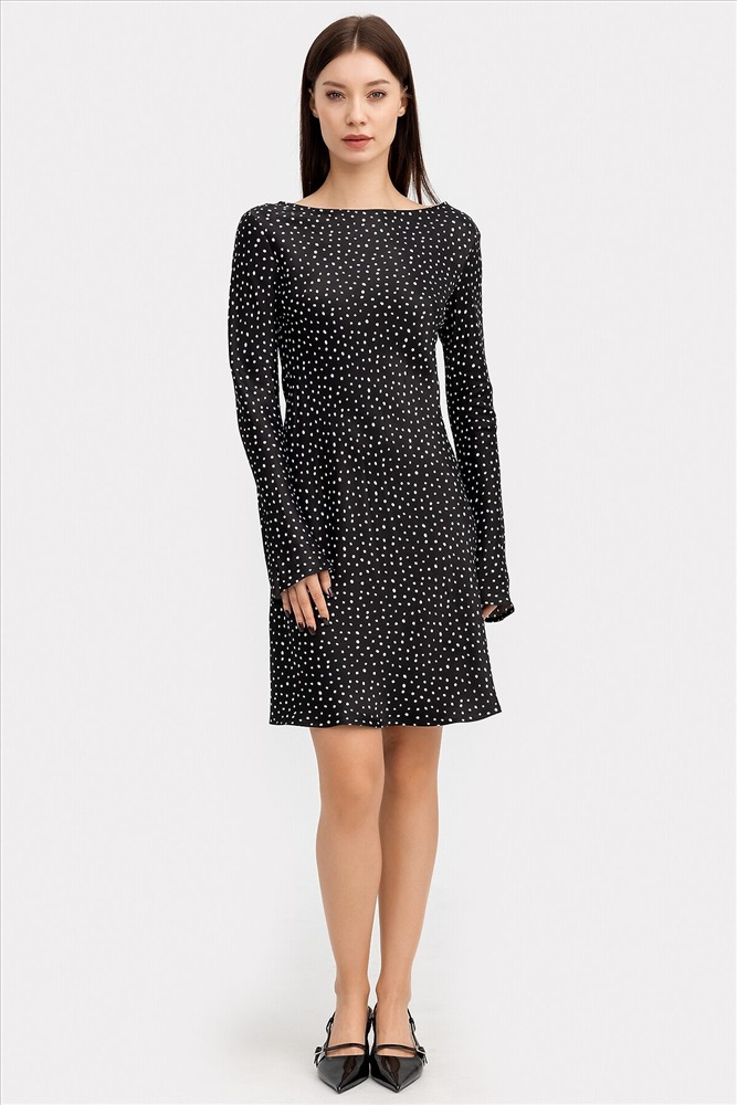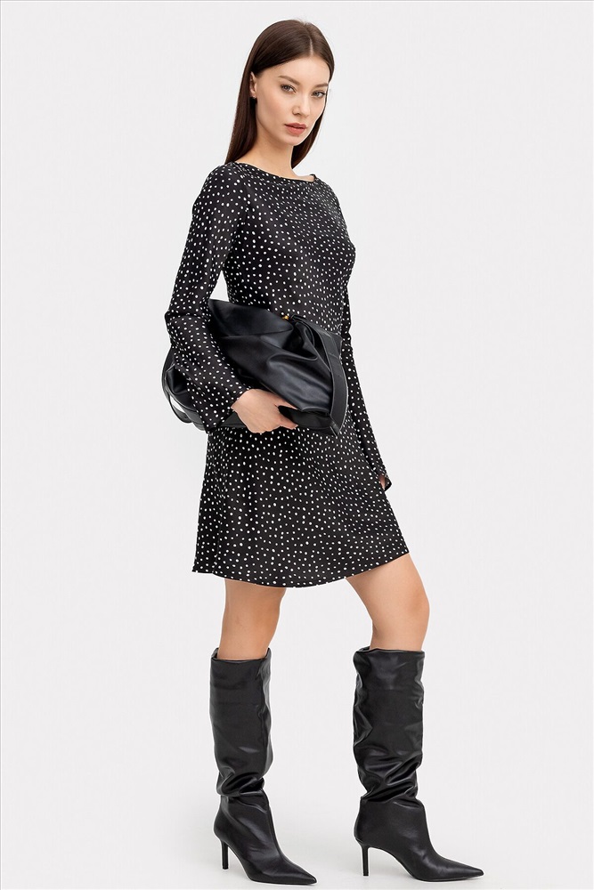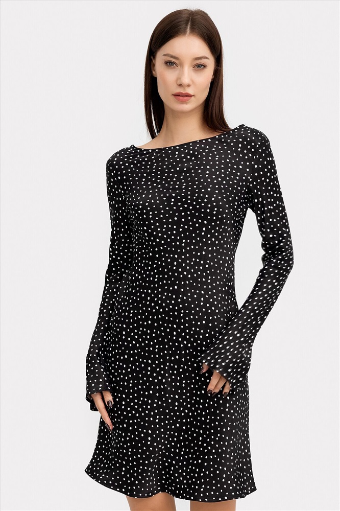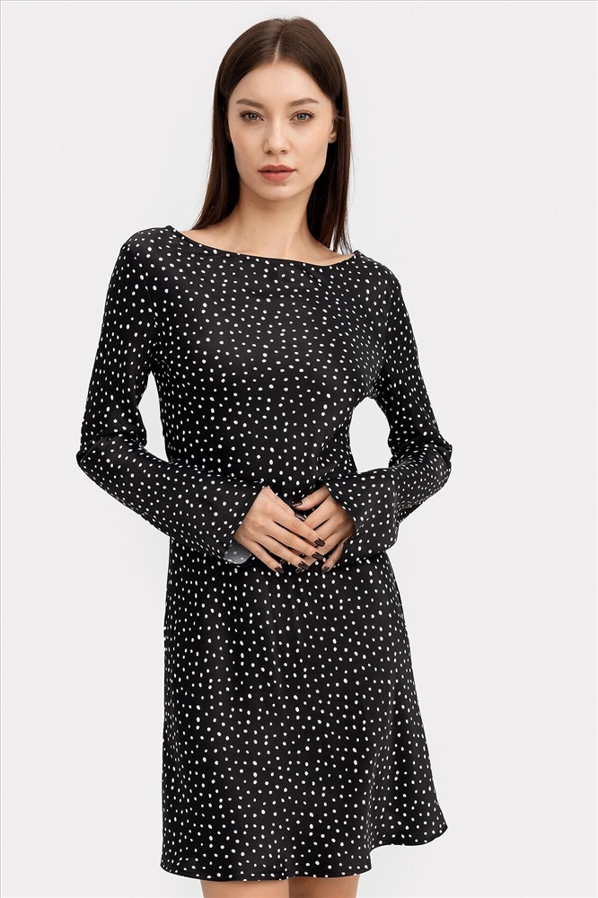 Страна производства: Белоруссия Платье женское полуприлегающего из ткани. Платье скроено по косой. Горловина округлой формы, горловина окантована бейкой из основного полотна в чистый край. Горловина спинки более вырезана. Рукав втачной длинный, к низу рукав расширяется. Платье длиной выше колена.