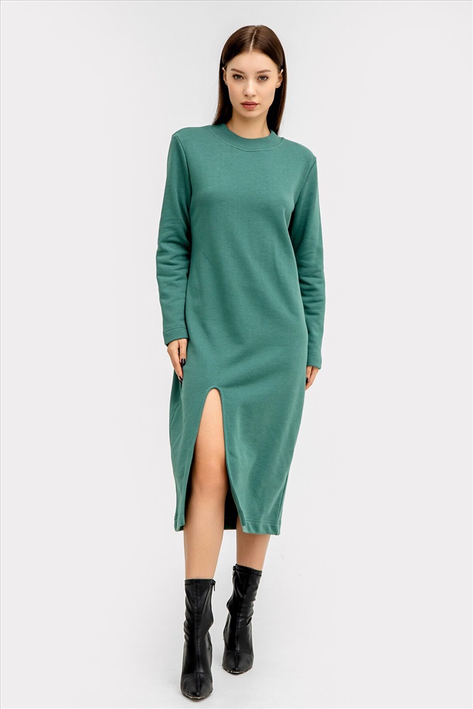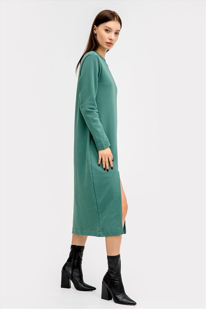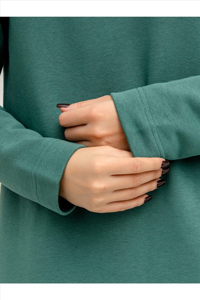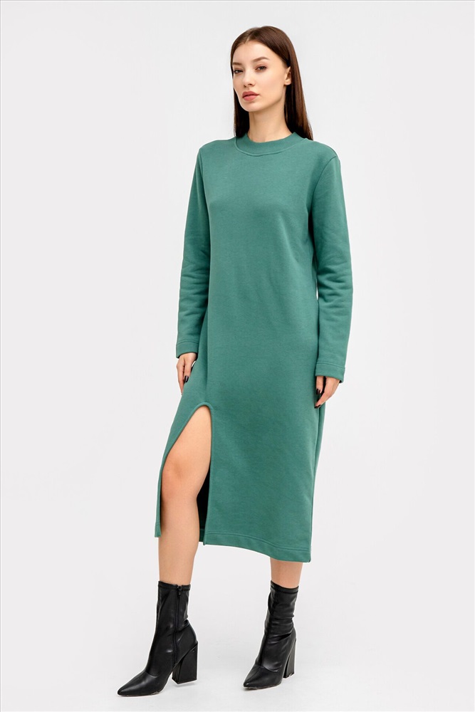 Страна производства: Белоруссия Платье женское прямого силуэта из трикотажного полотна футер. Горловина круглой формы, обтачка горловины широкая из трикотажного полотна рибана. Рукав втачной, длинный. На передней детали по низу декоративный вырез обработан бейкой из трикотажного кулирного полотна. Платье длинной ниже колена.