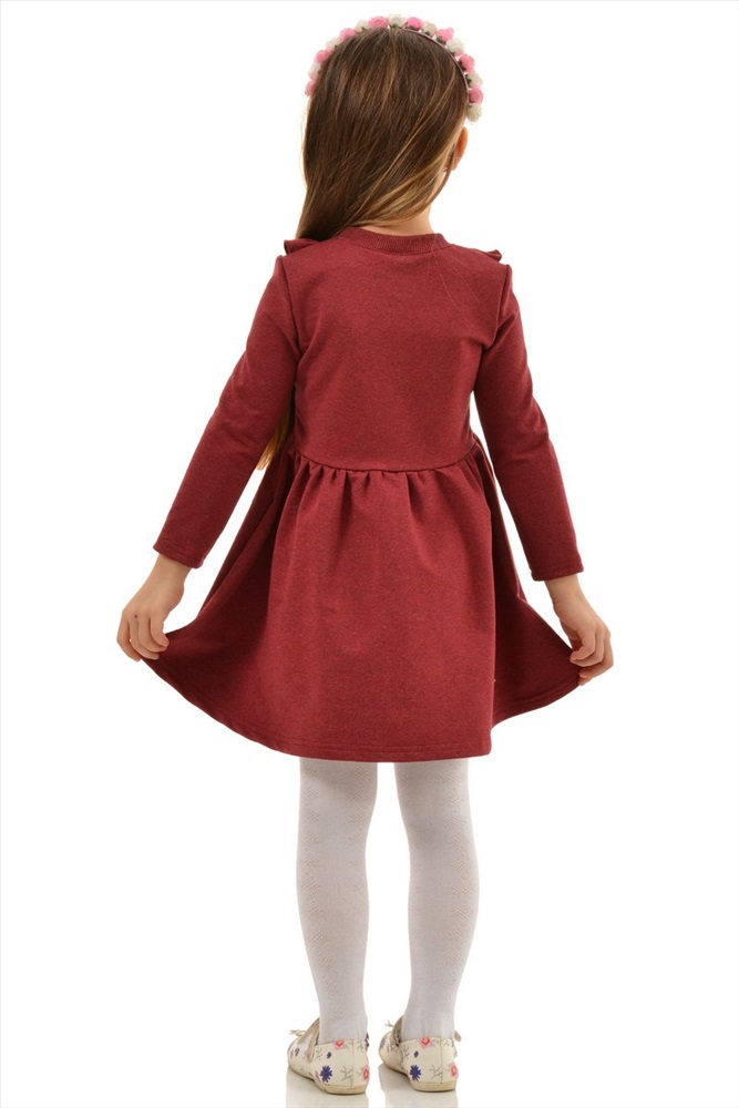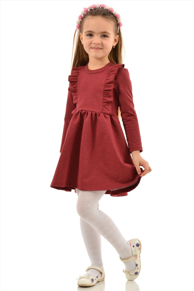 Платье для девочки дошкольной группы, из трикотажного полотна "футер". Платье полуприлегающего силуэта , отрезное по линии талии. На полочке выполнены рельефные швы с оборкой. Горловина обработана притачной обтачкой. Рукава втачные длинные, прямого покроя. Отрезная юбка "полусолнце" с легкой сборкой по линии талии. Низ изделия и рукавов обработаны швом в подгибку.