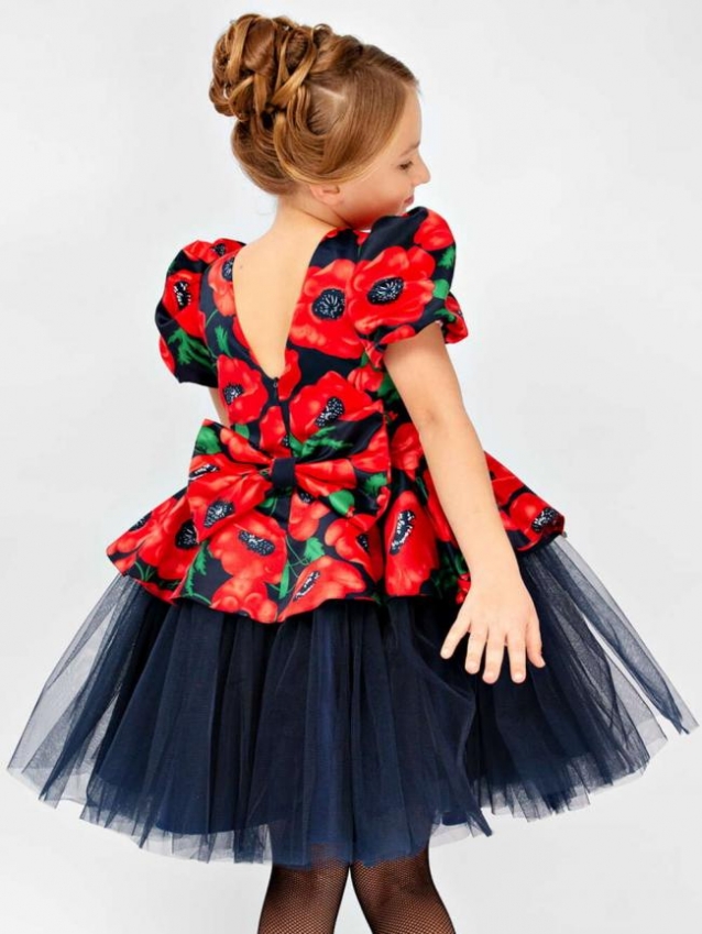 Платье для девочки СольПерец. Нарядное платье для девочки отличается особым шармом и элегантностью. Верх платья выполнен из качественной атласной ткани, которая обеспечивает комфорт и долговечность. Пышная и воздушная юбочка сделана из фатина с добавлением атласного подклада, что придаёт платью дополнительную легкость и объём. Платье застёгивается сзади на молнию, что позволяет быстро и легко одеть или снять его. Кроме того, платье дополнено съёмным бантом. Яркий принт на платье делает его идеальным выбором для праздников, торжеств и других особых случаев.