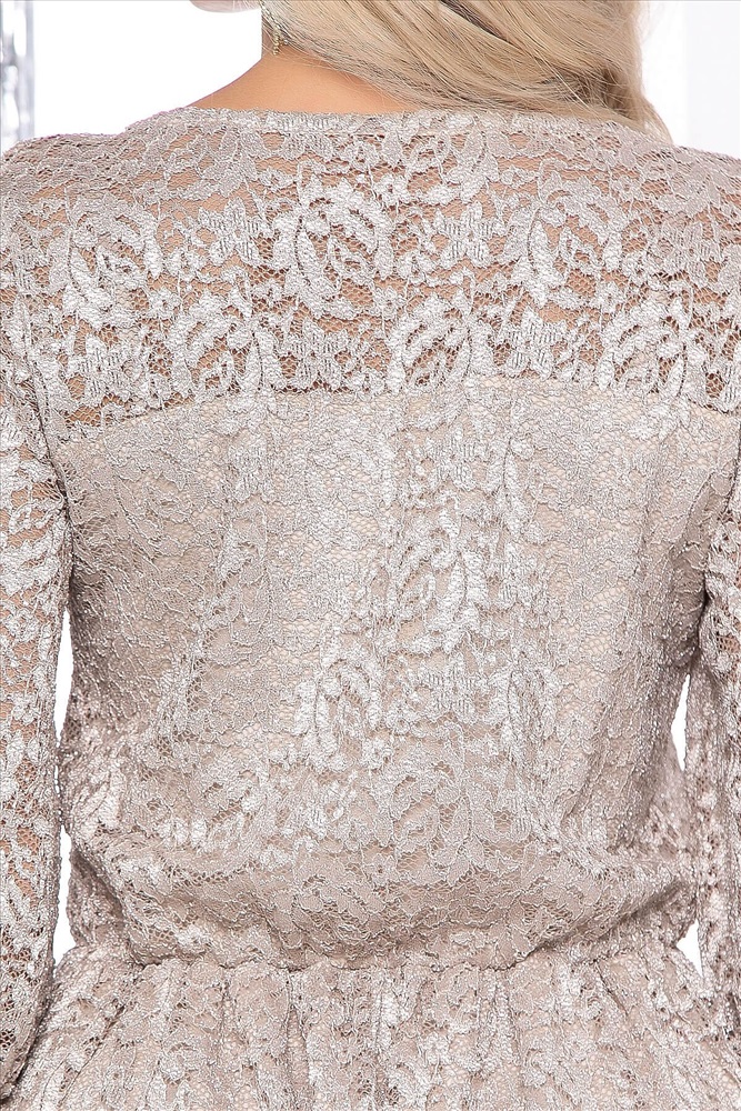Артикул: П7861. Ткань: трикотаж (гипюр с глиттером). Состав: 95% п/э, 5% эластан. Цвет: бежевый. Вид застежки: без застёжки. Силуэт: А-силуэт. Карманы: отсутствуют. Тип горловины: округлый. Подкладка: есть. Длина изделия по спинке: 46-48/ 101 см, 50-52/ 102 см. Рост модели: 168 см.