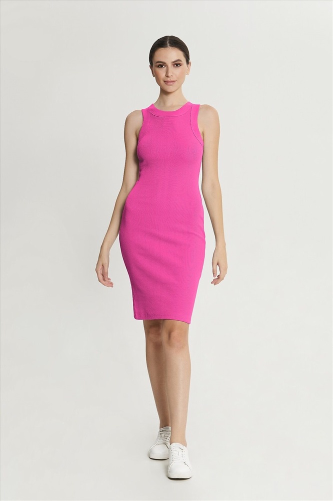Страна производства: Россия Платье средней длины из кашкорсе, облегающего силуэта, с широкой окантовкой пройм и горловины из рибаны.