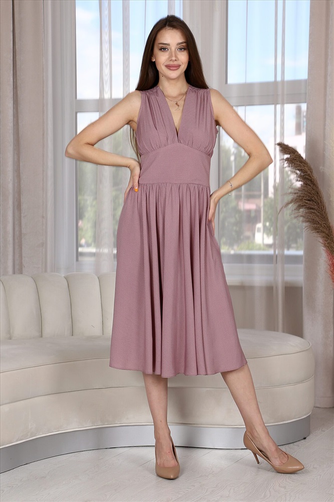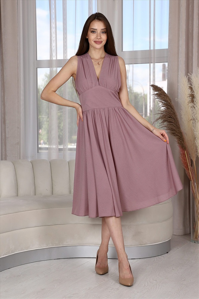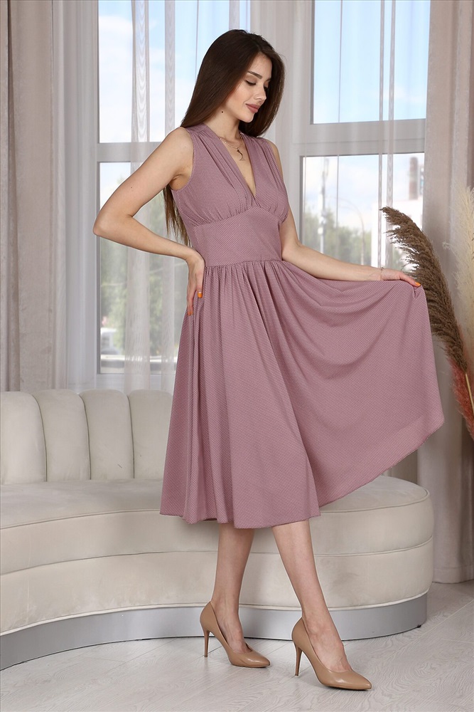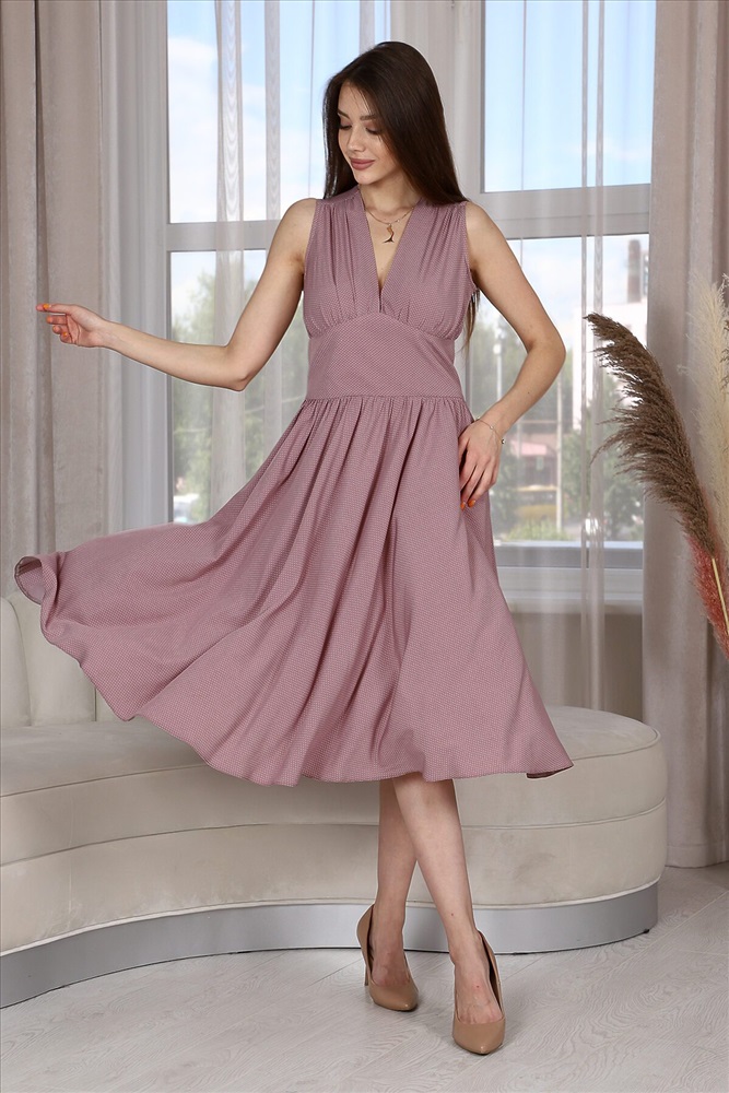 Легкое и романтичное, приталенное платье без рукавов с широкой юбкой-полусолнце - прекрасное решение для жаркого времени года. Ткань в мелкий горошек неизменно пользуется успехом у женщин всех возрастов и комплектаций. Оно тонкое и изящное, в нем вы будете чувствовать себя свободно и комфортно. Платье на высокий рост.