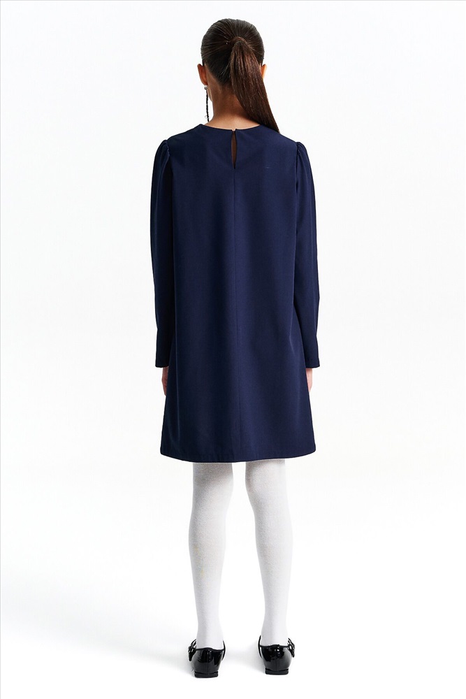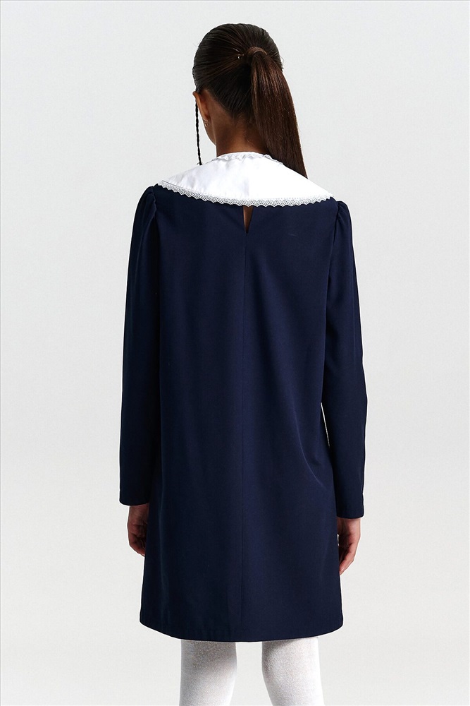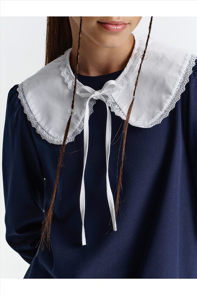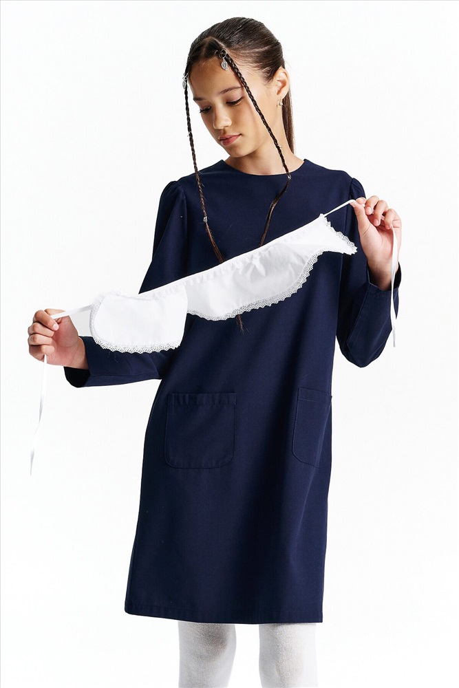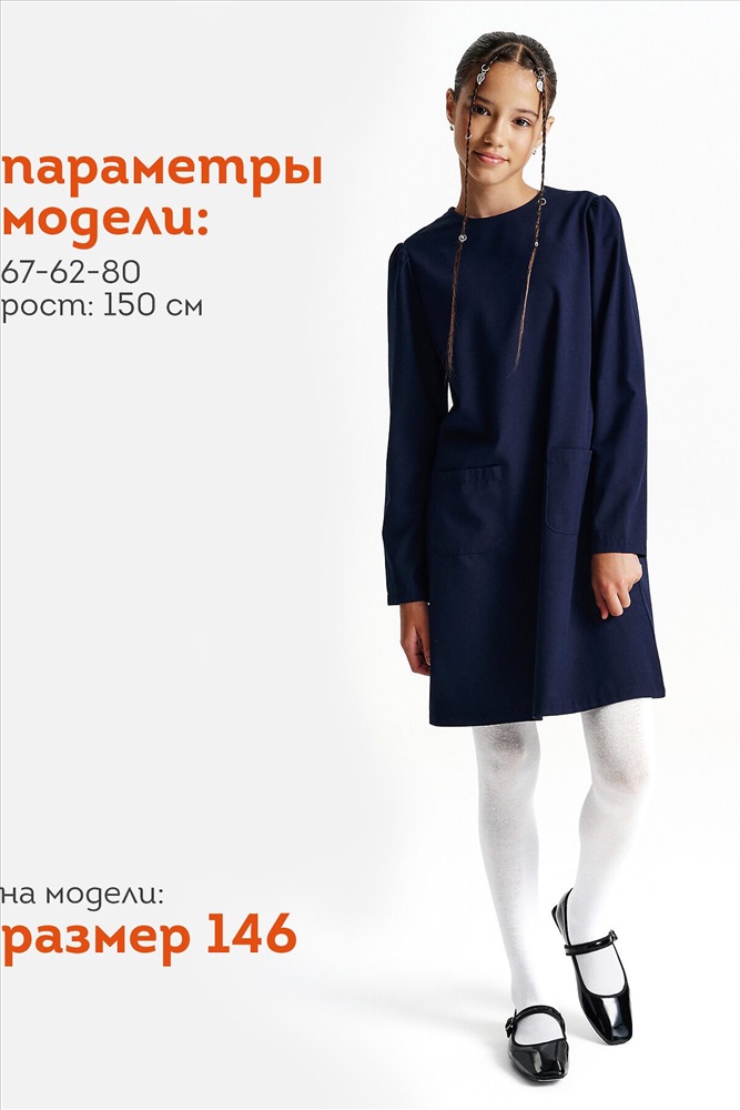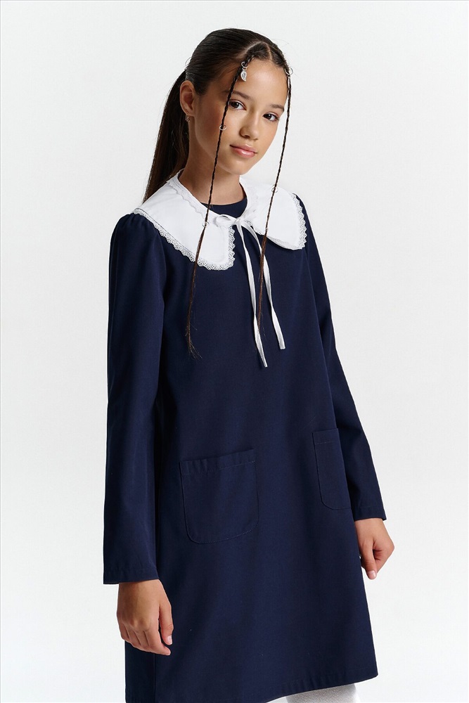 Страна производства: Китай Школьное платье А-силуэта — строгость формы и комфорт на каждый день. Лаконичный дизайн, продуманный крой и съёмный декоративный воротник — модель, которая подойдёт и для школы, и для повседневной носки после уроков. Свободный силуэт с лёгким расширением к низу обеспечивает свободу движения и аккуратный внешний вид. Нагрудные вытачки и средний шов на спинке улучшают посадку и делают платье более структурированным. Два накладных кармана спереди со скруглёнными краями — удобно и функционально. Рукав прямой, втачной, с лёгкой сборкой — сидит аккуратно, не сковывает. Плечо чуть укорочено, что придаёт современный силуэт. Горловина круглая, с застёжкой на петлю и пуговицу по спинке — просто надевать самостоятельно. Съёмный воротник украшен рюшей из кружева. С воротником — строгий школьный образ, без него — повседневное платье. Выбирайте нужный размер по таблице размеров на фото. Цвет товара на экране вашего устройства может отличаться от цвета изделия вживую.
