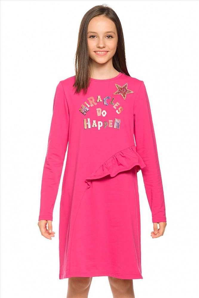 ID товара: 685627 Состав: 75% Хлопок, 20% Полиэстер, 5% Эластан Сезон: Осень/Зима Длина: До колена Фасон: Повседневный Рукав: Длинные Вырез горловины: Округлый Рисунок: Надпись Декоративные элементы: Печатный принт Основная ткань: Хлопок Стиль: Повседневный Страна бренда: Россия Страна производства: Китай Платье для девочек из футера А силуэта. Аккуратный втачной рукав, небольшая горловина. Фишка декоративный асимметричный рельеф необычной округлой формы по переду и по спинке до низа изделия. В рельеф вставлен волан. Rubber принт с золотым металликом и глиттером. Надпись Чудеса случаются. Вуаля. Комментарии к товару