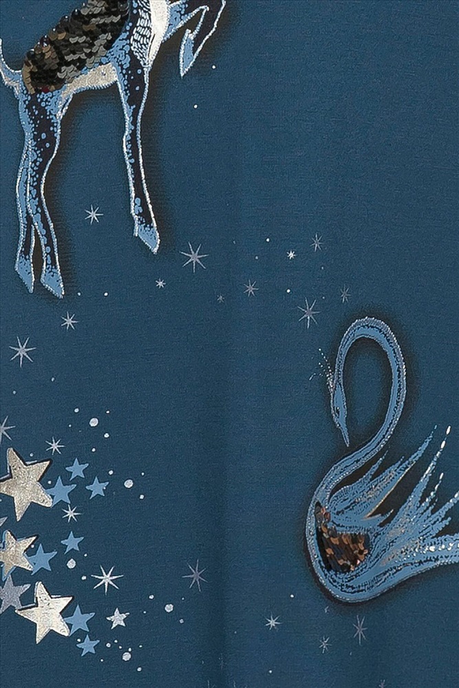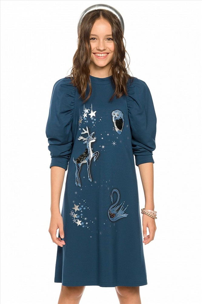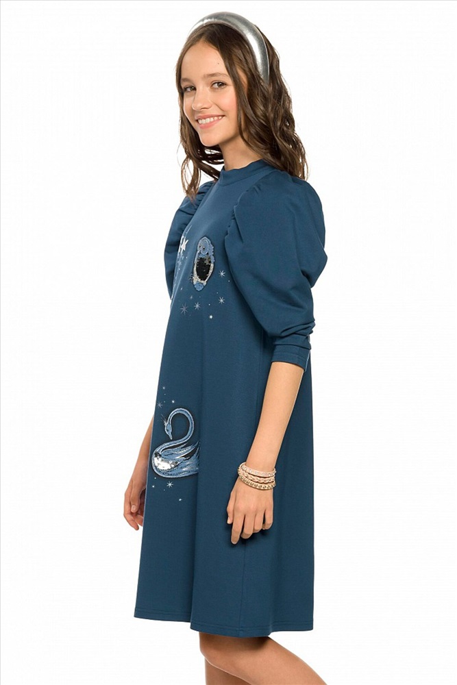 Нарядное платье, слегка расширенное к низу. Горловину украшает изящная стойка, застёжка на две пуговицы по спинке. Фишка платья в пышных рукавах, объём которых достигнут за счет густой сборки оката. Сборка рукава по внутреннему шву на эластик позволяет регулировать длину. Перед декорирован сказочным принтом с серебряным металликом и пайетками.