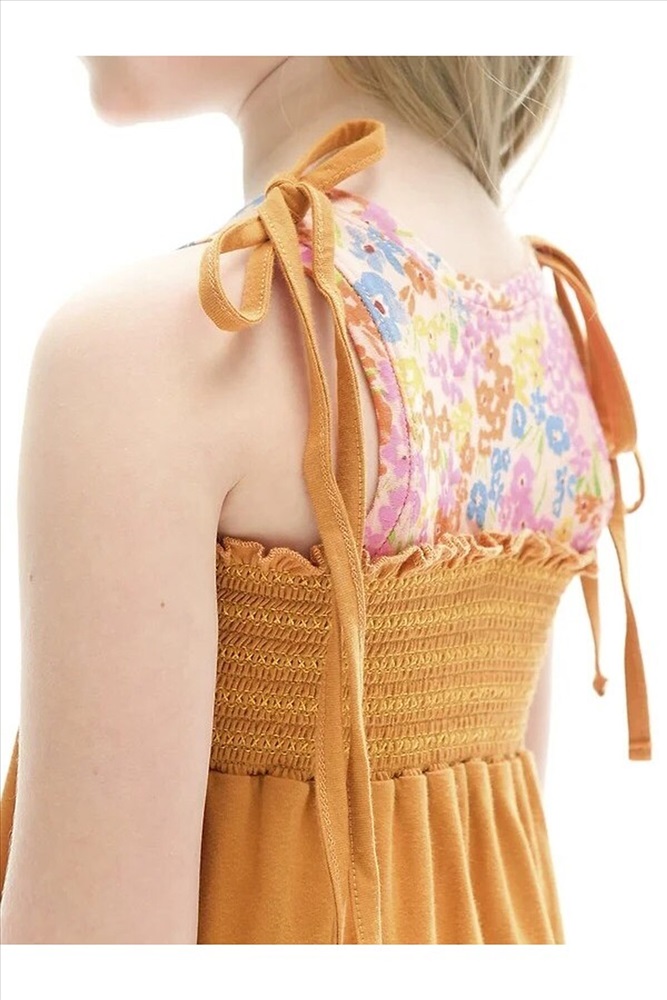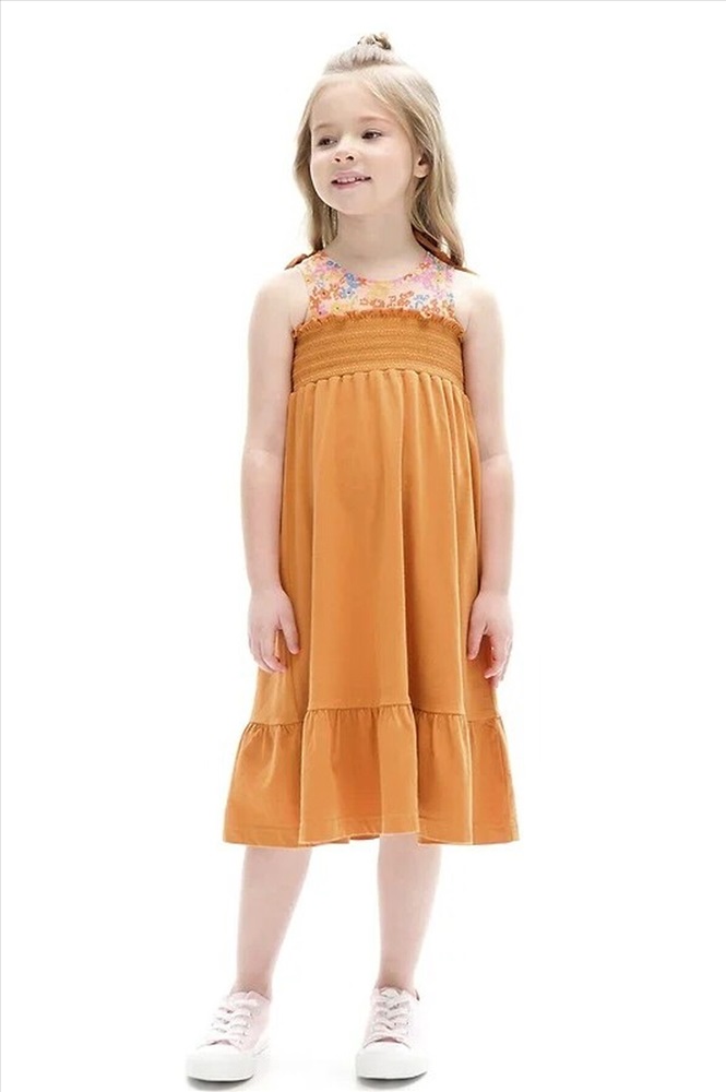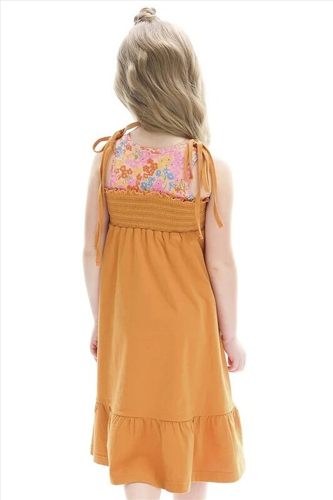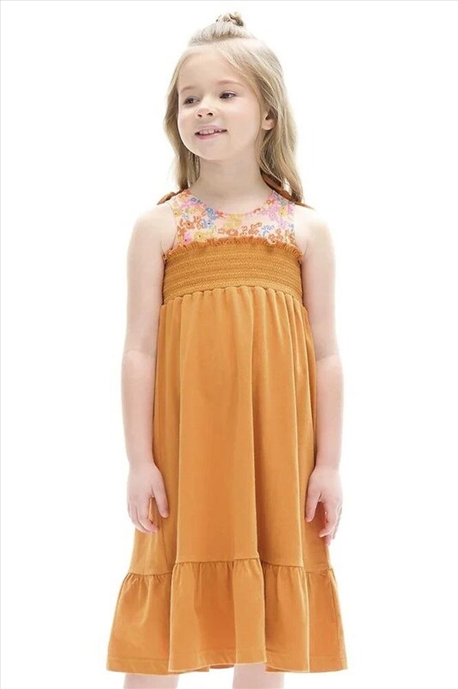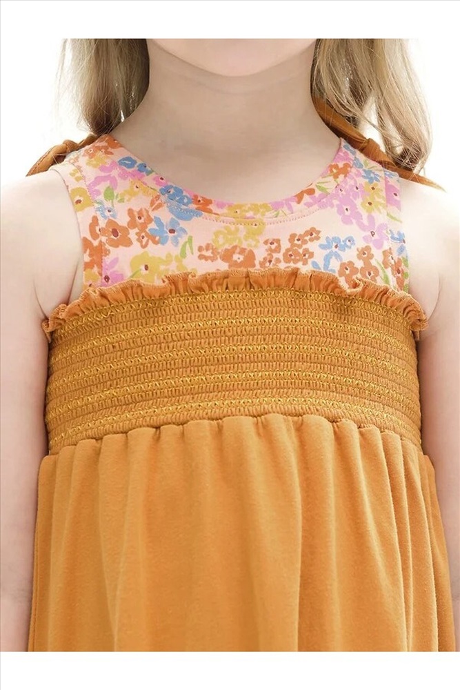 Страна производства: Россия Яркое летнее платье-сарафан длины миди для девочки. Имитация двух изделий, надетых друг на друга. Верхняя часть модели напоминает майку. Нижняя — состоит из лифа с эластичной сборкой и юбки с воланом. Свободный крой и 100% хлопка в составе ткани обеспечивают вашему ребёнку комфорт. Платье не стесняет движений и в нём не жарко. Девочка сможет носить его продолжительное время. Ребёнок растёт —платье словно ""растёт"" вместе с ним. Декоративная сборка на лифе создаёт актуальную фактуру — один из трендов летнего сезона. Верхняя часть изделия украшена изящным цветочным принтом. На плечах декоративные банты.