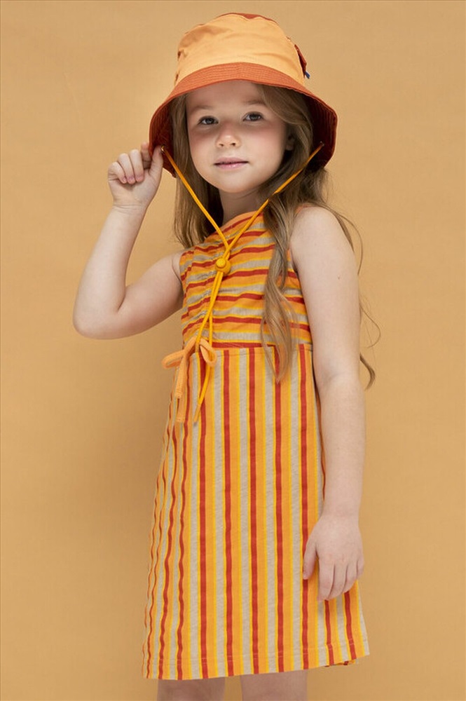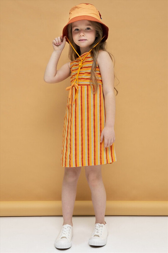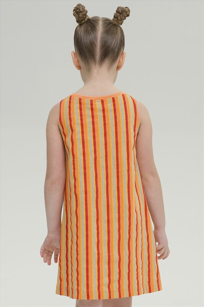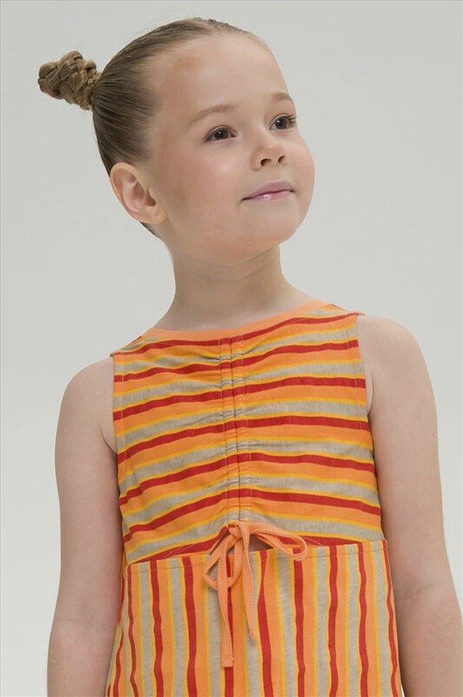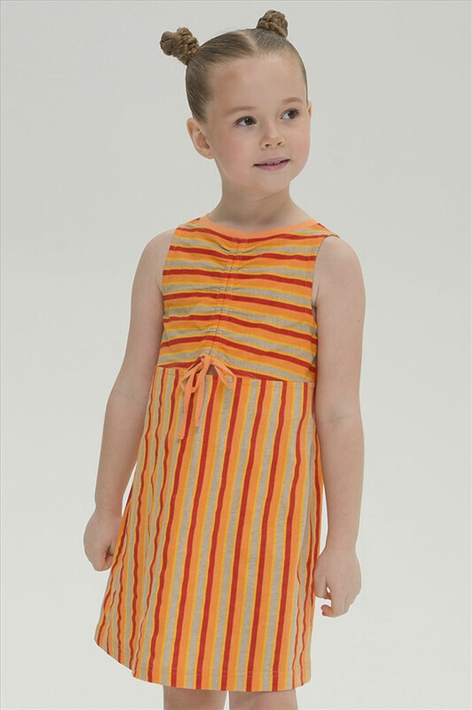 Стильное комфортное платье для девочки - лучшая модель для повседневной носки. Выполнено из натурального хлопка, материал не вызывает аллергии, а тело ребенка всегда дышит. Платье А-образного силуэта, без рукава - в нем не будет жарко. Оригинальное решение - сборка на планке спереди, которая позволяет слегка увеличить размер горловины. Разные направления полосок - модный акцент, который не оставит без внимания и выделит среди сверстников. Идеально, для пляжа, прогулок, детского сада и путешествий.