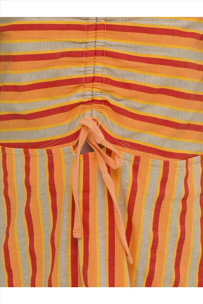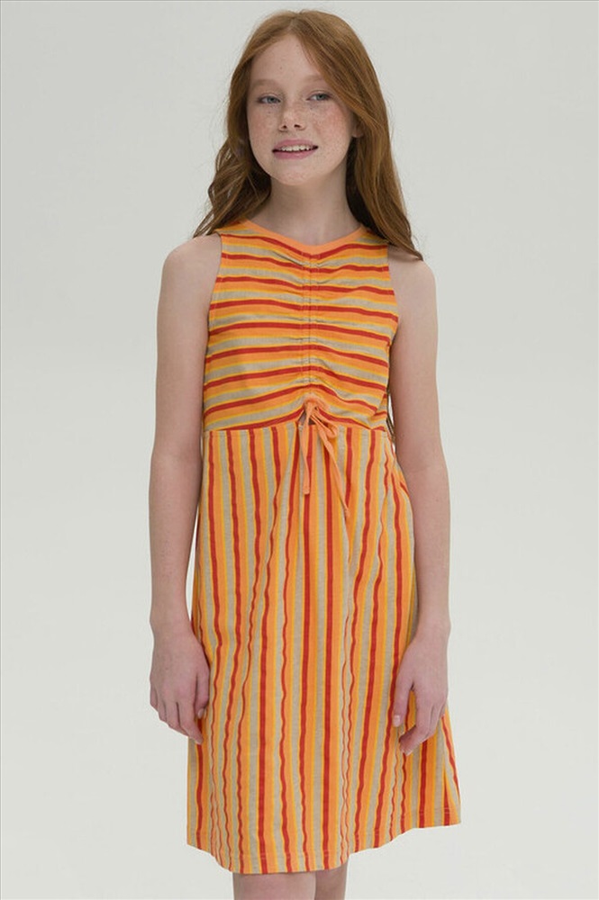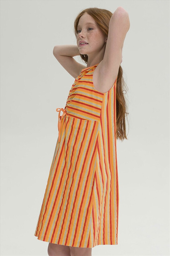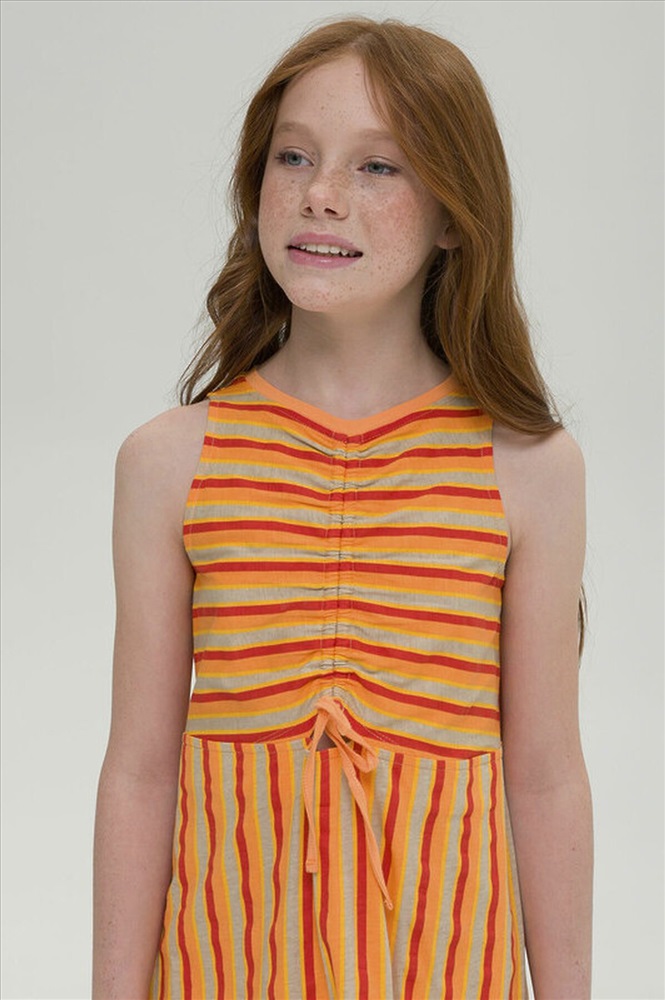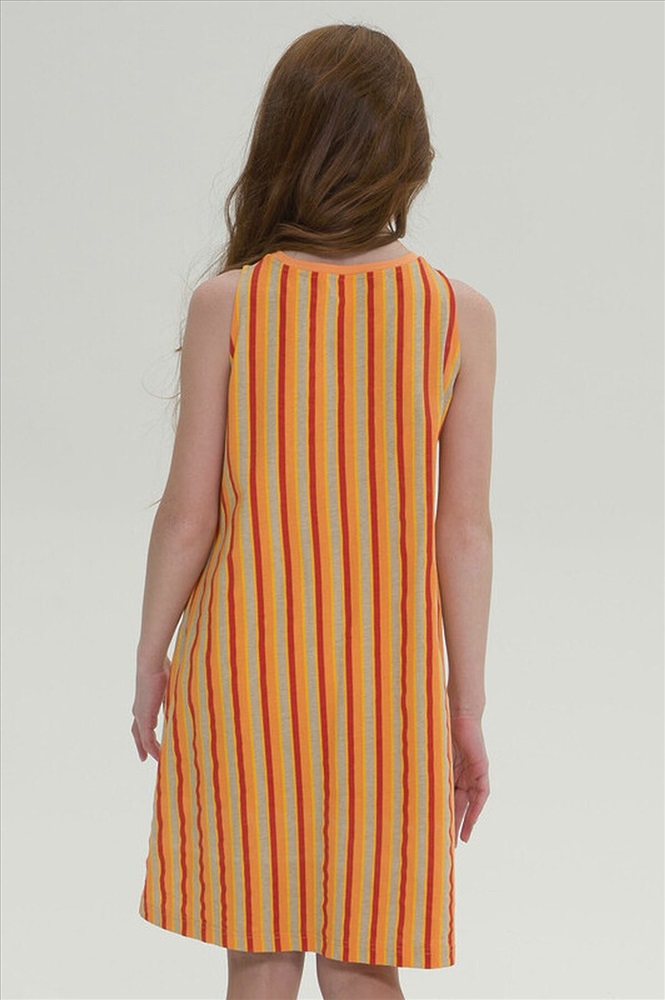 Стильное комфортное платье для девочки - лучшая модель для повседневной носки. Выполнено из натурального хлопка, материал не вызывает аллергии, а тело ребенка всегда дышит. Платье А-образного силуэта, без рукава - в нем не будет жарко. Оригинальное решение - сборка на планке спереди, которая позволяет слегка увеличить размер горловины. Разные направления полосок - модный акцент, который не оставит без внимания и выделит среди сверстников. Идеально, для пляжа, прогулок, детского сада и путешествий.