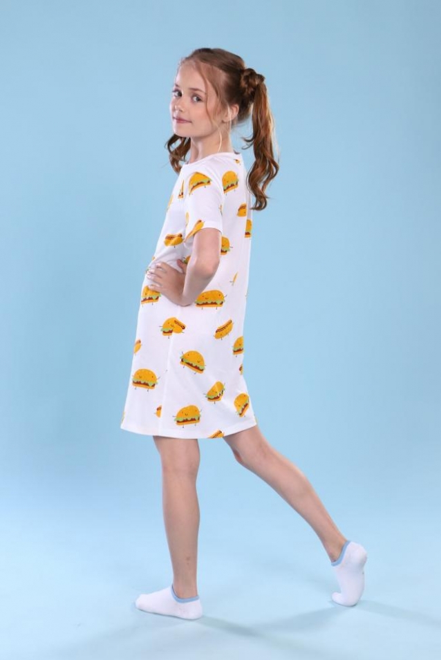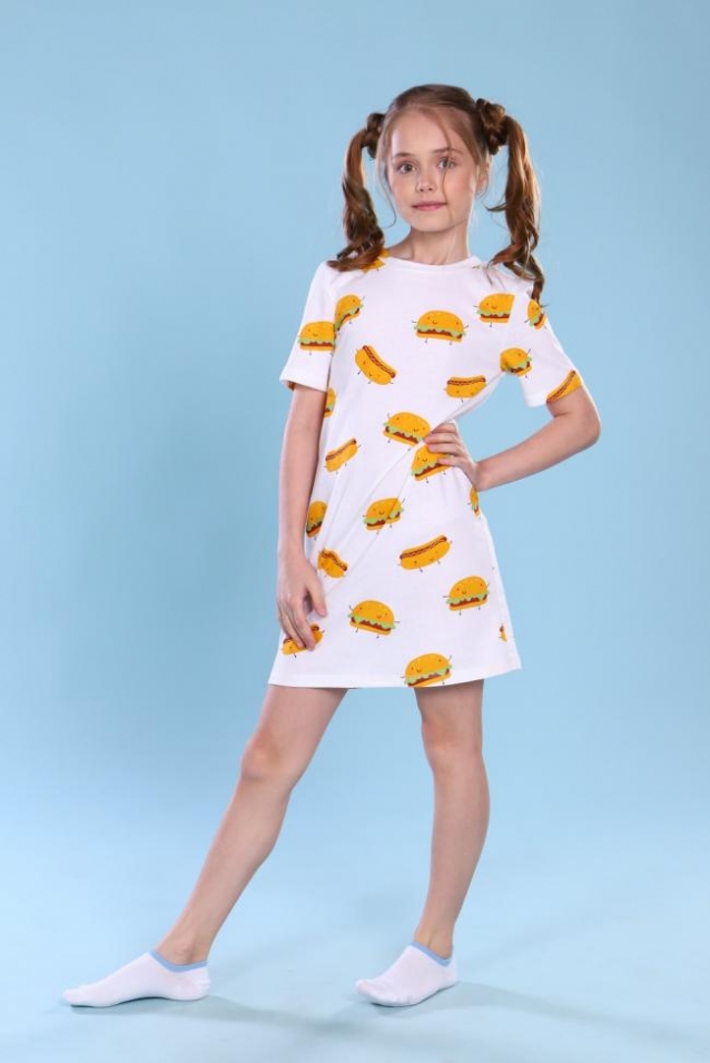 Детская сорочка с короткими рукавами для девочек из легкого трикотажа. Домашняя одежда для девочек должна быть удобной, функциональной и, конечно же, красивой. Сорочка для девочки с принтом Гамбургеры понравится девочкам подростками и девочкам школьного возраста. Сорочка для отдыха и сна приятна на ощупь и не раздражает кожу. Сорочка хлопковая позволит почувствовать мягкость и комфорт во время сна. Ночная рубашка для девочки не стесняет движений и позволяет коже свободно дышать