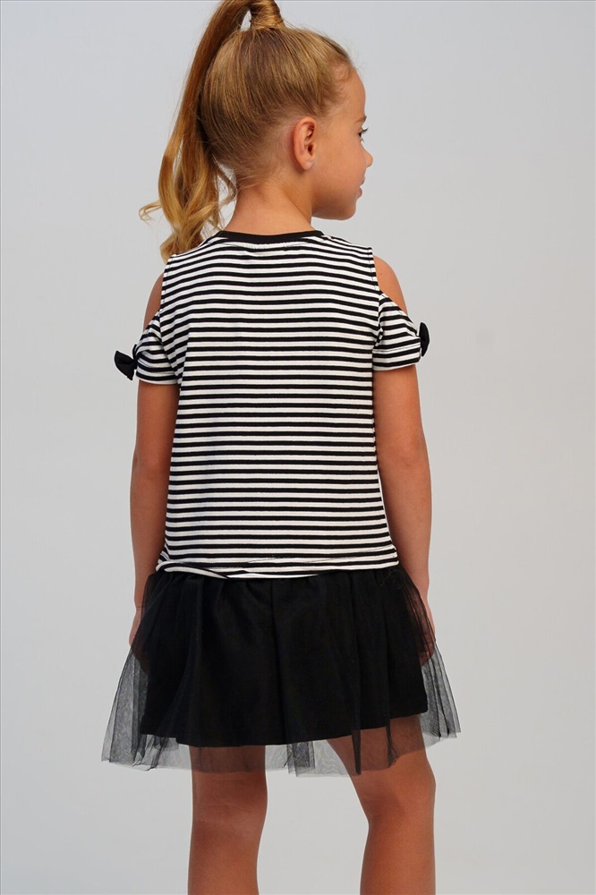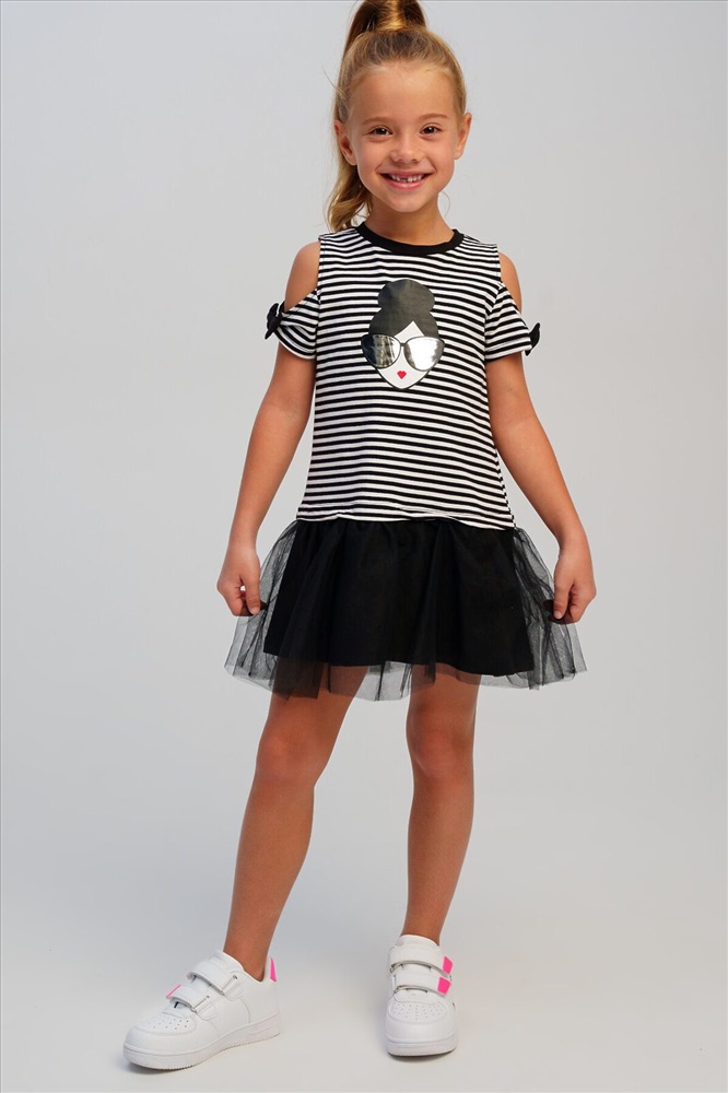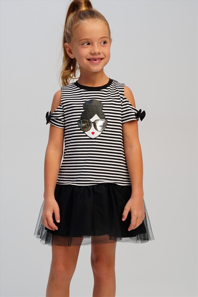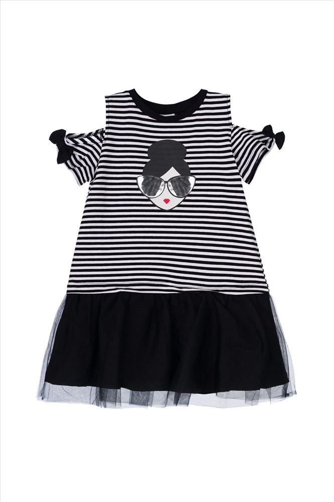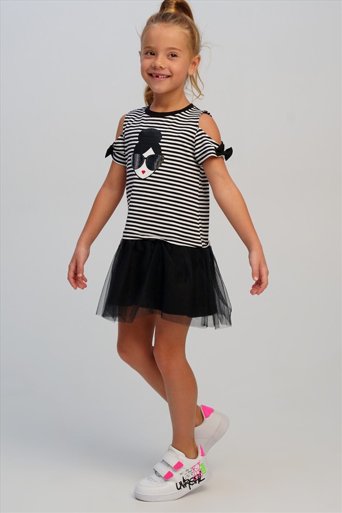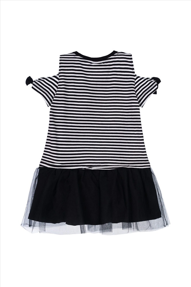 Платье детское для девочки.Платье прямого силуэта. Изделие из качественного и приятного на ощупь трикотажа джерси с высоким содержанием хлопка 95%. Благодаря наличию эластана в составе ткани изделие проще в уходе и держит форму. Банты на рукавах. Декор из сетки. Модель выполнена из качественного и приятного на ощупь трикотажа.