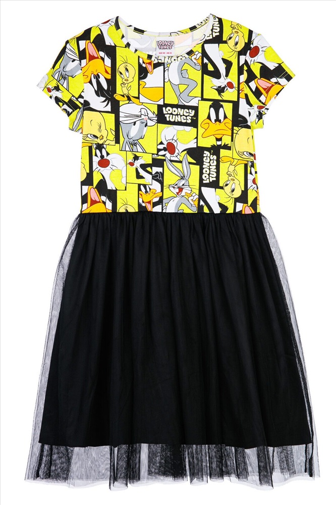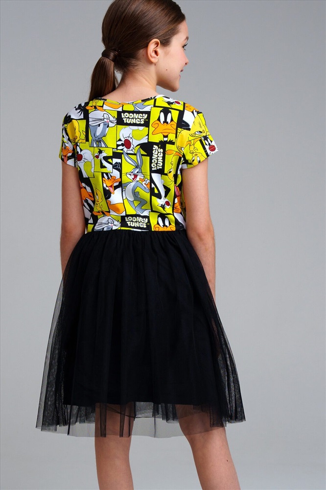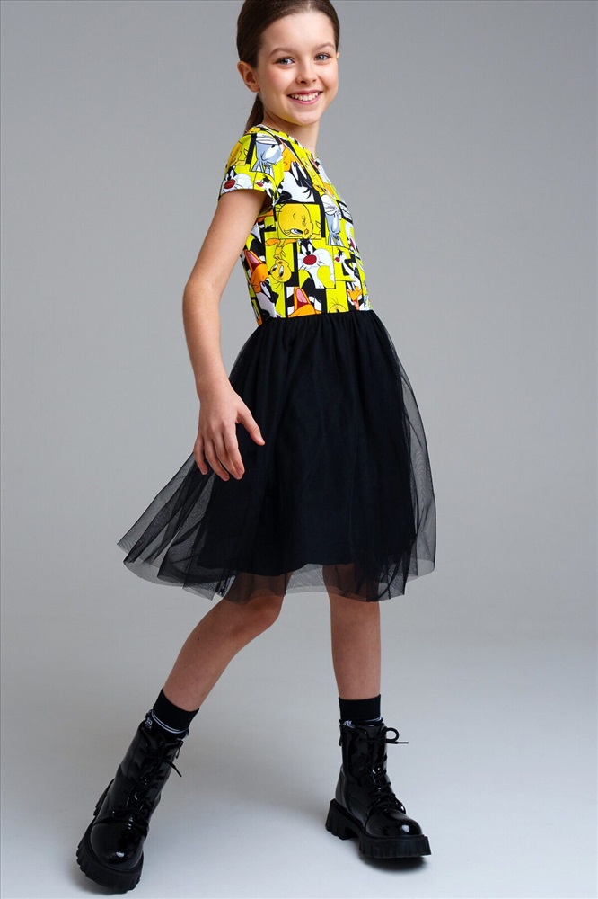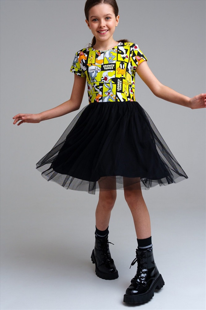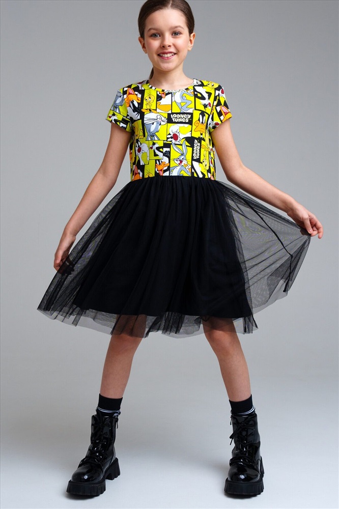 Платье свободного кроя из качественного и приятного на ощупь трикотажа джерси. Высокое содержание хлопка 95%. Благодаря наличию эластана в составе ткани изделие проще в уходе и держит форму. Юбка из сетки.