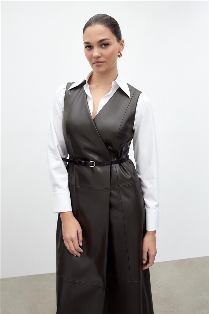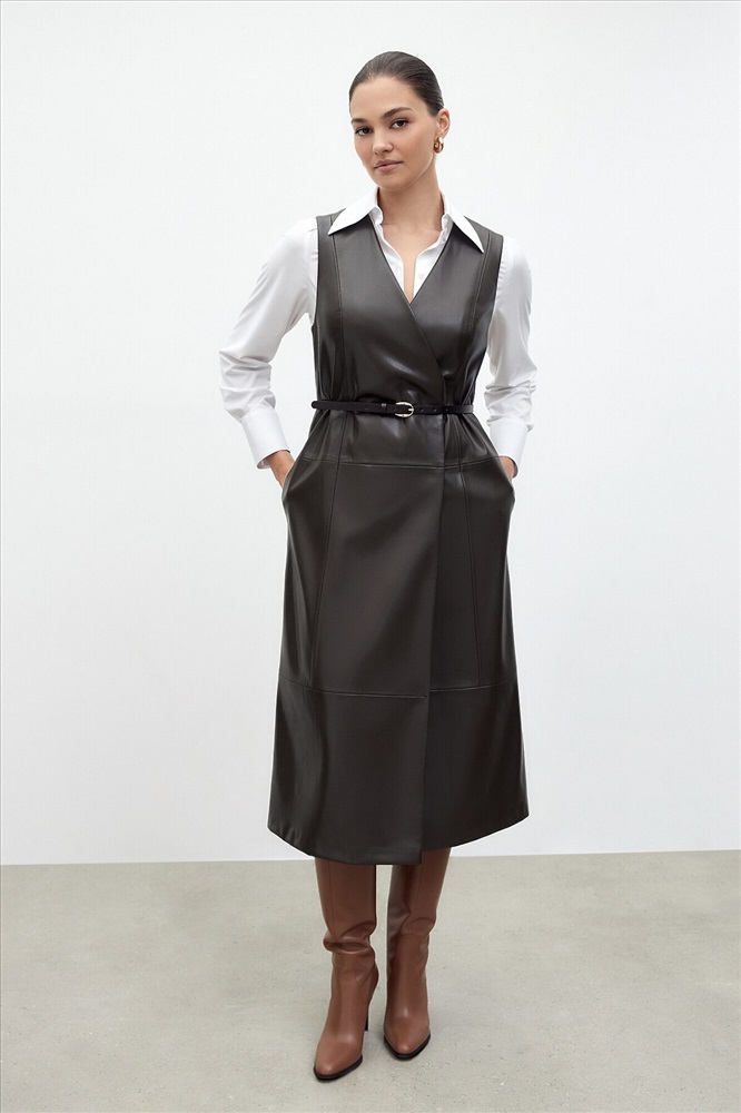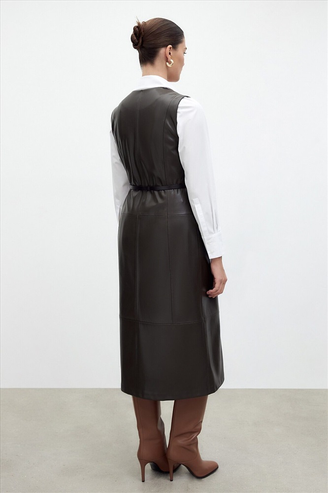ID товара: 1088338 Состав: Основная ткань- Полиэстер 100%; Подкладка- Полиэстер 100% Сезон: Демисезон Длина: Миди Фасон: Полуприлегающий Рукав: без рукавов Вид застежки: Кнопки Вырез горловины: V-образный Декоративные элементы: Пояс Основная ткань: Полиэстер Стиль: классический Страна бренда: Россия Страна производства: Россия Приталенное платье - сарафан из экокожи коричневого цвета с рельефами. Платье на кнопках. Комментарии к товару