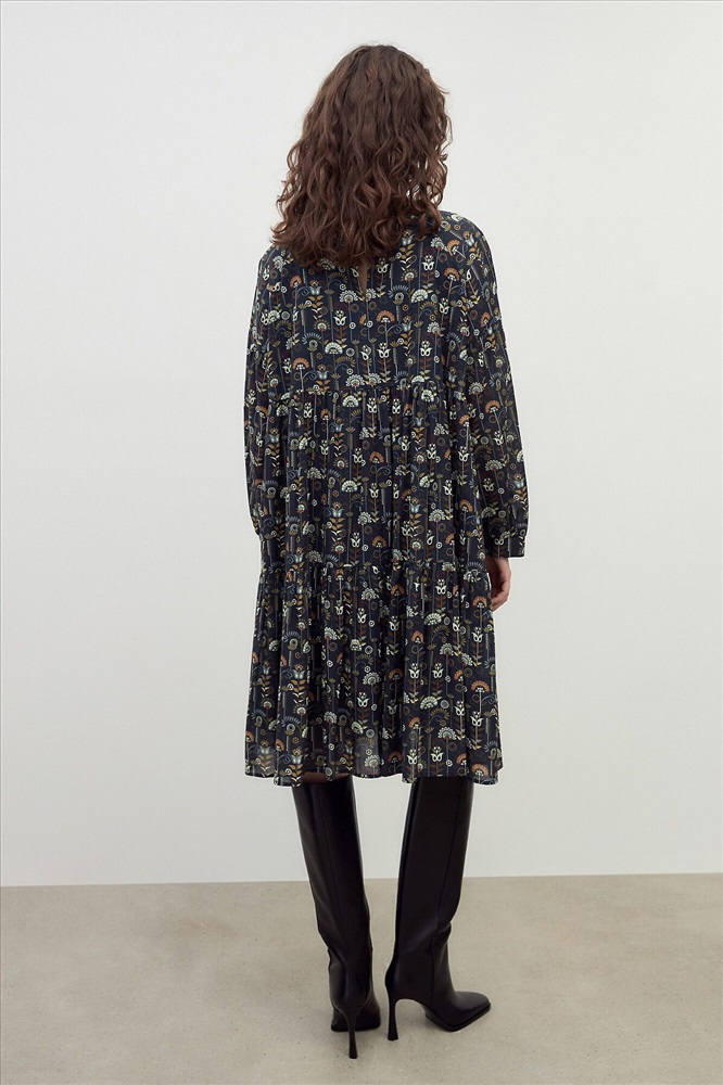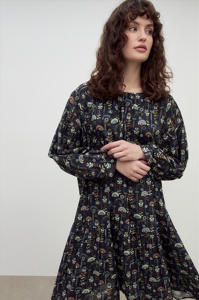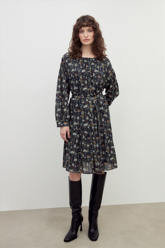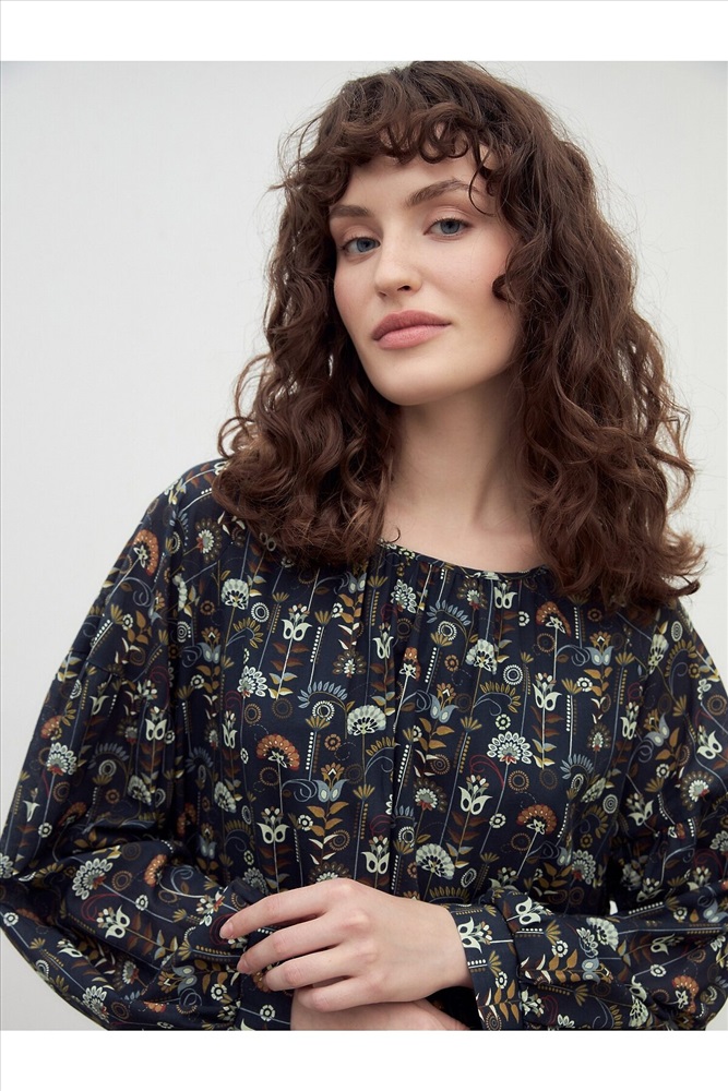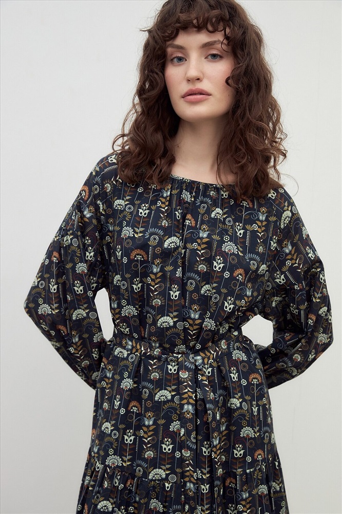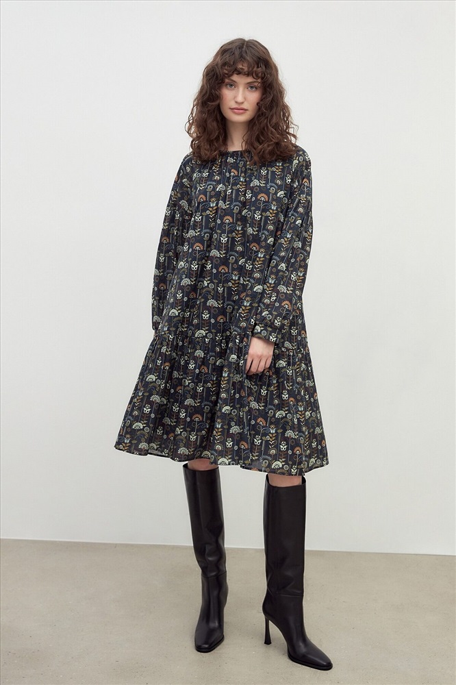 ID товара: 1088345 Состав: Основная ткань- Хлопок 100%; Подкладка- Хлопок 100% Сезон: Демисезон Длина: До колена Фасон: Свободный Рукав: длинные Вид застежки: Молния Вырез горловины: Округлый Рисунок: растительный Декоративные элементы: Пояс Основная ткань: Хлопок Стиль: Романтический Страна бренда: Россия Страна производства: Россия Романтичное свободное платье из легкой хлопковой ткани с цветочным принтом. Горловина и рукава собраны на сборку, по низу платья идет широкий волан. На спинке капелька с пуговицей для лучшей посадки. Платье также имеет хлопковую подкладку. В комплект входит пояс из основной ткани для придания приталенного силуэта. Комментарии к товару