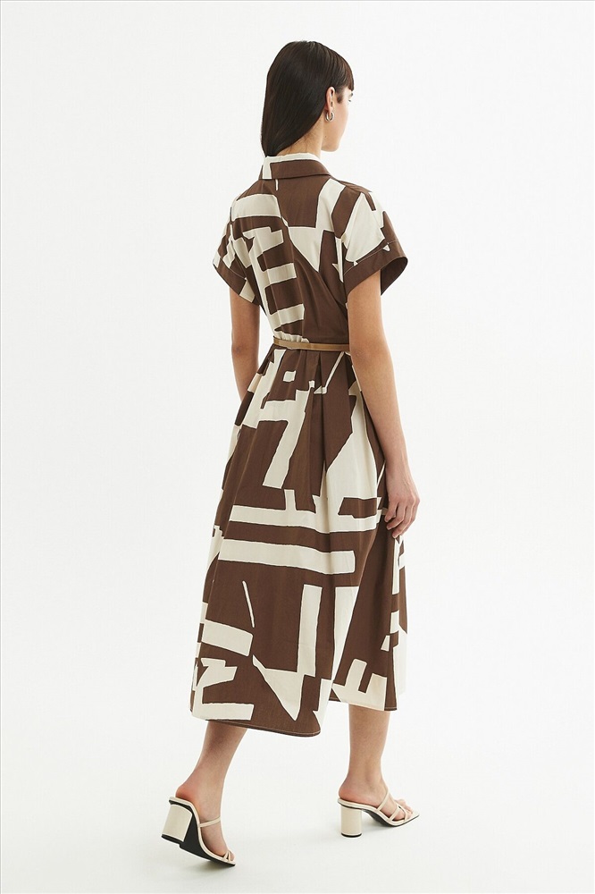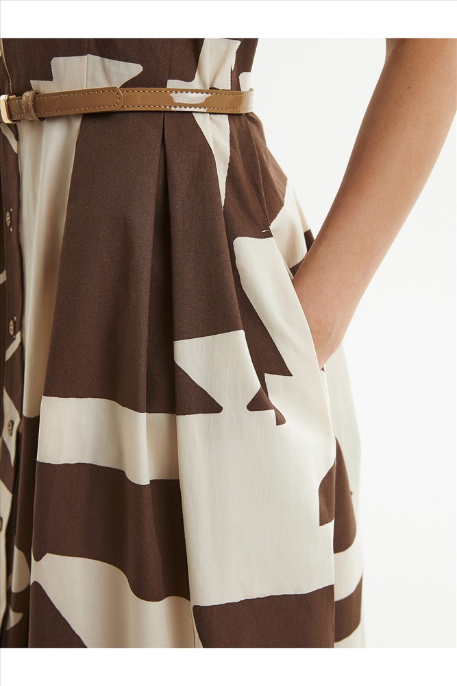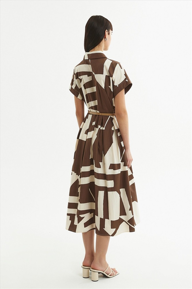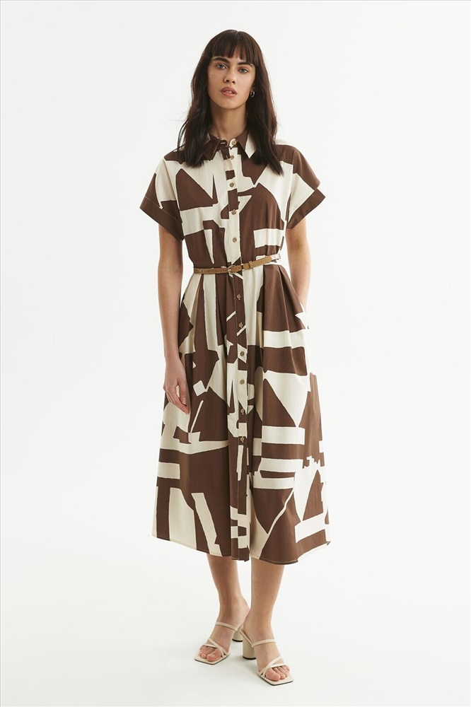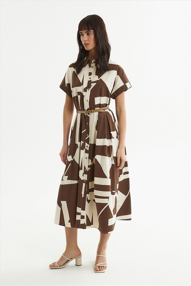 Женственное платье из хлопковой ткани в крупном бежево-шоколадном принте, приталенного силуэта с пышной юбкой со складками, расширенной к низу. Воротник классический отложной, рукав короткий кимоно, застежка спереди на пуговицы. В боковых швах рабочие карманы. В комплект входит тонкий шоколадный ремень из экокожи.