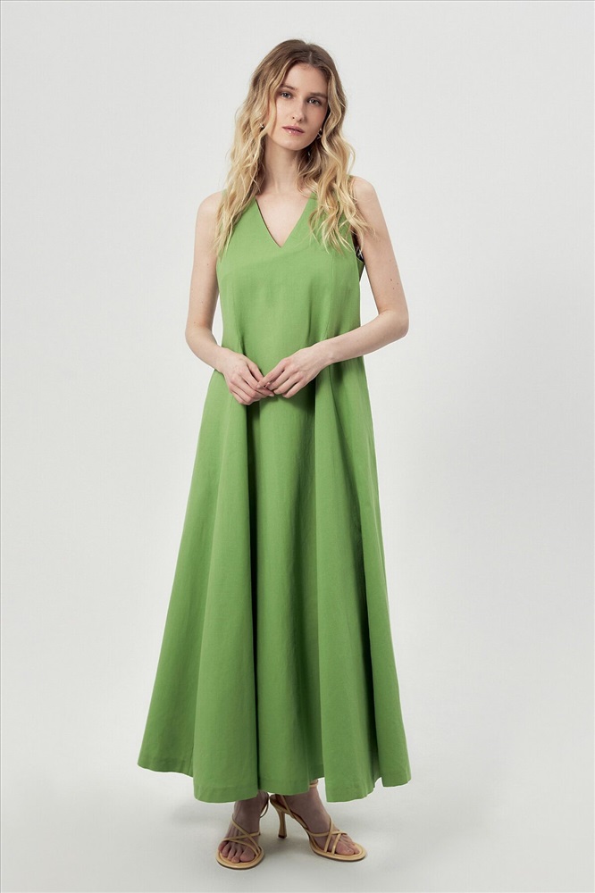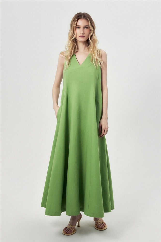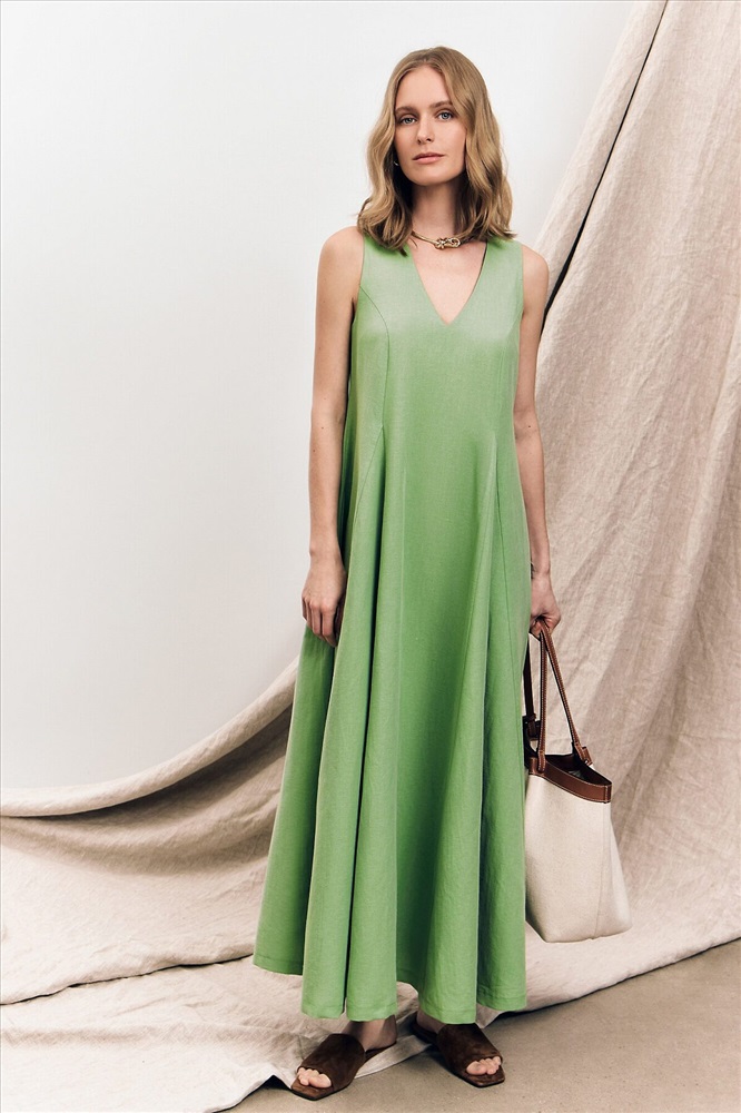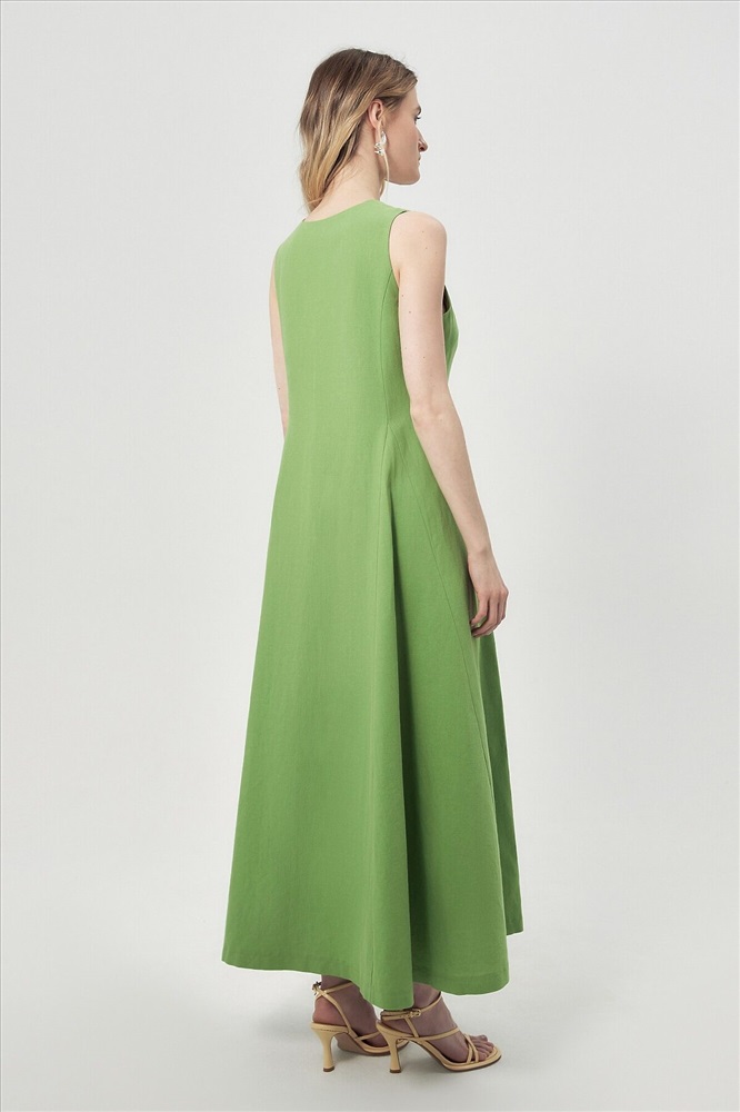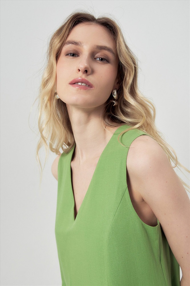 ID товара: 1136698 Состав: Хлопок 90%, Лен 10% Сезон: Весна/Лето Длина: Миди Фасон: А-силуэт Рукав: Без рукавов Вырез горловины: V-образный Тип карманов: В шве Основная ткань: Хлопок Стиль: классический Страна бренда: Россия Страна производства: Россия Стильное платье без рукавов из смесовой ткани в цвете "первая трава" свободного А-силуэта длины миди с v-образным вырезом горловины и рельфами. Комментарии к товару