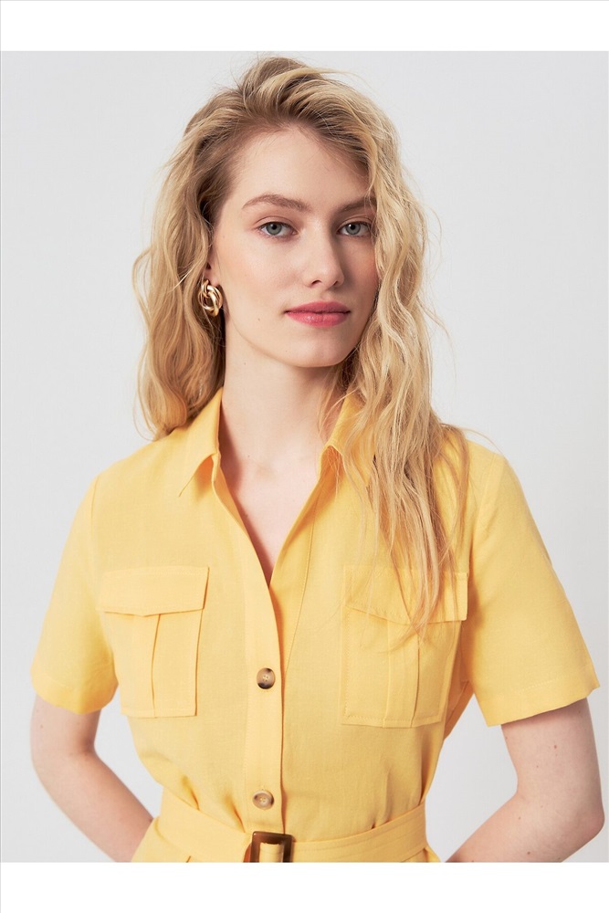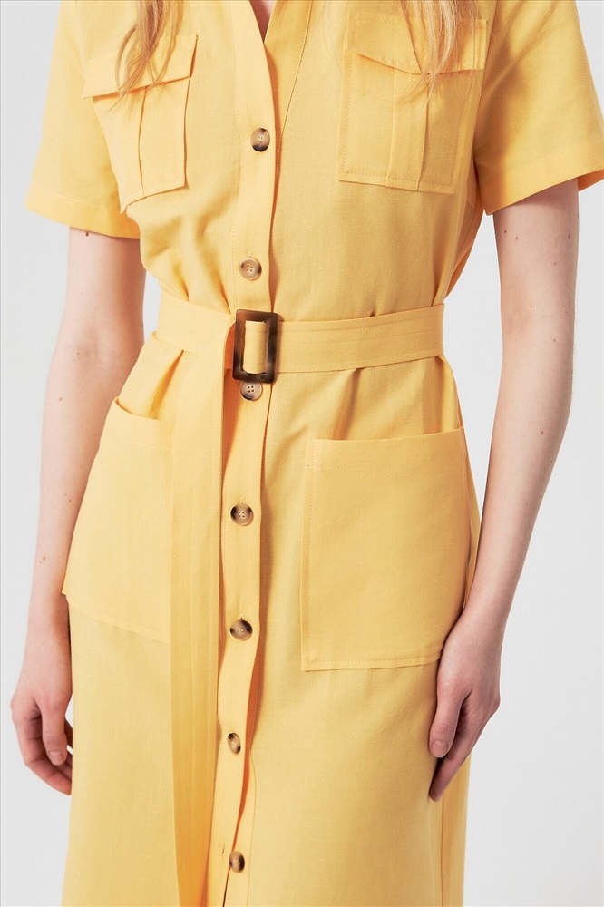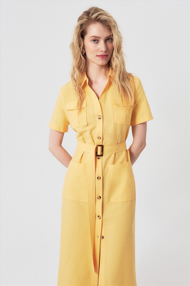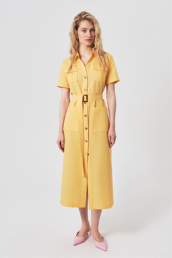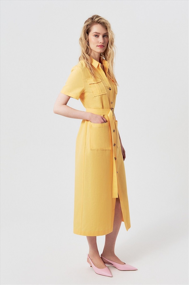 ID товара: 1136702 Состав: Хлопок 90%, Лен 10% Сезон: Весна/Лето Длина: Миди Фасон: Прямой Рукав: Короткие Вид застежки: Пуговицы Вырез горловины: Отложной воротничок Тип карманов: Накладные Декоративные элементы: Пояс Основная ткань: Хлопок Стиль: классический Страна бренда: Россия Страна производства: Россия Прямое платье в стиле сафари на пуговицах, рукав короткий втачной. На груди есть накладные карманы с клапанном, на бедрах накладные. Платье выполнено из смесовой костюмной ткани солнечно - желтого цвета. В комплекте пояс из той же ткани с пряжкой. Комментарии к товару