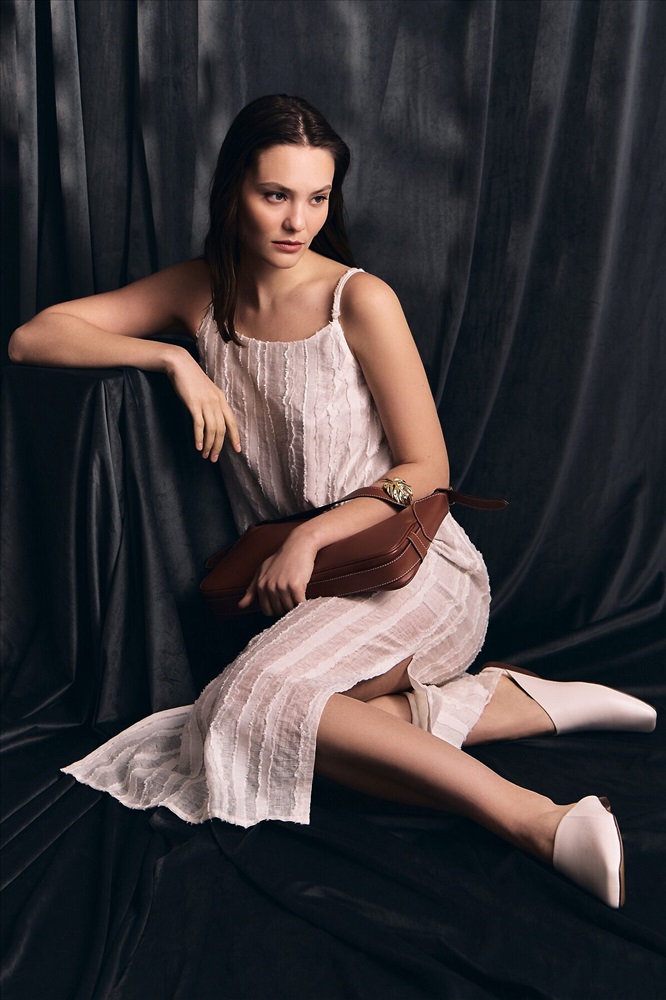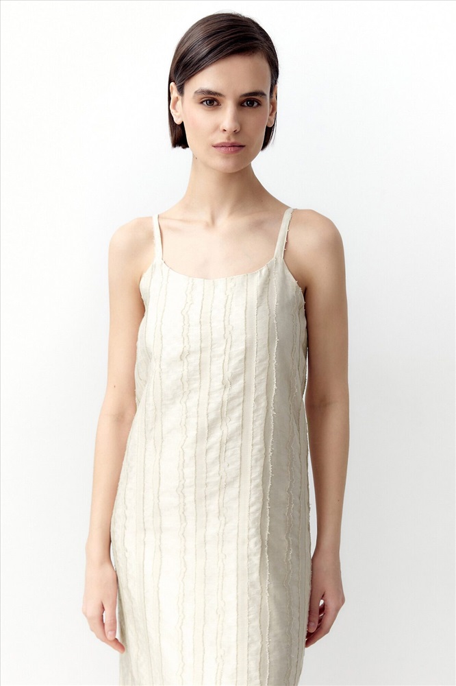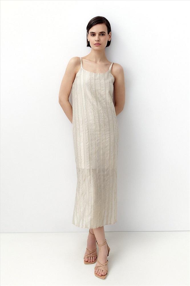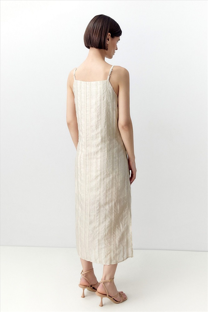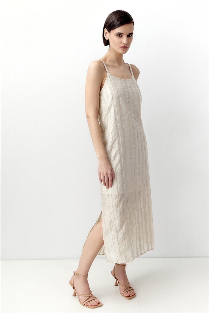 Нежное прямое платье на тонких бретелях с овальным вырезом из фактурной ткани сливочного цвета, по боковым швам есть разрезы. Платье на подкладке.