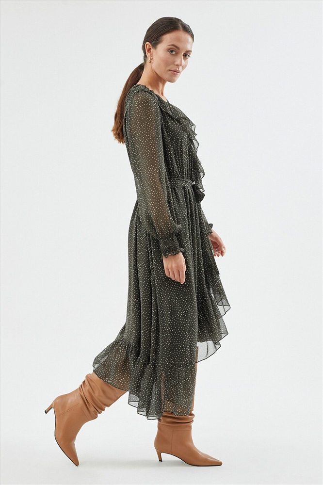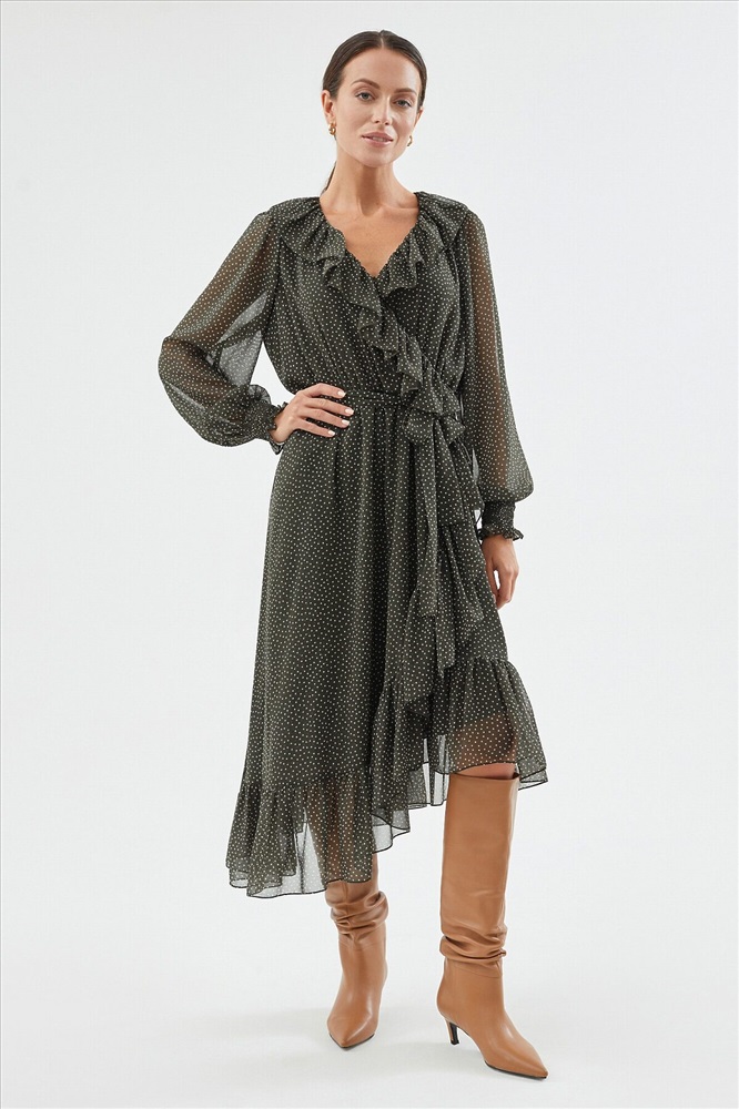 Романтичное легкое платье на запах в принт "polka dot". Платье с V-образным вырезом с обработкой запаха воланом. Рукава со сборкой по окату и манжетам из резинок-жилок. На талии резинка для лучшей посадки по талии. В комплект входит пояс из основной ткани. Платье на подкладке.