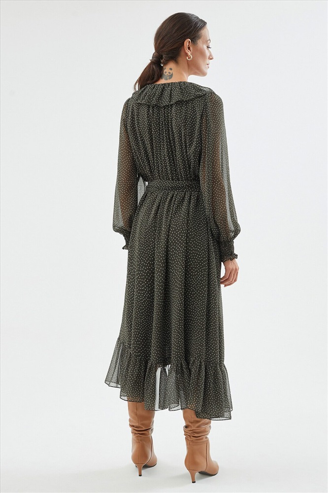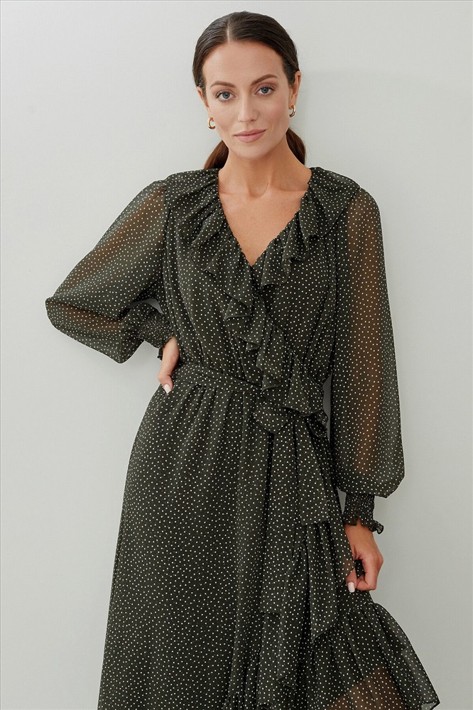 Производитель: POMPA ID товара: 970077 Состав: Полиэстер 100% Сезон: Весна/Лето Длина: Миди Фасон: Расклешенное Рукав: длинные Вырез горловины: V-образный Рисунок: Горох Декоративные элементы: Волан Основная ткань: Полиэстер Стиль: Романтический Страна бренда: Россия Страна производства: Россия