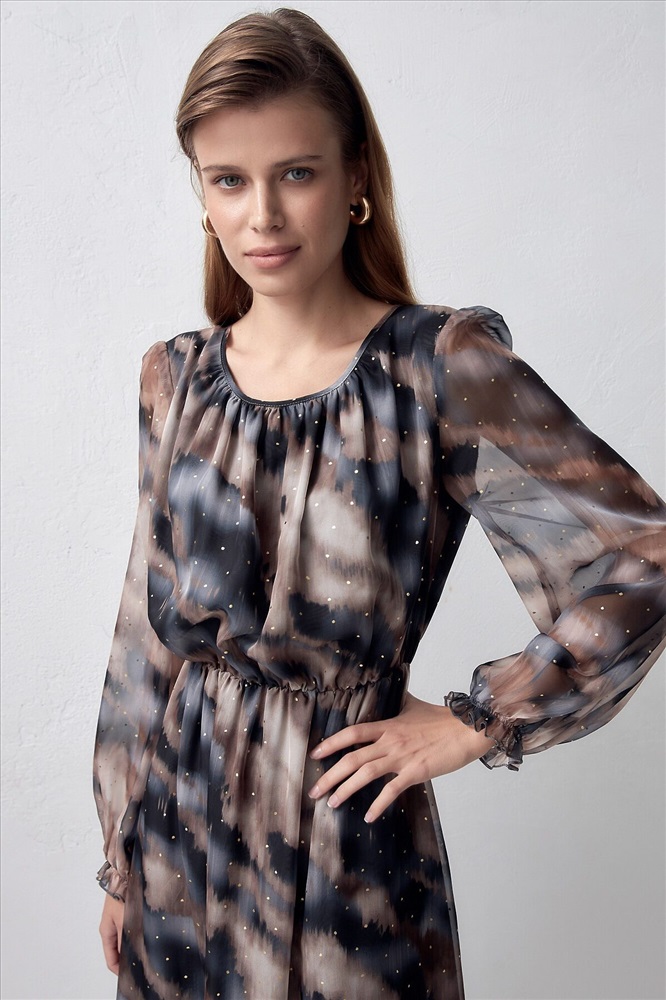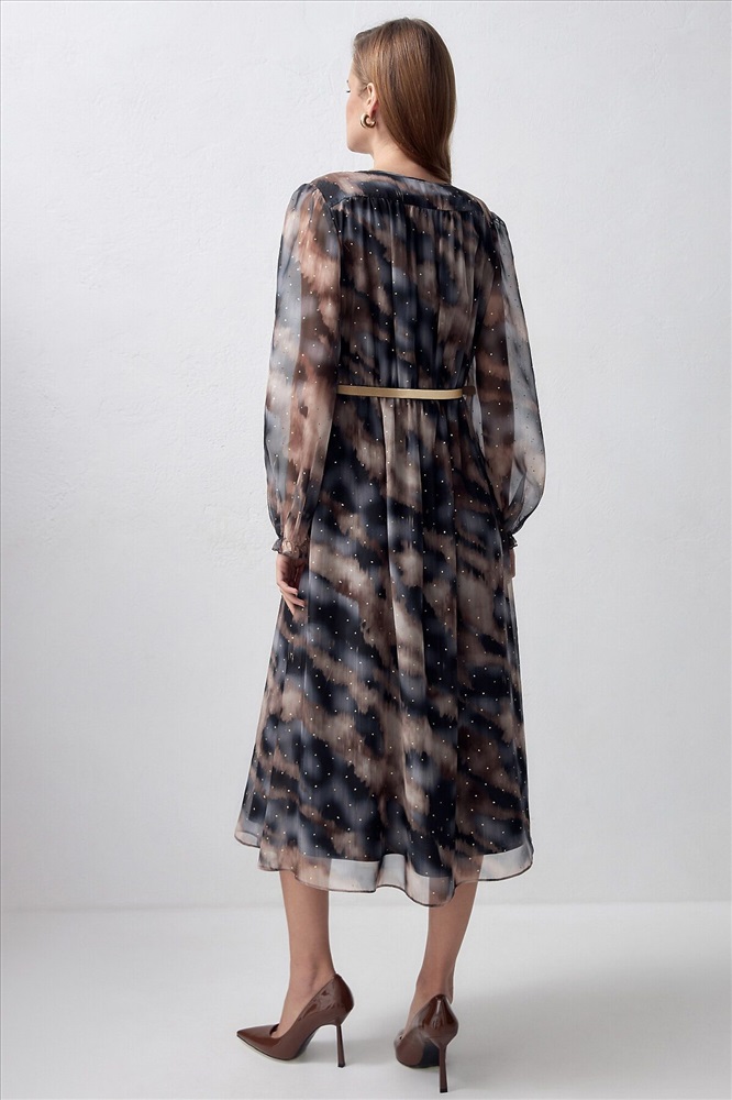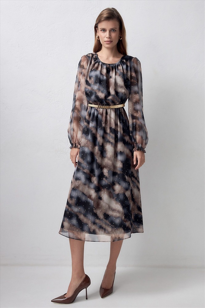ID товара: 970285 Состав: Полиэстер 100%; Подкладка- Полиэстер 100% Сезон: Весна/Лето Длина: Средняя Фасон: Прямой Рукав: длинные Вырез горловины: V-образный Рисунок: Абстракция Декоративные элементы: Принт Основная ткань: Полиэстер Стиль: Романтический Страна бренда: Россия Страна производства: Россия Прямое платье с резинкой по талии и круглым вырезом со складкой по горловине. Платье выполнено из плательной ткани с металлизированным принтом. Втачной рукав со сборкой по окату и резинкой-жилкой по низу. В комплекте идет пояс из экокожи. Комментарии к товару