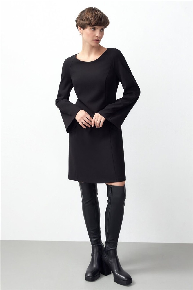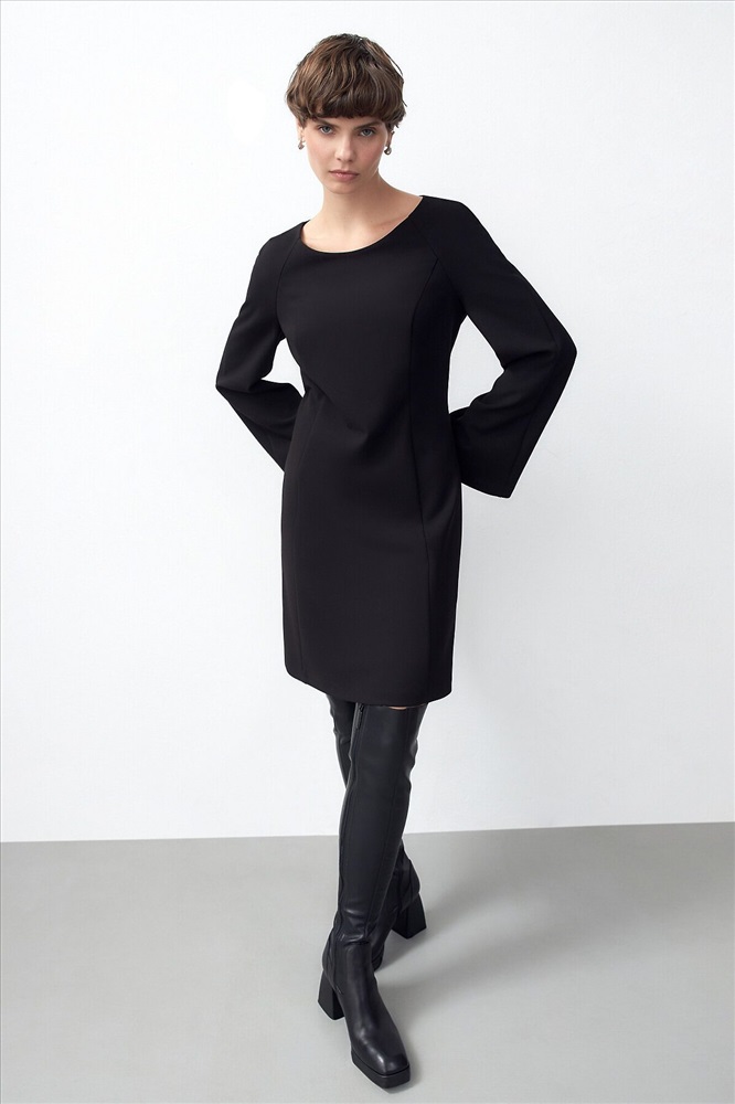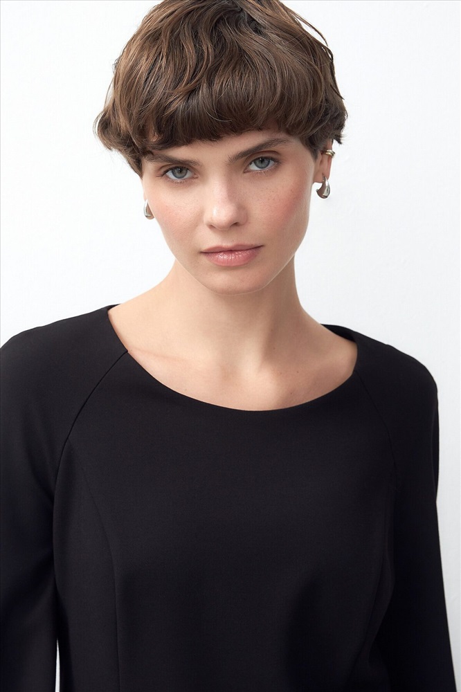 ID товара: 970390 Состав: Полиэстер 62%, Вискоза 33%, Эластан 5% Сезон: Демисезон Длина: Мини Фасон: Полуприлегающий Рукав: длинные Вырез горловины: "лодочка" Основная ткань: Полиэстер Стиль: Повседневный Страна бренда: Россия Страна производства: Россия Черное платье из костюмной ткани с эффектной линией горловины и расширяющимися рукавами. Платье полуприлегающего силуэта с рельефами, рукав реглан. Отлично подойдет для прогулок по городу и неофициальных встреч. Комментарии к товару