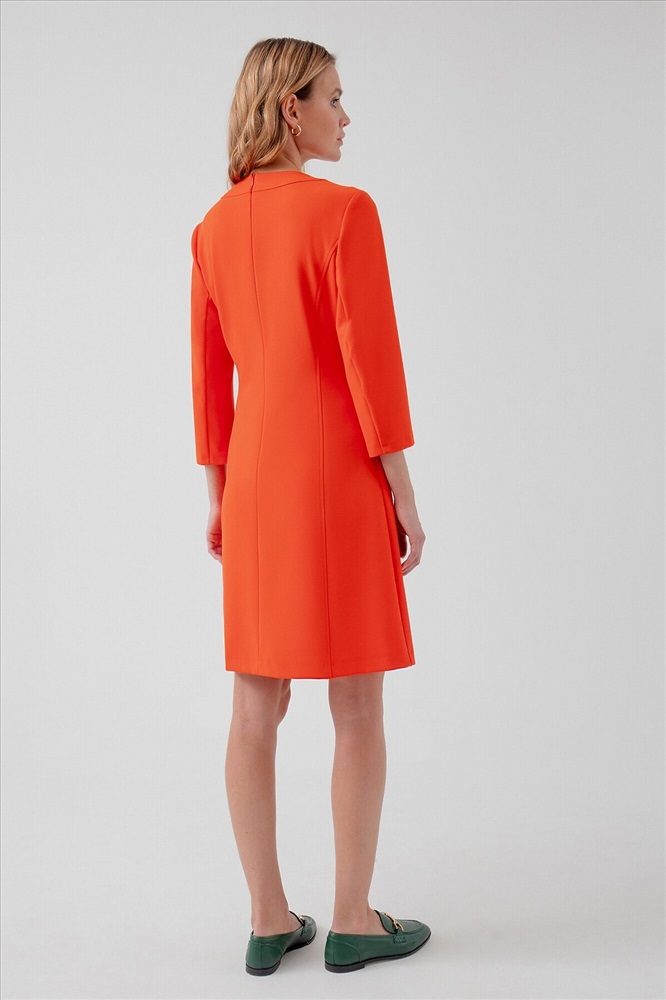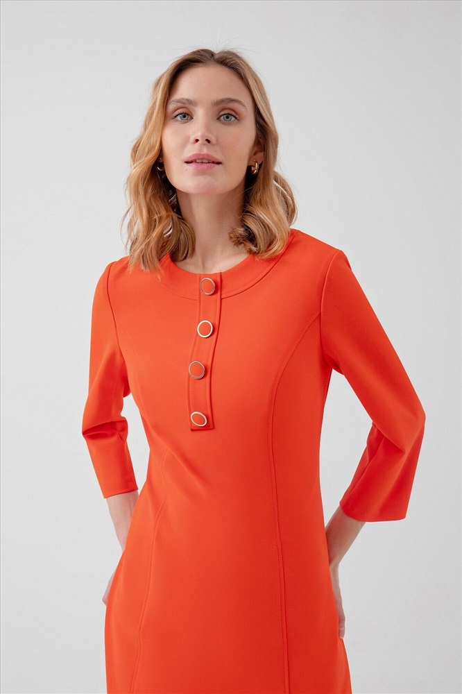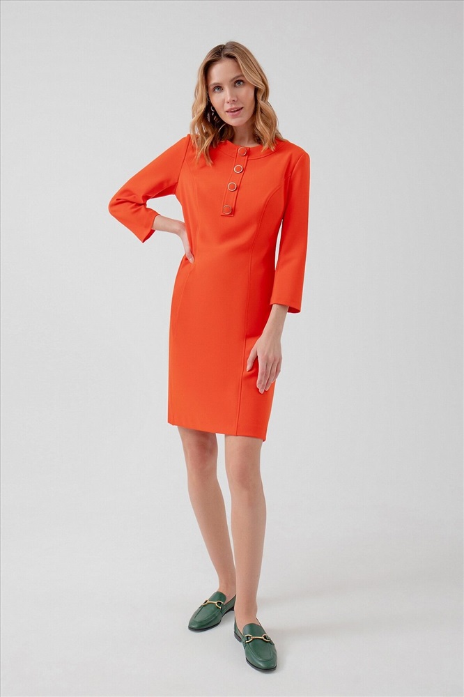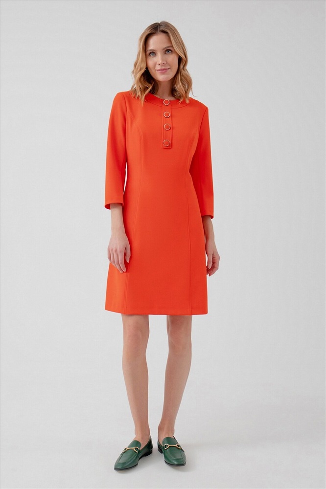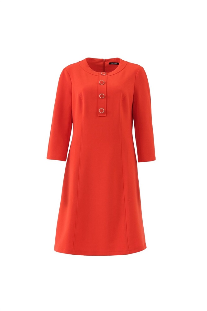 ID товара: 970867 Состав: Полиэстер 62%, Вискоза 33%, Эластан 5%; Подкладка- Полиэстер 100% Сезон: Демисезон Длина: До колена Фасон: Приталенное Рукав: 3/4 Вид застежки: Молния Подкладка: Есть Вырез горловины: Округлый Основная ткань: Полиэстер Стиль: повседневный Страна бренда: Россия Страна производства: Россия Полуприлегающее платье из костюмной ткани с добавлением вискозы в ярком весеннем цвете "грейпфрут". Вертикальные рельефы подчеркнут вашу фигуру и визуально вытянут ее вверх. Вырез оформлен имитацией планки с обтяжными пуговицами, длина рукавов 3/4. Комментарии к товару