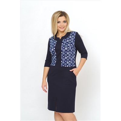 Очаровательное платье прилегающего силуэта из трикотажного полотна с цветочным принтом. Втачные рукава ¾. Круглая горловина дополнена вырезом «птичка». Центральная часть переда и бейка горловины выполнены из контрастного материала. Модель отрезная ниже линии талии, по бокам дополнена карманами. В среднем шве спинки – потайная застежка на молнию. Низ ровный, спереди разрез.