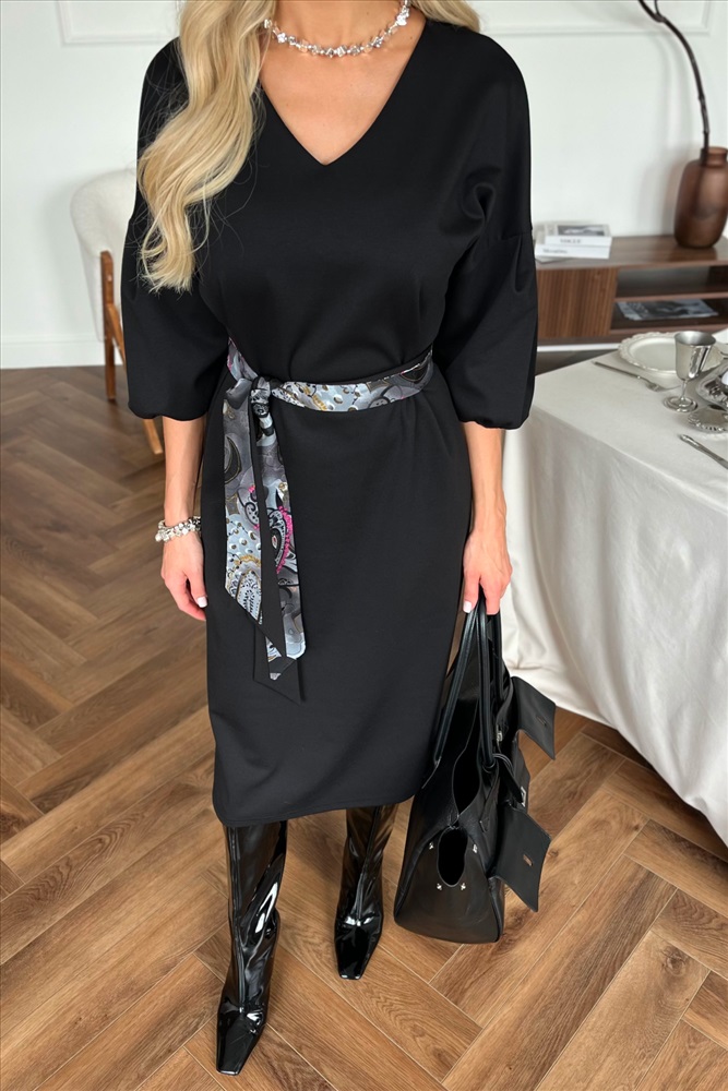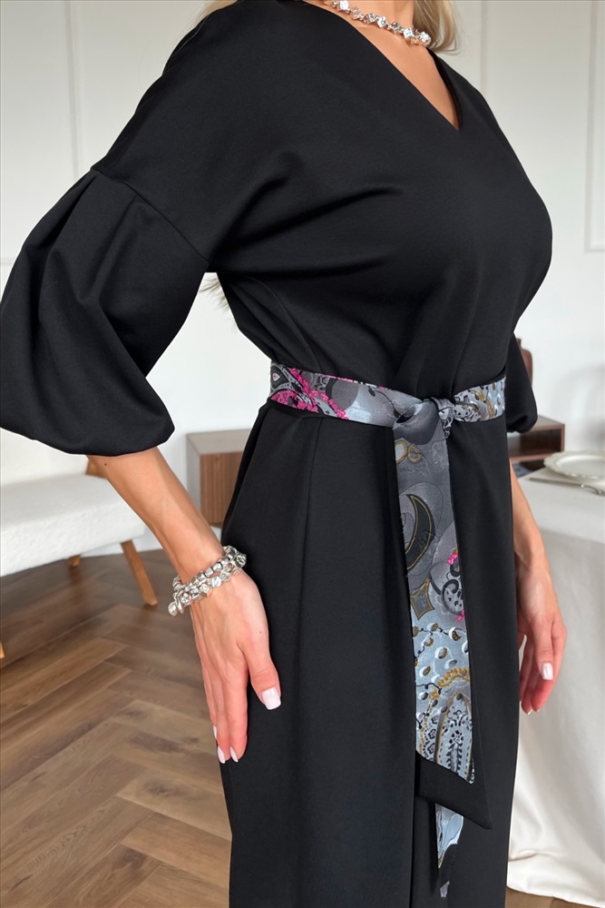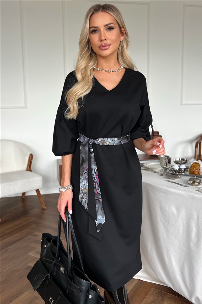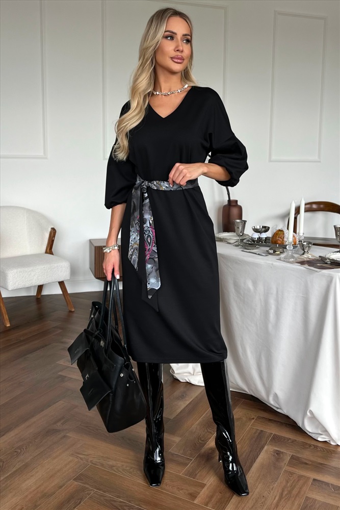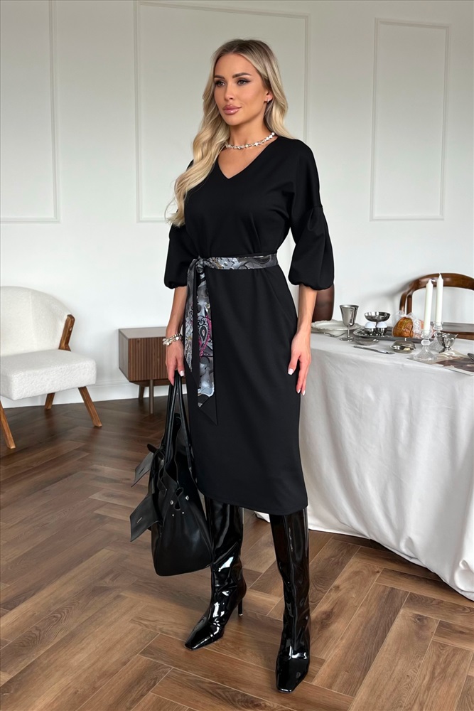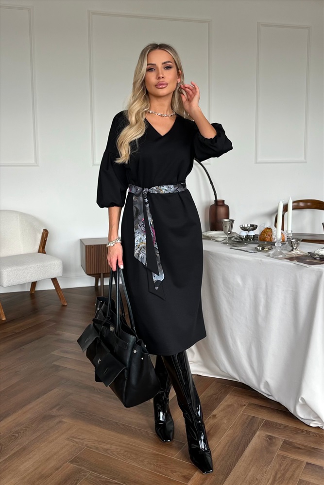 Элегантное платье прямого силуэта изготовлено из трикотажного полотна. V-образная горловина на внутренней обтачке. Втачной рукав фонарик со спущенным плечом. Низ ровный, без разрезов. Модель дополняет пояс с отделкой.
