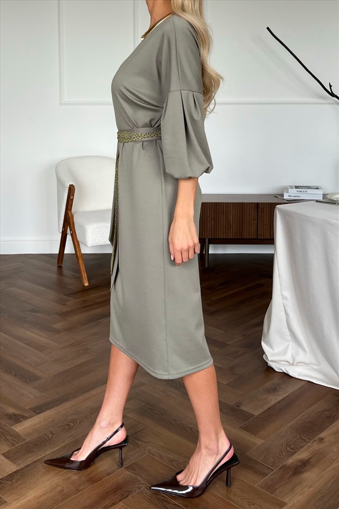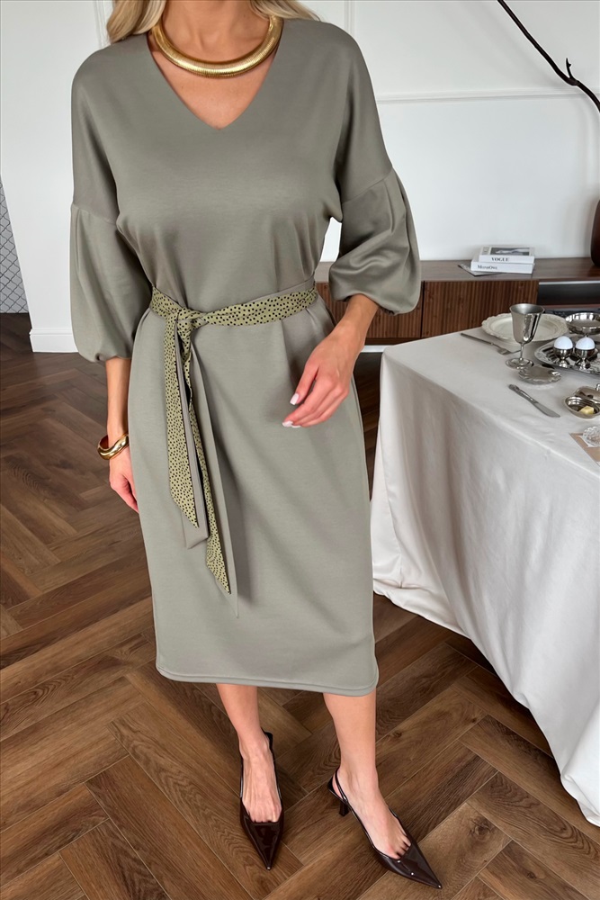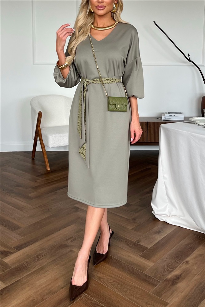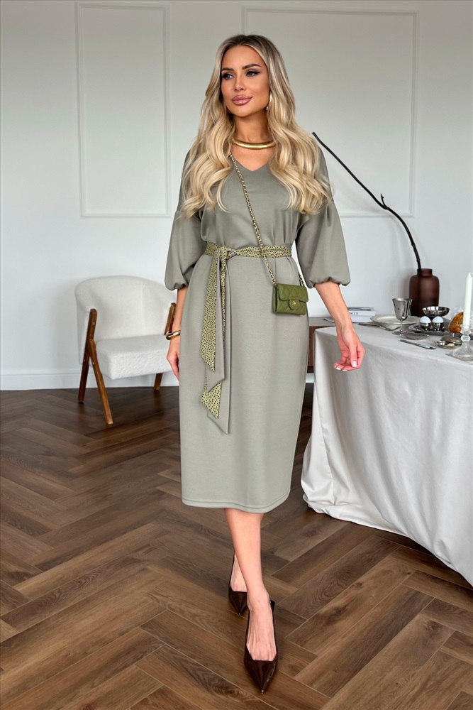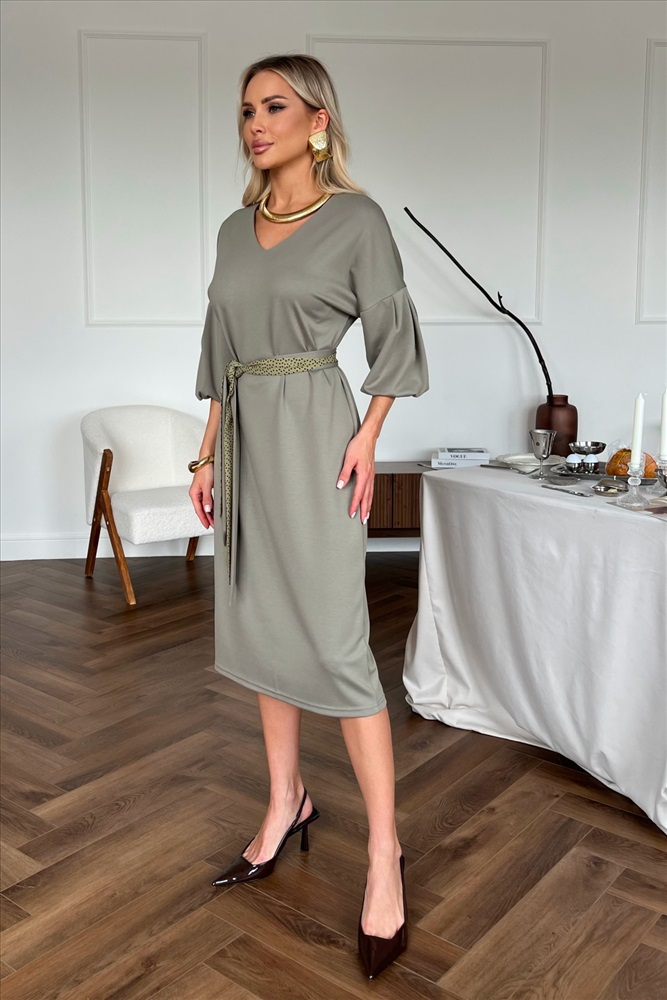 Элегантное платье прямого силуэта изготовлено из трикотажного полотна. V-образная горловина на внутренней обтачке. Втачной рукав фонарик со спущенным плечом. Низ ровный, без разрезов. Модель дополняет пояс с отделкой.