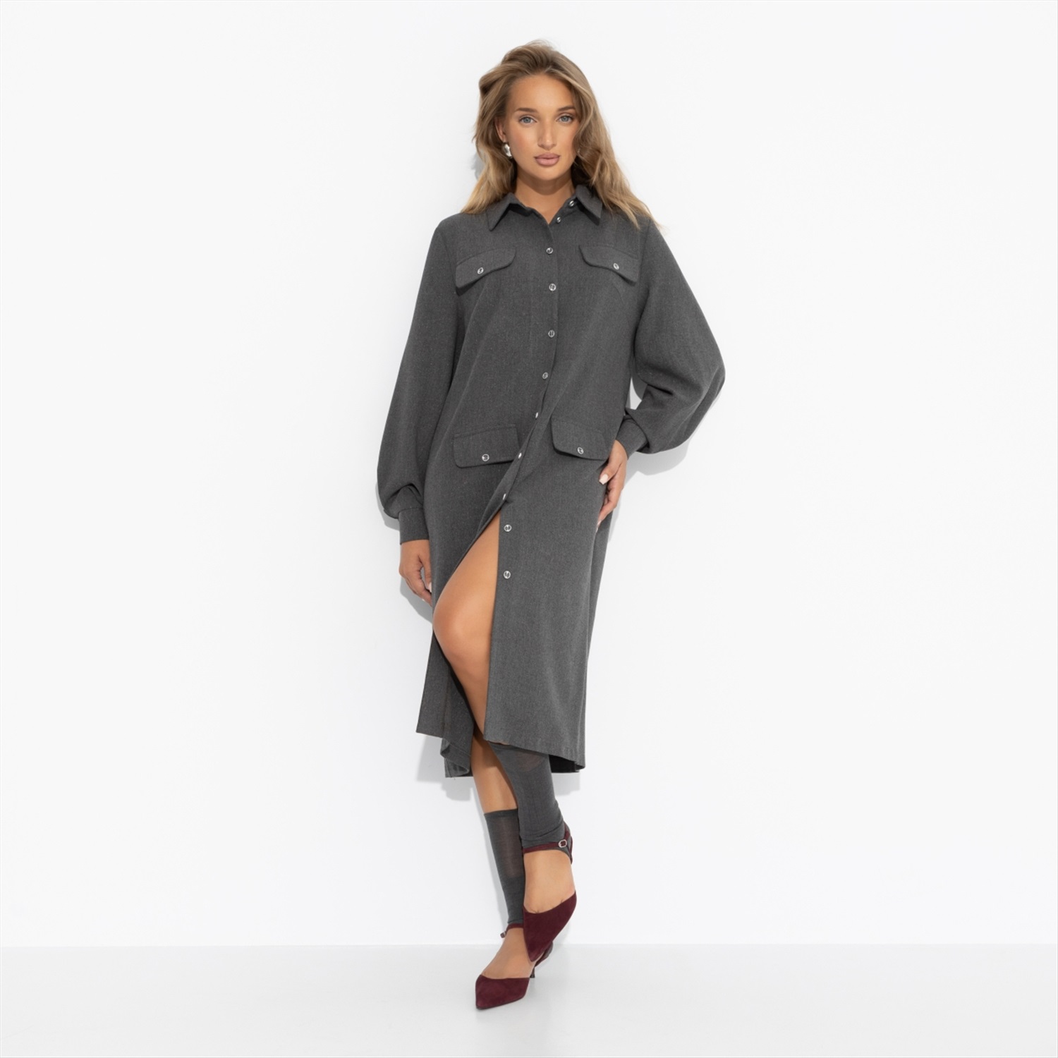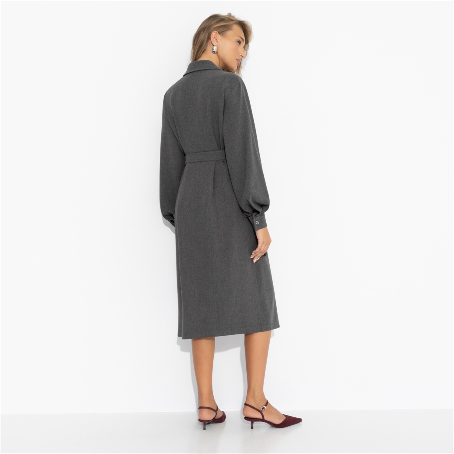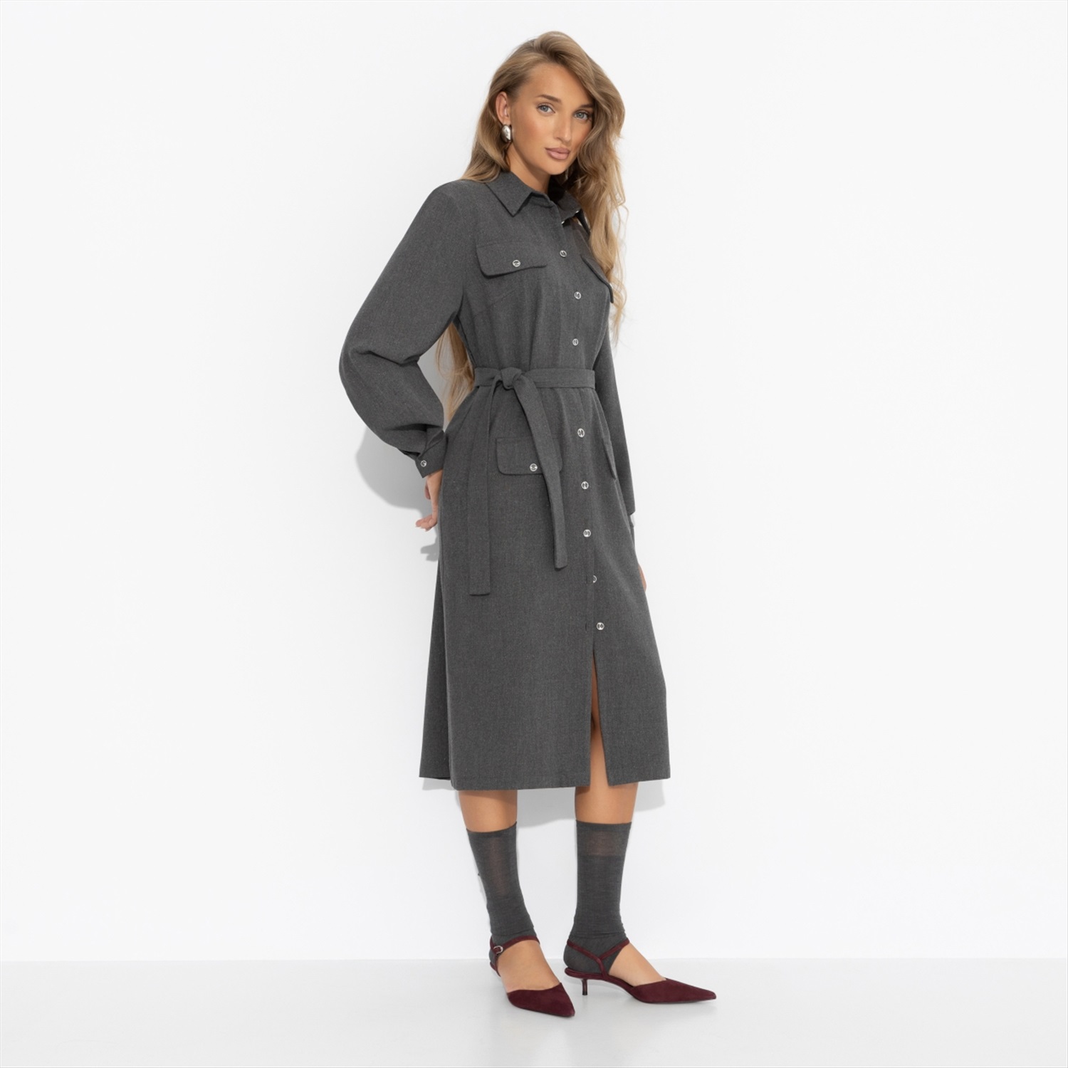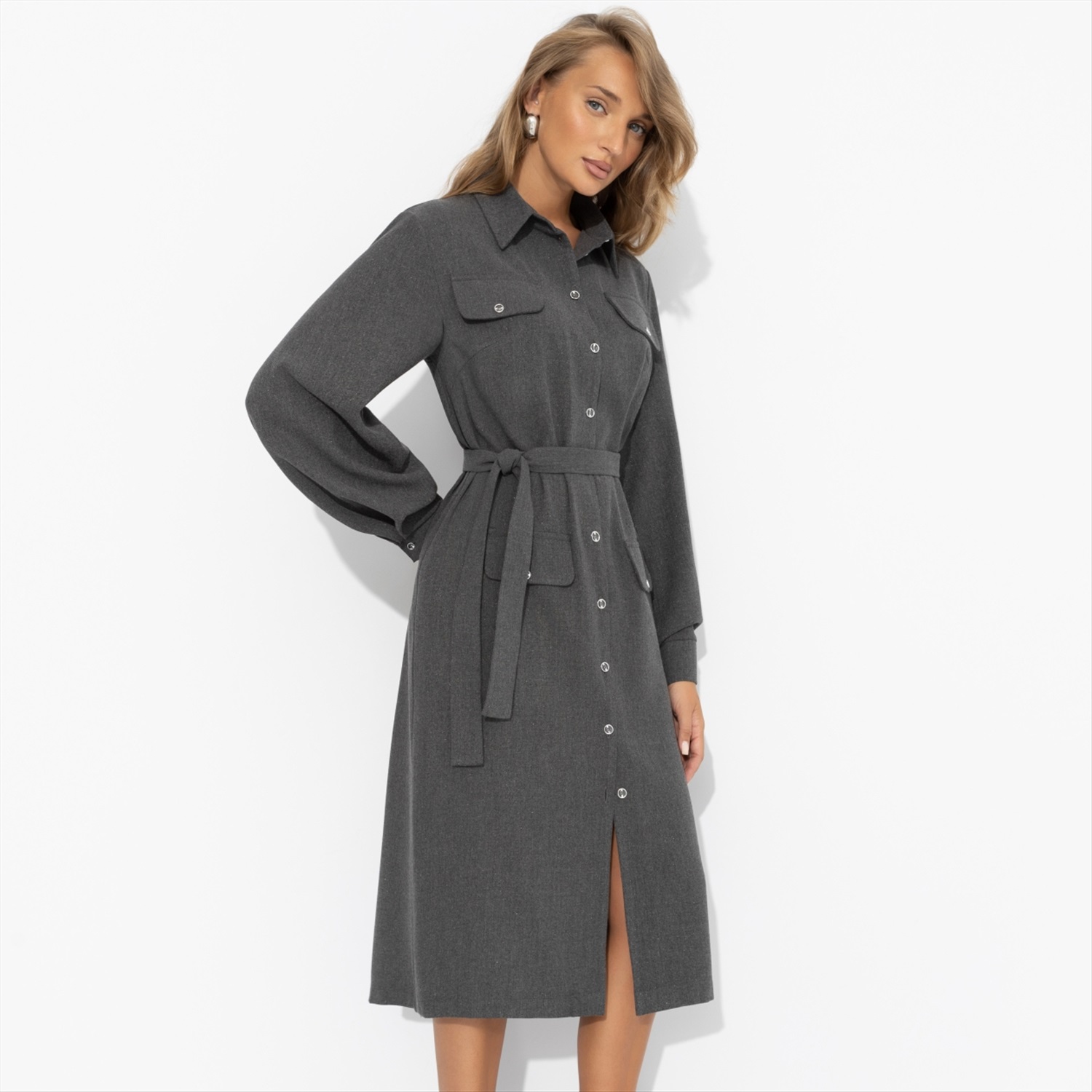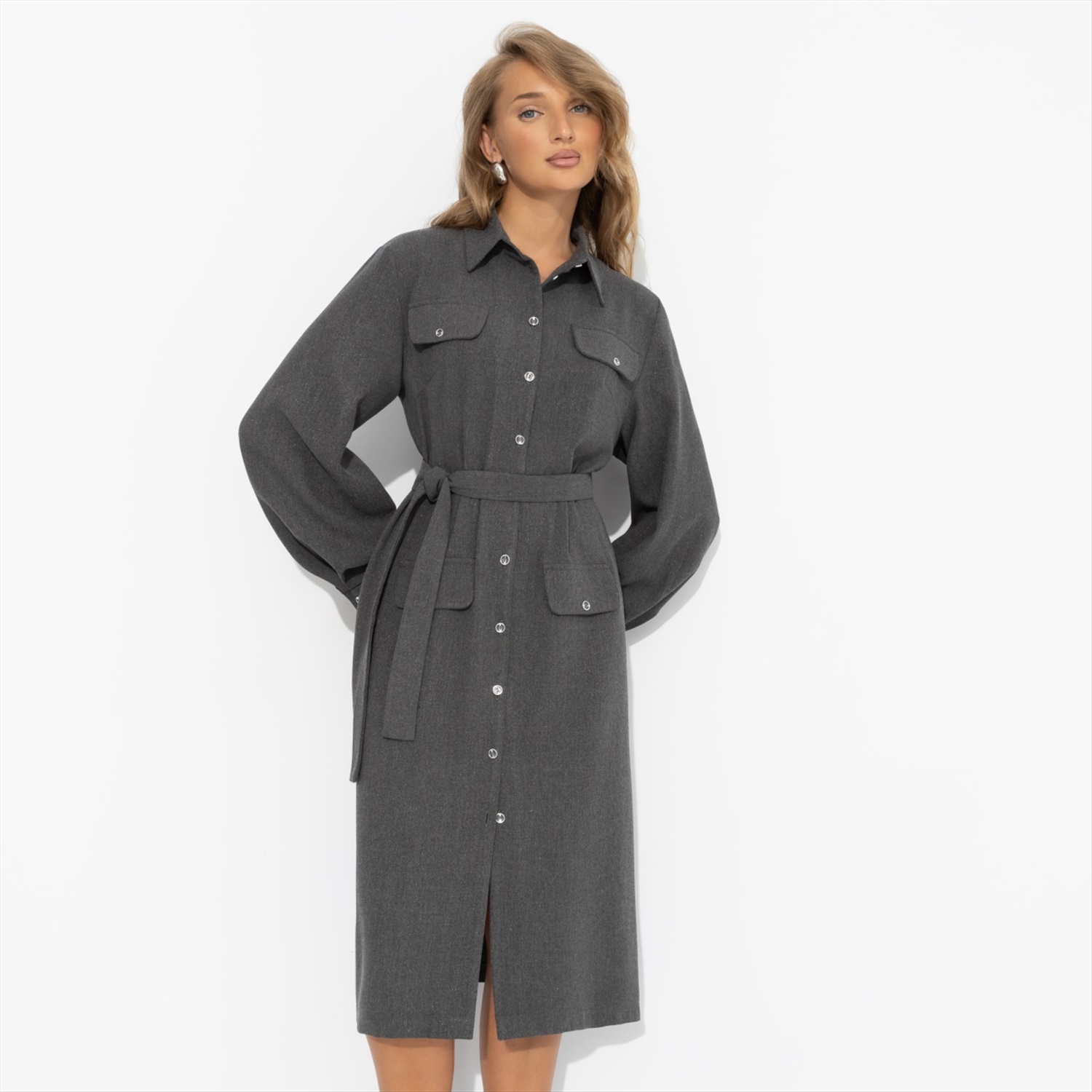 Платье-рубашка насыщенного серого оттенка от ЧАРУТТИ может стать твоим портфолио. Идеальный крой и универсальный цвет моментально приковывают взгляды и вызывают вопрос: «Где ты это взяла?». В нем ты чувствуешься настоящим архитектором стиля, чей взгляд на моду точен и безупречен. Именно после таких вещей подруги умоляют составить им шопинг-лист. Платье длиной миди. Застегивается на пуговицы. Имитация карманов. Есть пояс в тон изделия в комплекте.